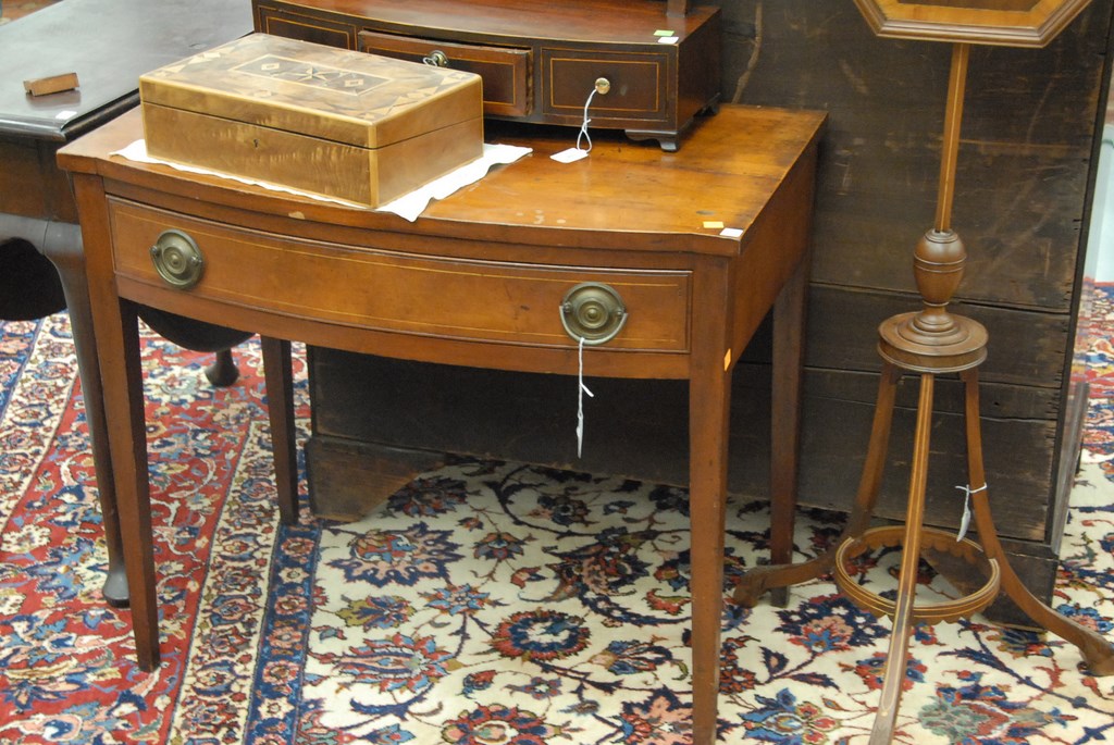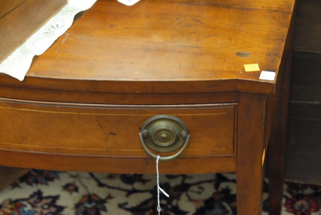 Lot 313: Federal cherry server having inlaid top with bowed front and one long drawer set on square tapered legs, Connecticut circa 1790-1810…