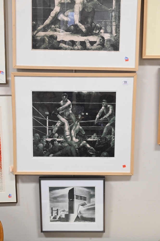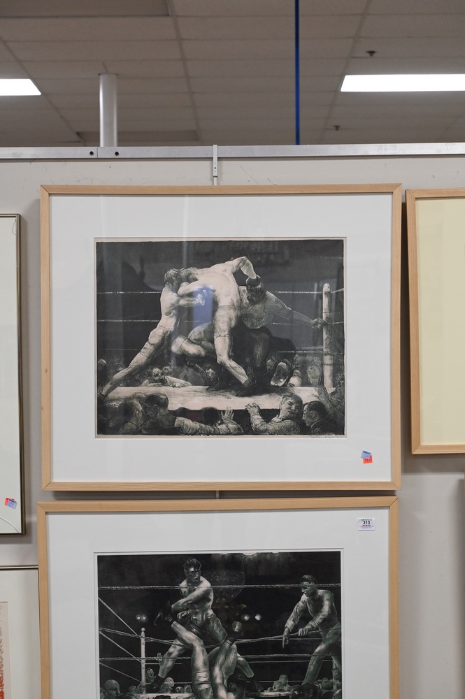 Lot 313: Four Framed Pieces, to include George Bellows framed print, A. Stag at Sharkey’s, 18″ x 22″; Jack Dempsey vs. Luis Angel Firpo, 18″ …