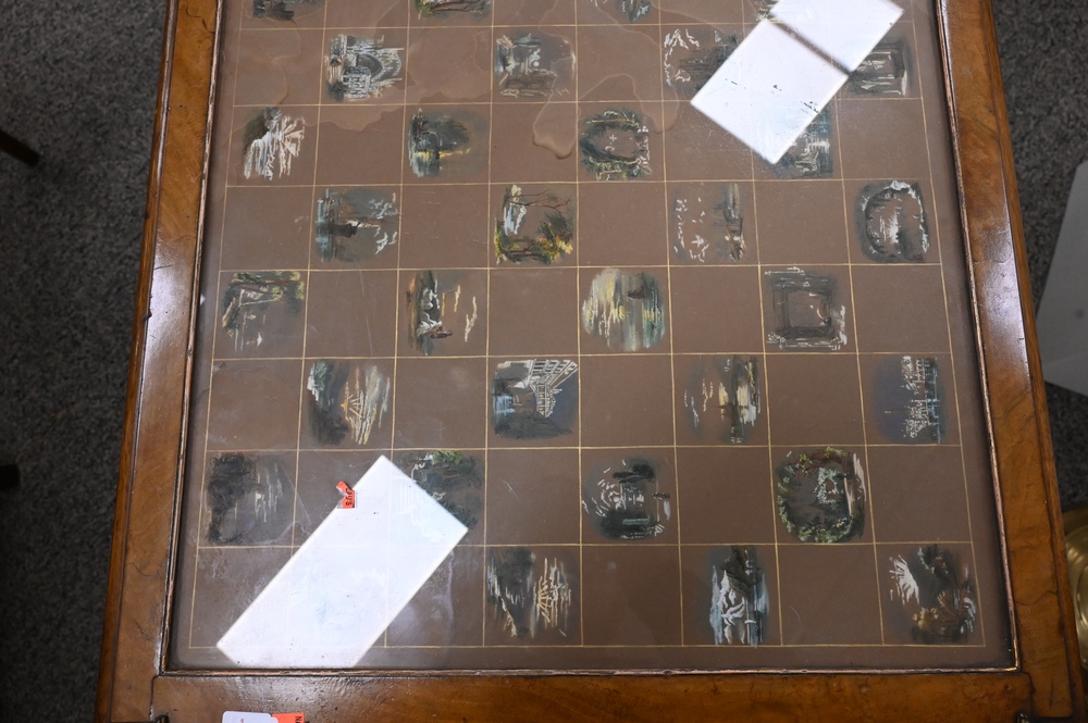 George IV Mahogany Table, having hand painted scenes under glass and one drawer with gilt highlights, height 29 inches, top 21″ x 28″.