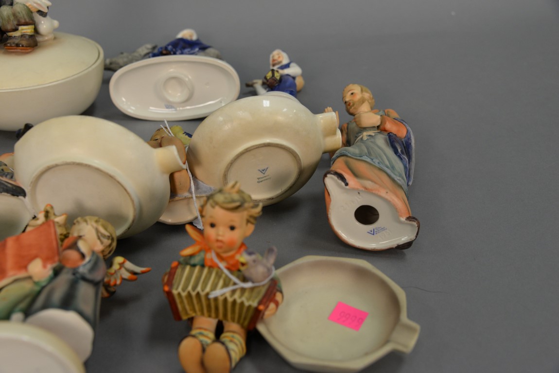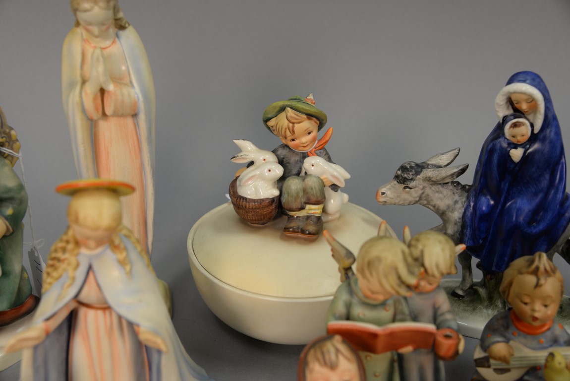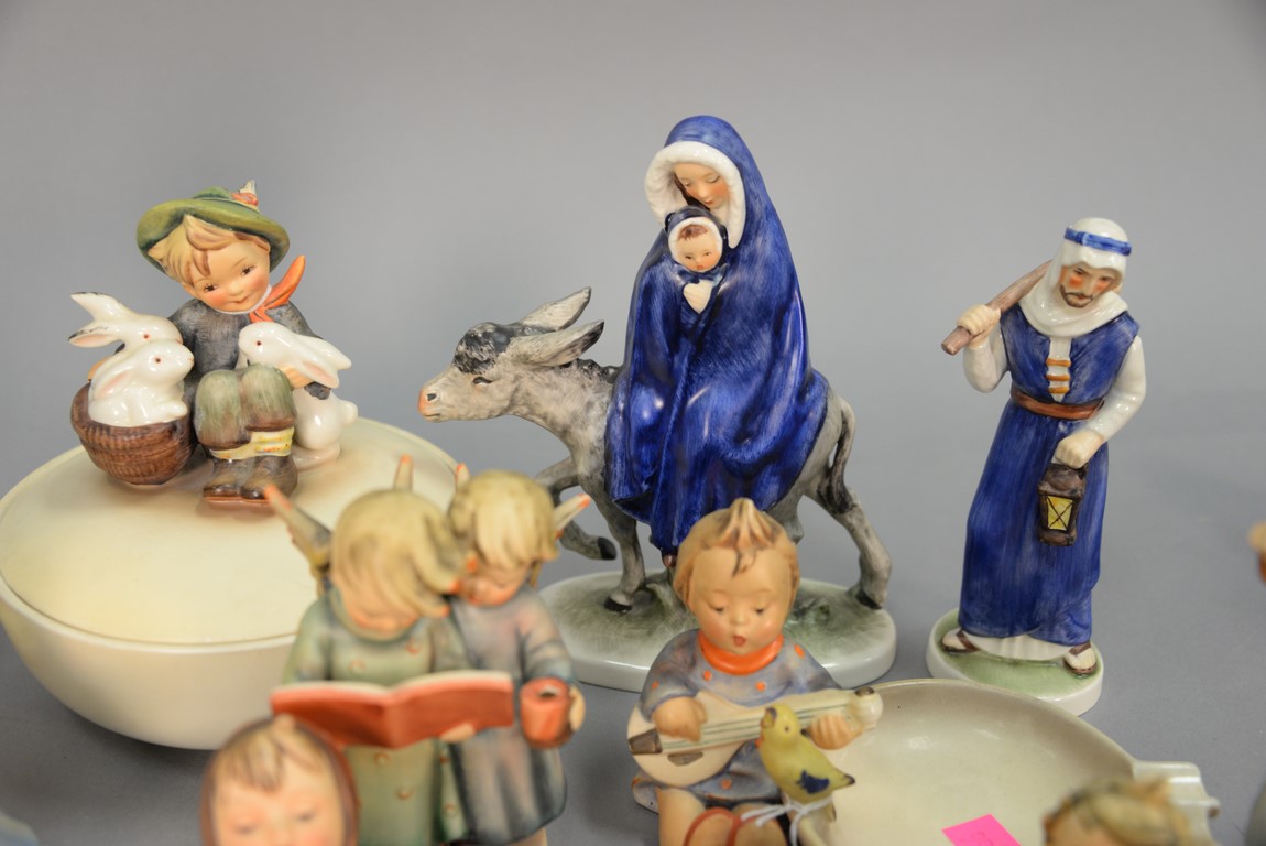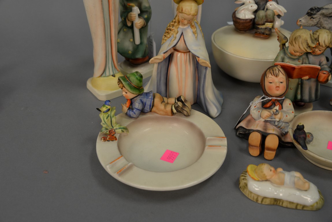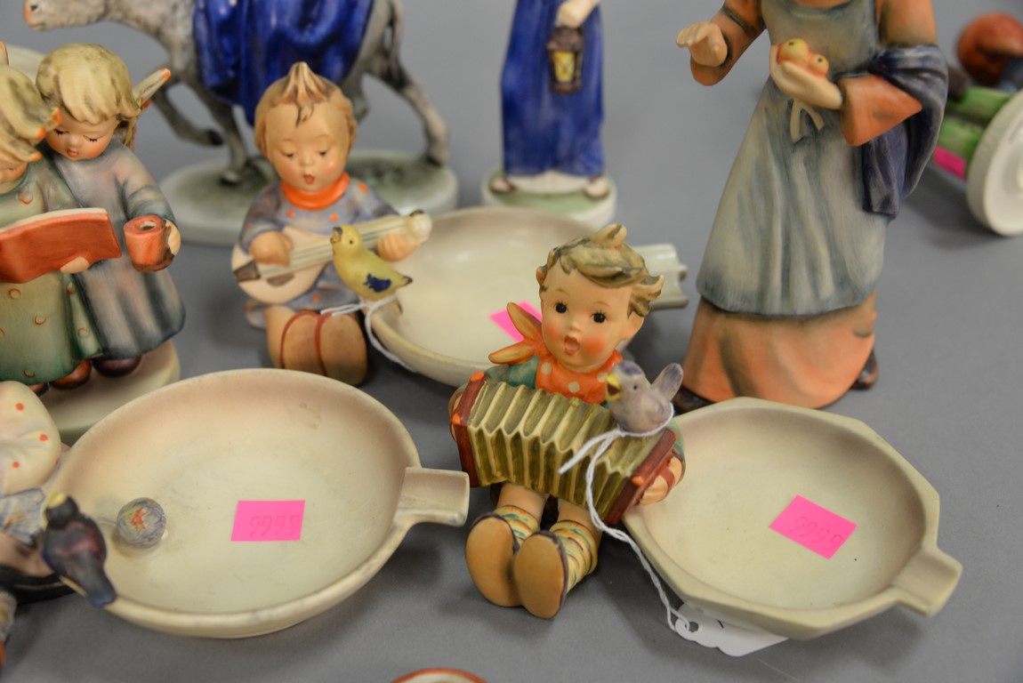 Group of Fifteen Hummels including four ashtrays: Joyful #33, Boy With Bird #166, Let’s Sing #114, and Happy Pastime #62, ten are religious. average ht. 3 1/ 2in.