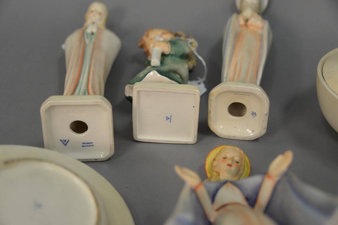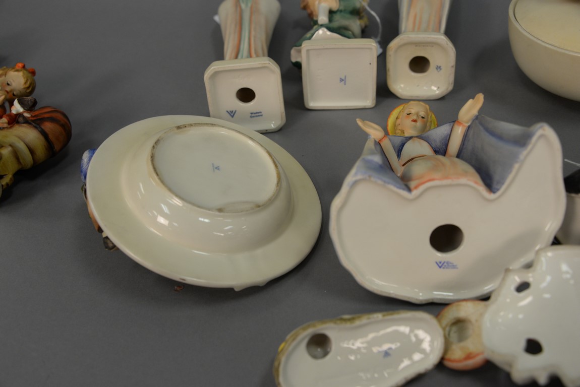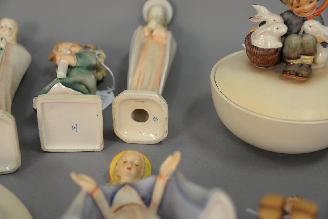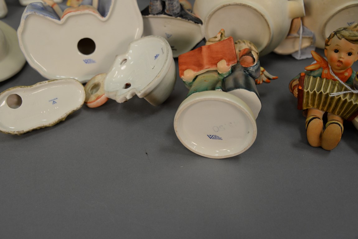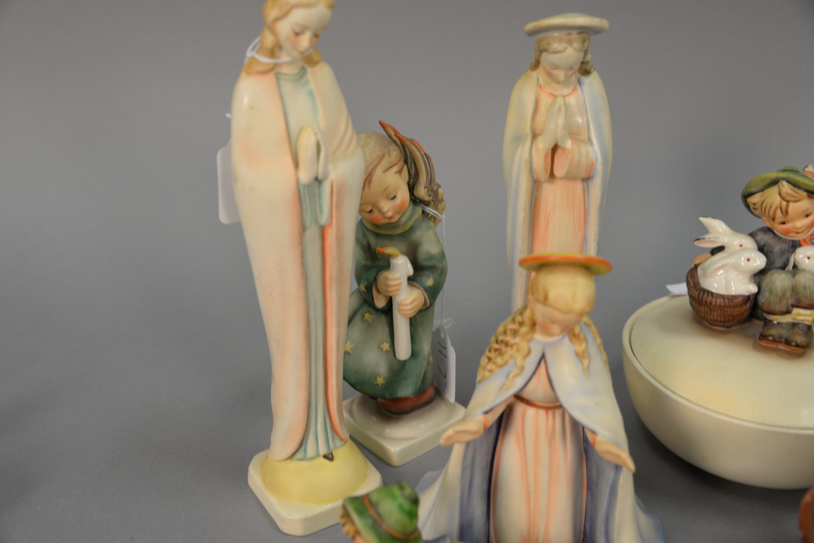 Group of Fifteen Hummels including four ashtrays: Joyful #33, Boy With Bird #166, Let’s Sing #114, and Happy Pastime #62, ten are religious. average ht. 3 1/ 2in.