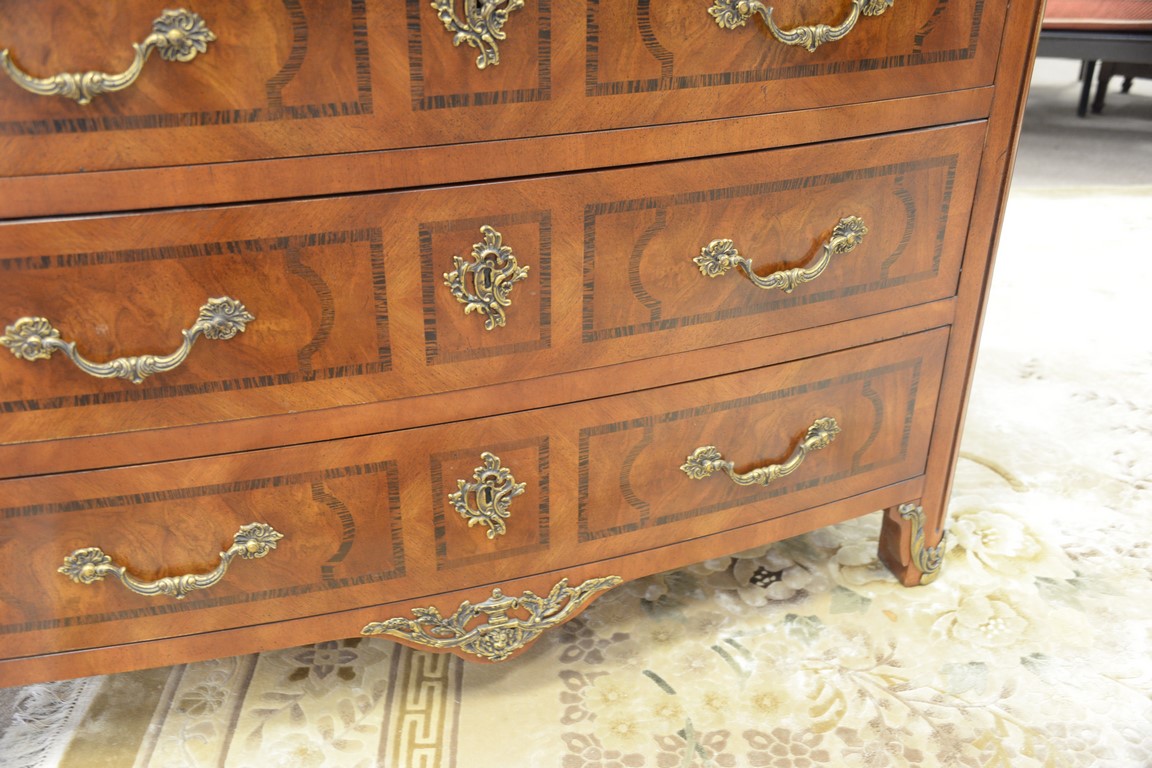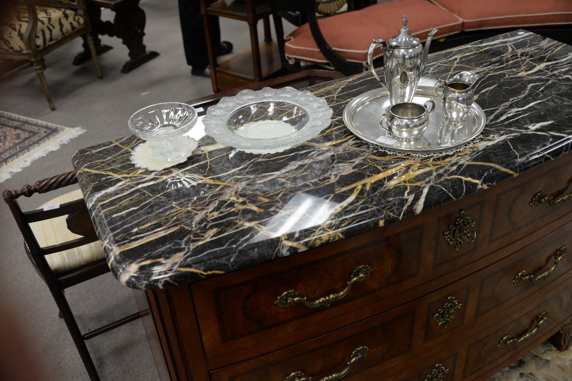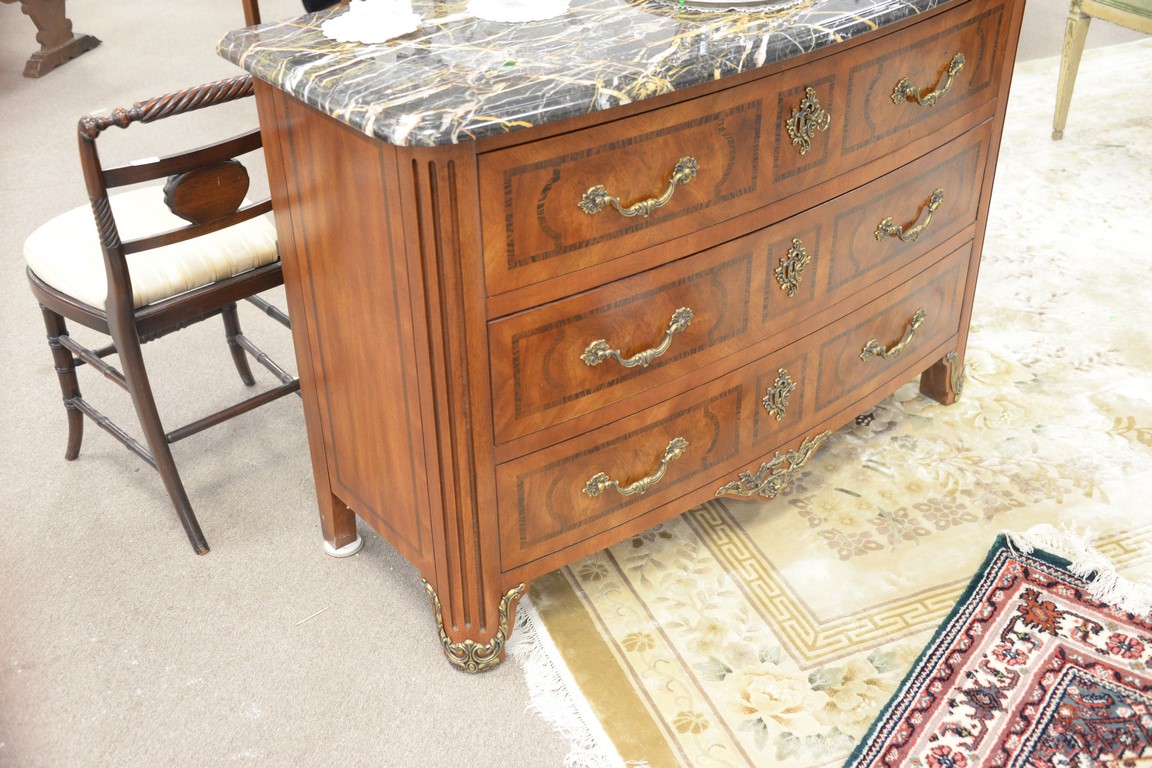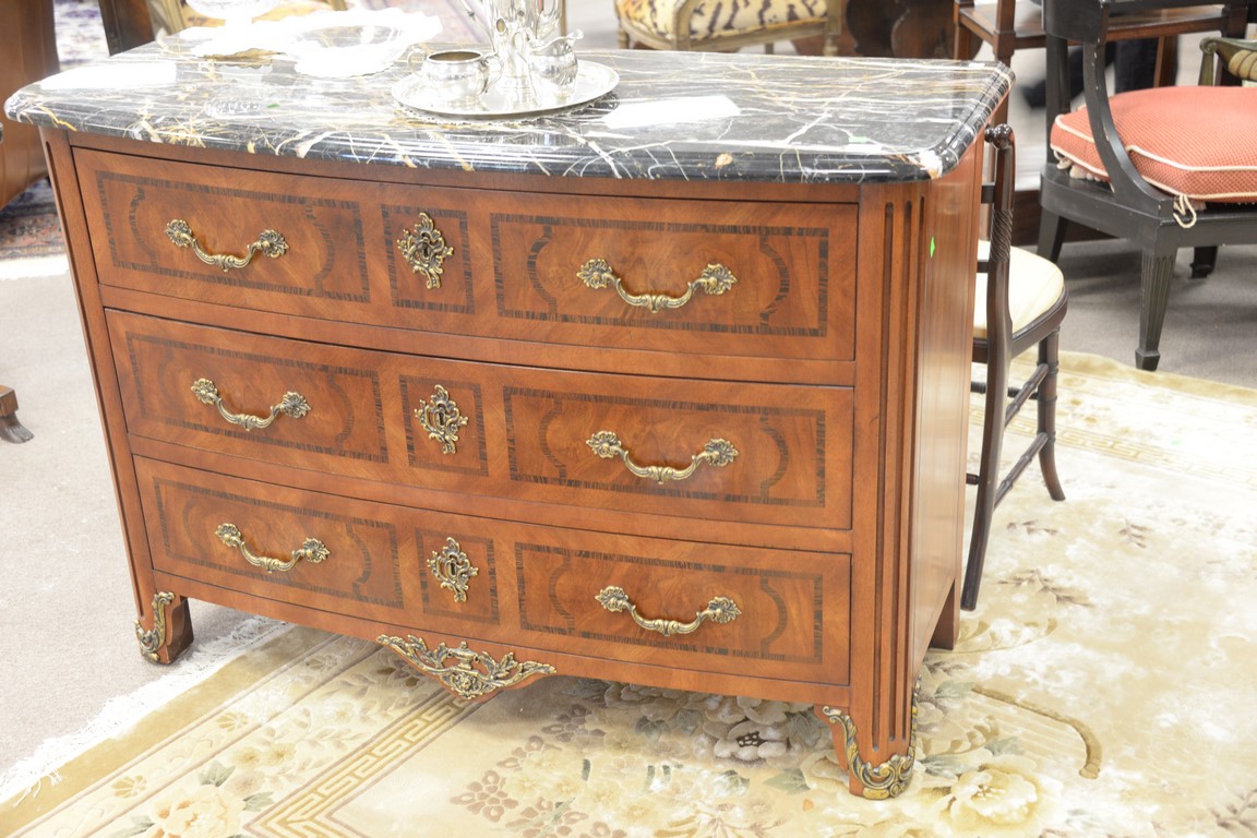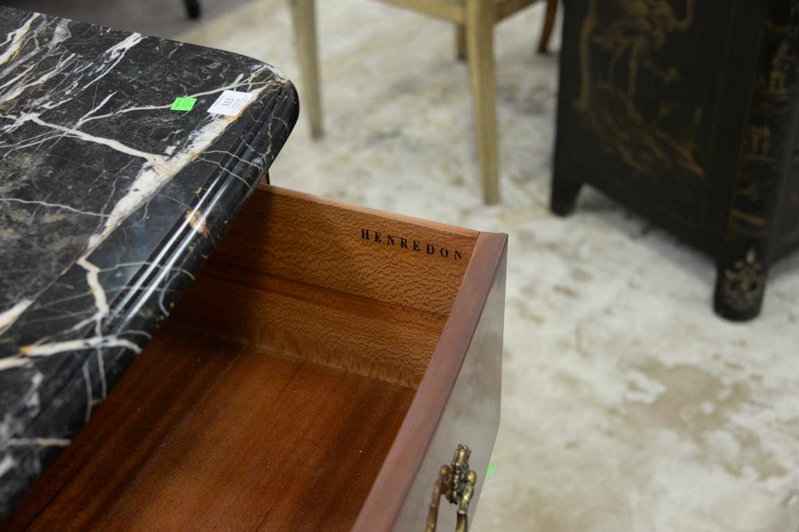Lot 313: Henredon French style marble top three drawer chest with black marble top, signed in drawer: Henredon. ht. 36in., wd. 51in., dp. 21in.