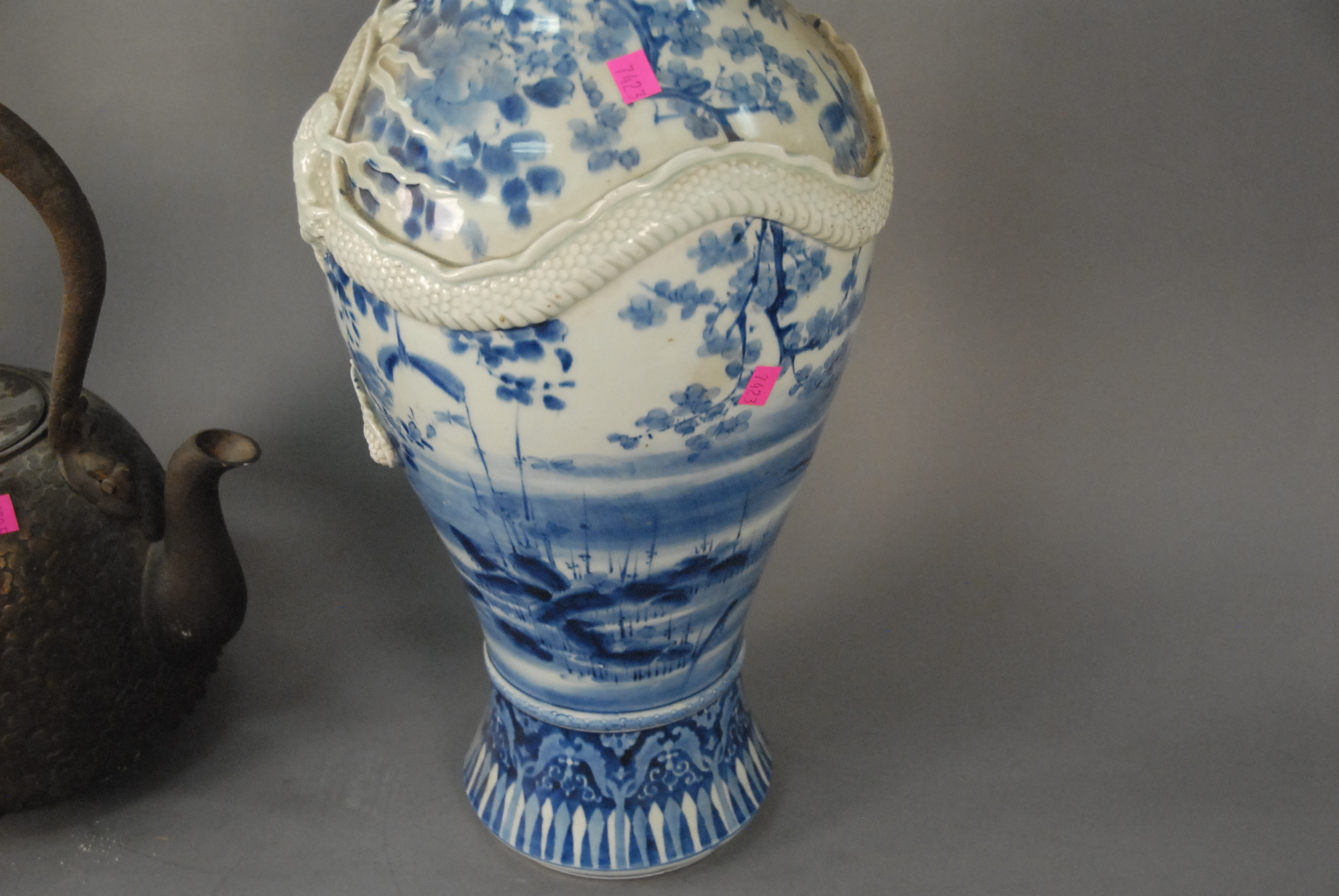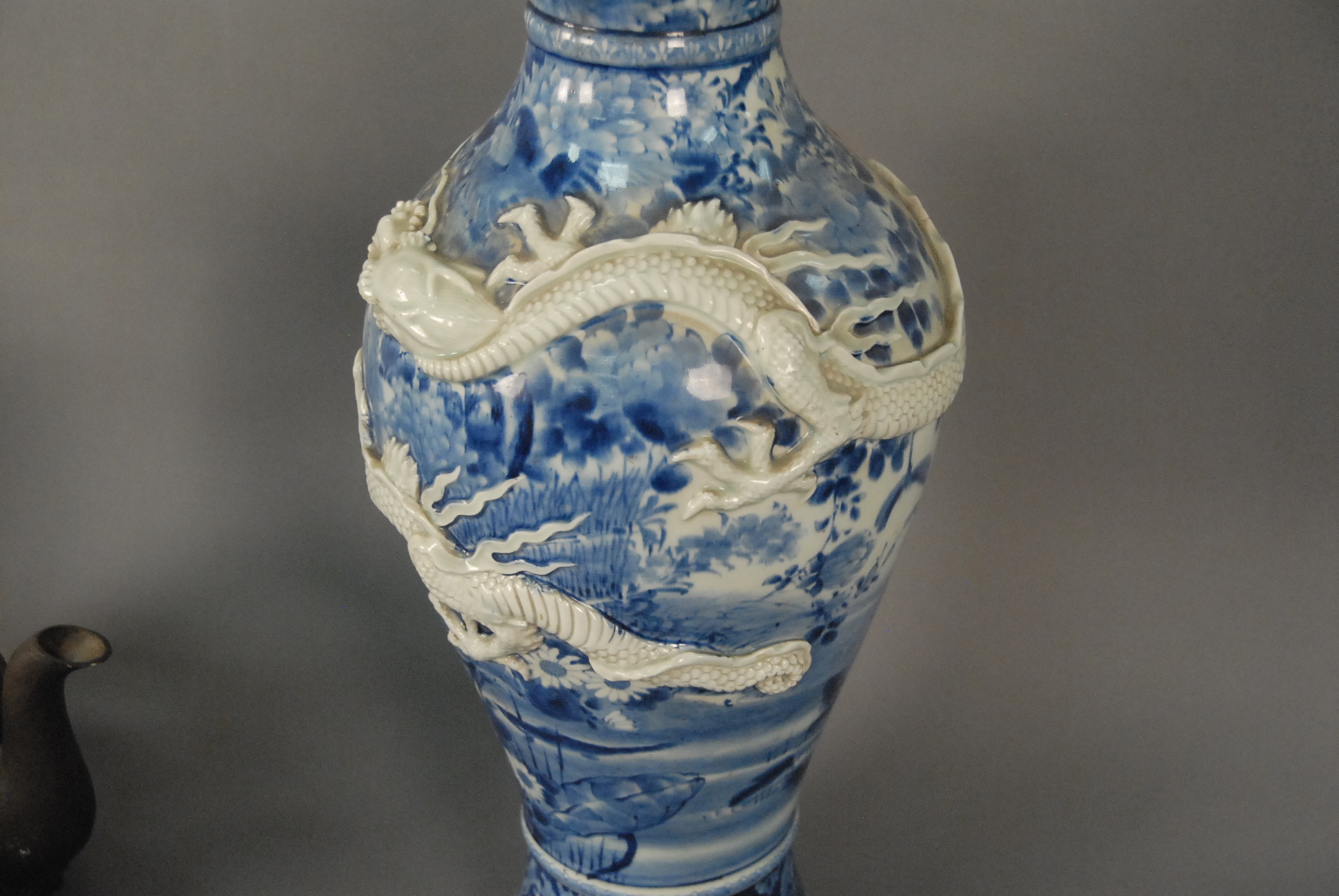 Lot 313: Large blue and white dragon vase with molded four claw dragon and flared to rim. ht. 24 1/2 in.