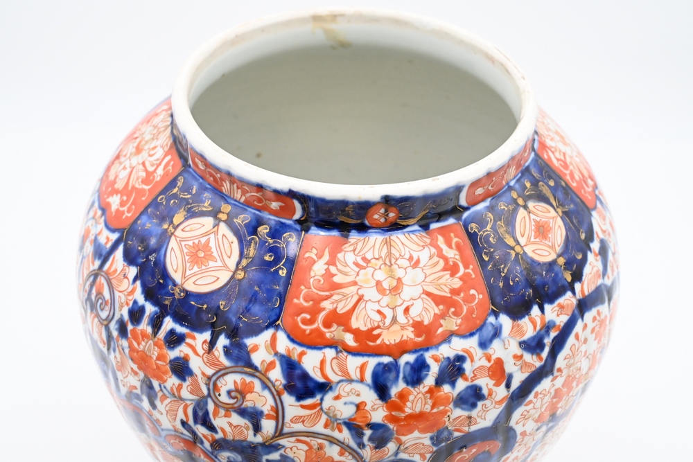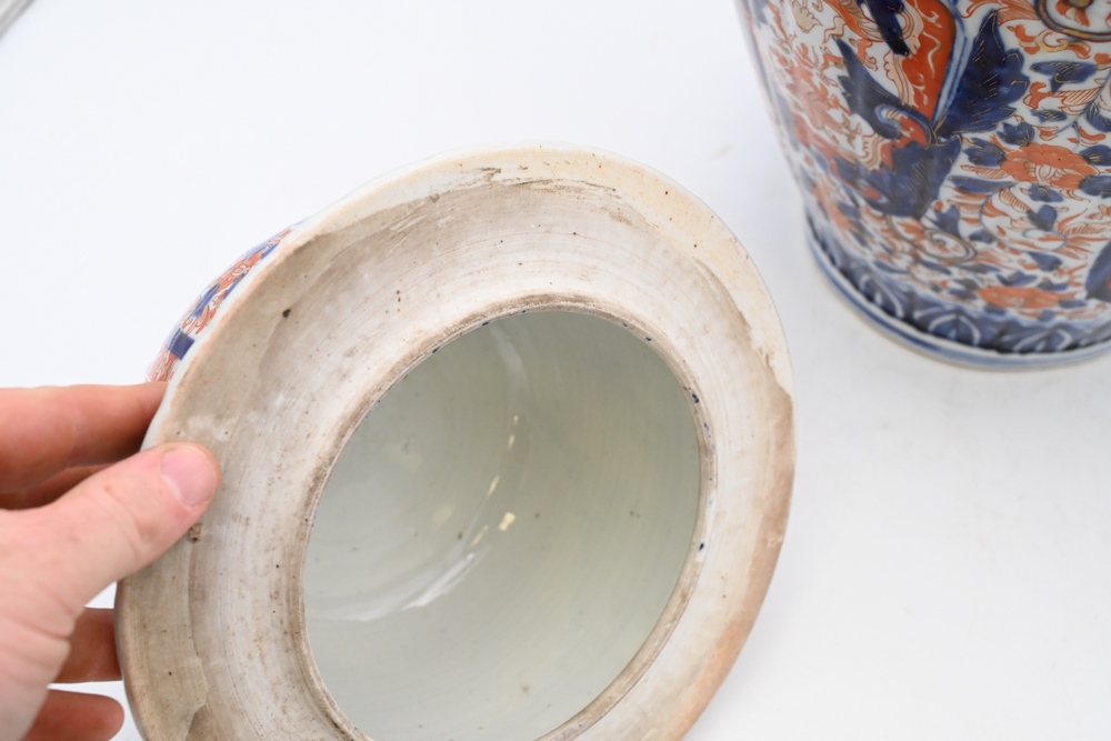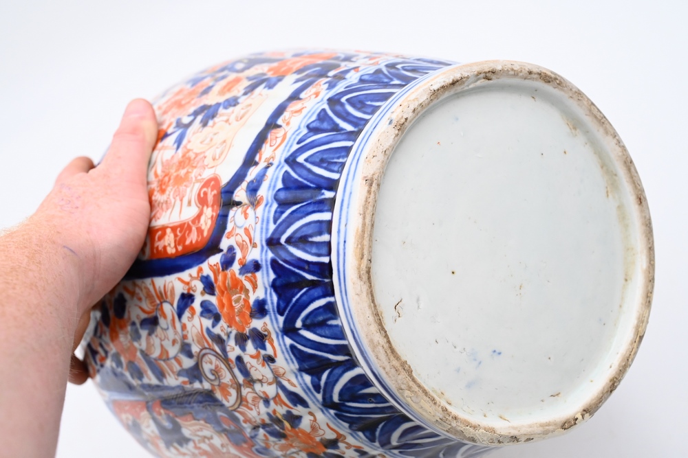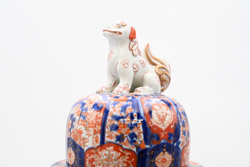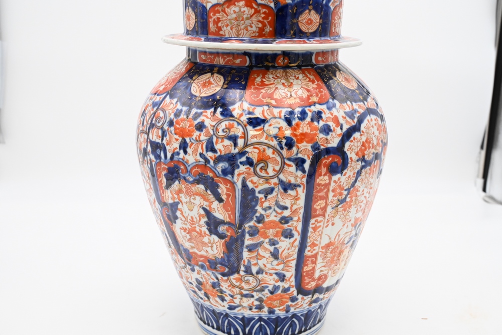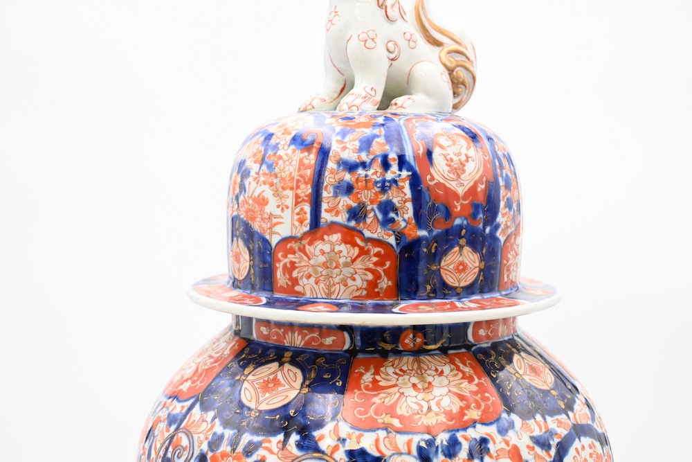 Lot 313: Large Japanese Imari Porcelain Jar having foo dog finial on dome shaped cover on baluster form vase, painted with garden scenes height 23 inches Provenance: From a private New York City collection.