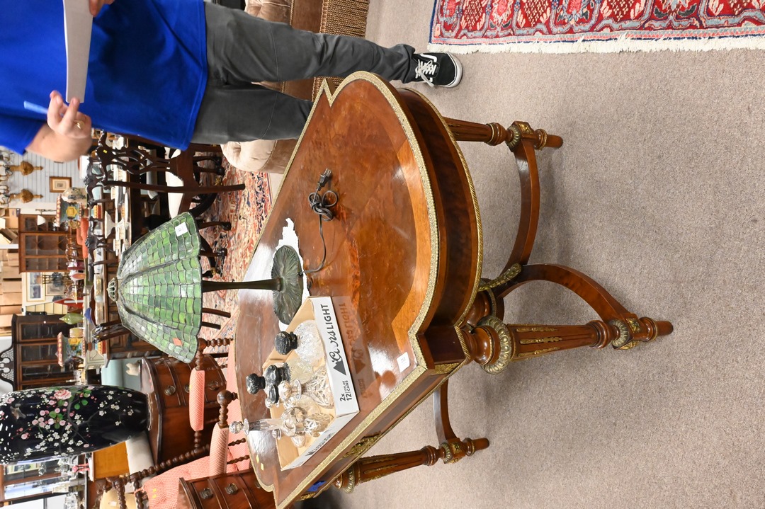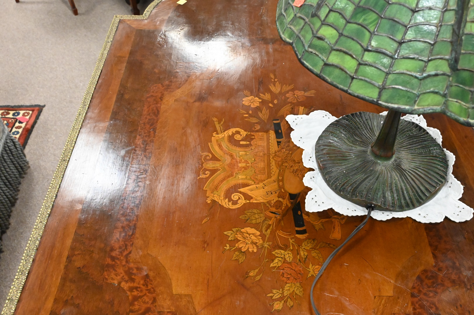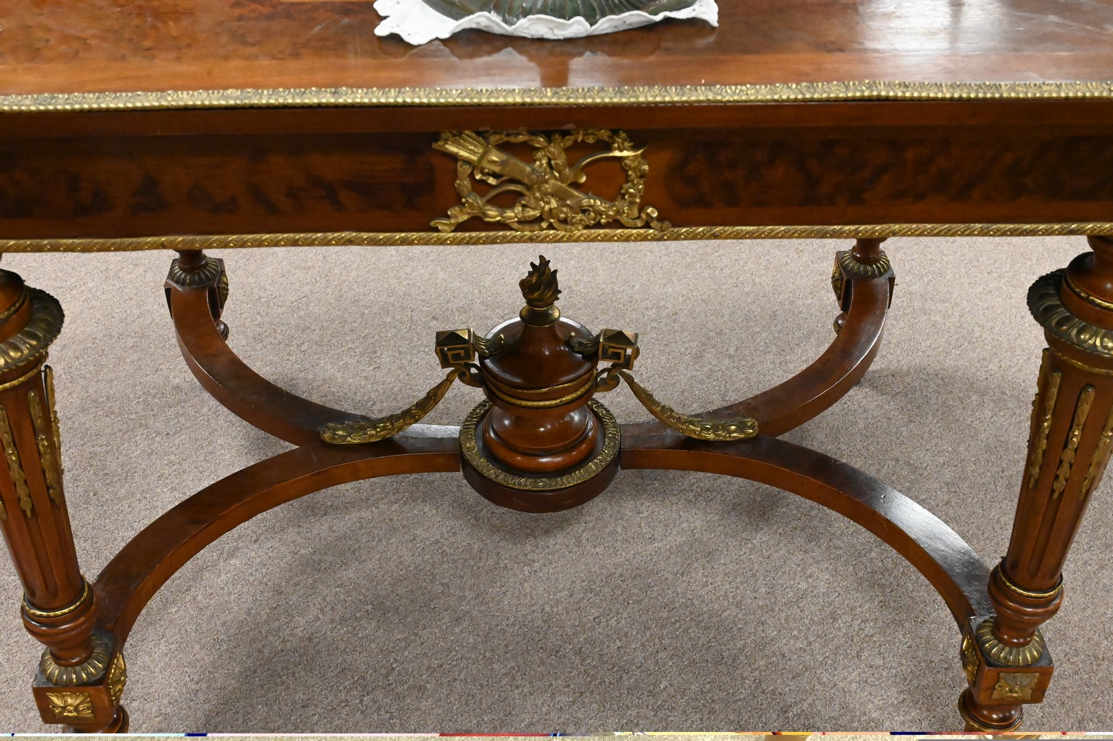 Louis XVI Style Inlaid Center Table, having armalu mounts, x stretcher base with urn pediment, height 29 inches, top 28 1/2″x 51 1/2″.