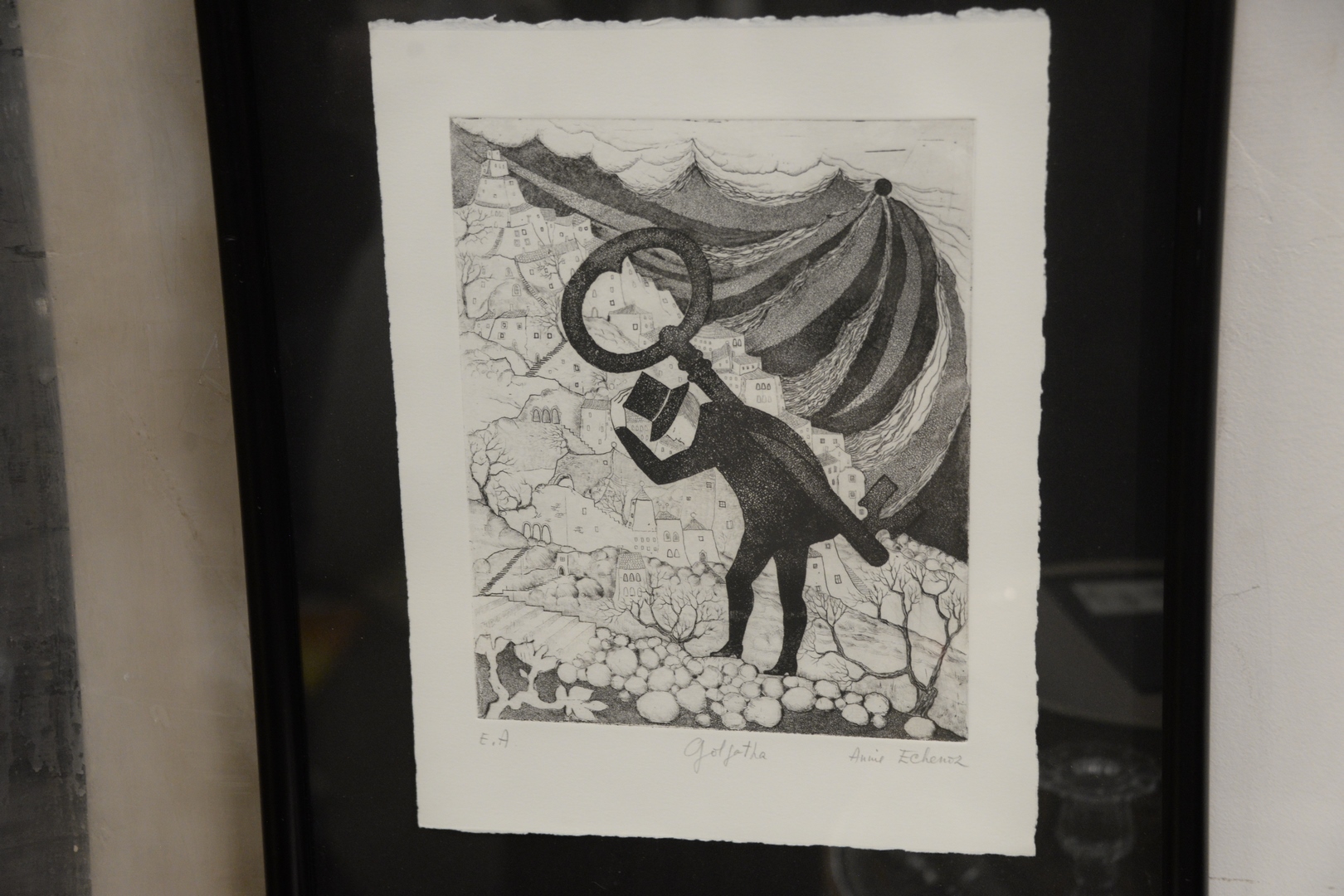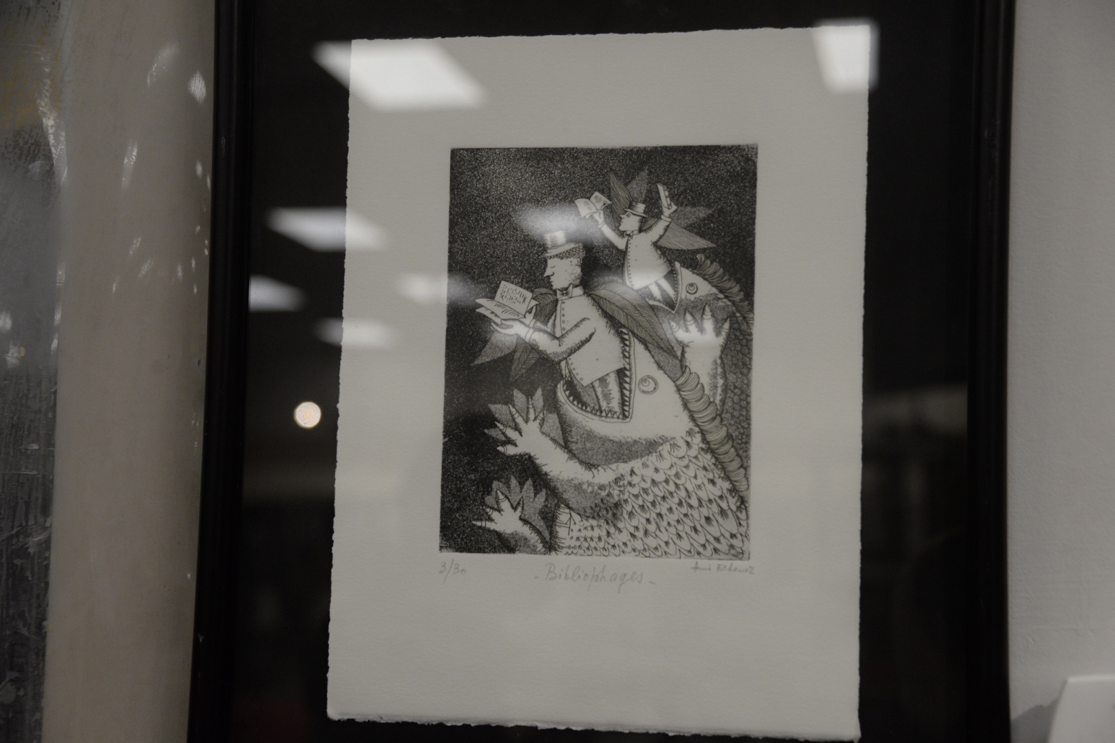Seven Piece Group, to include three Annie Echenoz (French, 20th Century) “Bibliophagist”, “Bibliophiles”, and “Golgotha” engravings on paper (each), each signed, titled, and numbered in lower margin, 13″ x 9-1/2″ (sheet, each); along with a group of four, small, Sandra Dawson collages, each signed verso, two having Gallery A. Chicago labels verso, framed, overall 8-1/2″ x 8-1/2″.