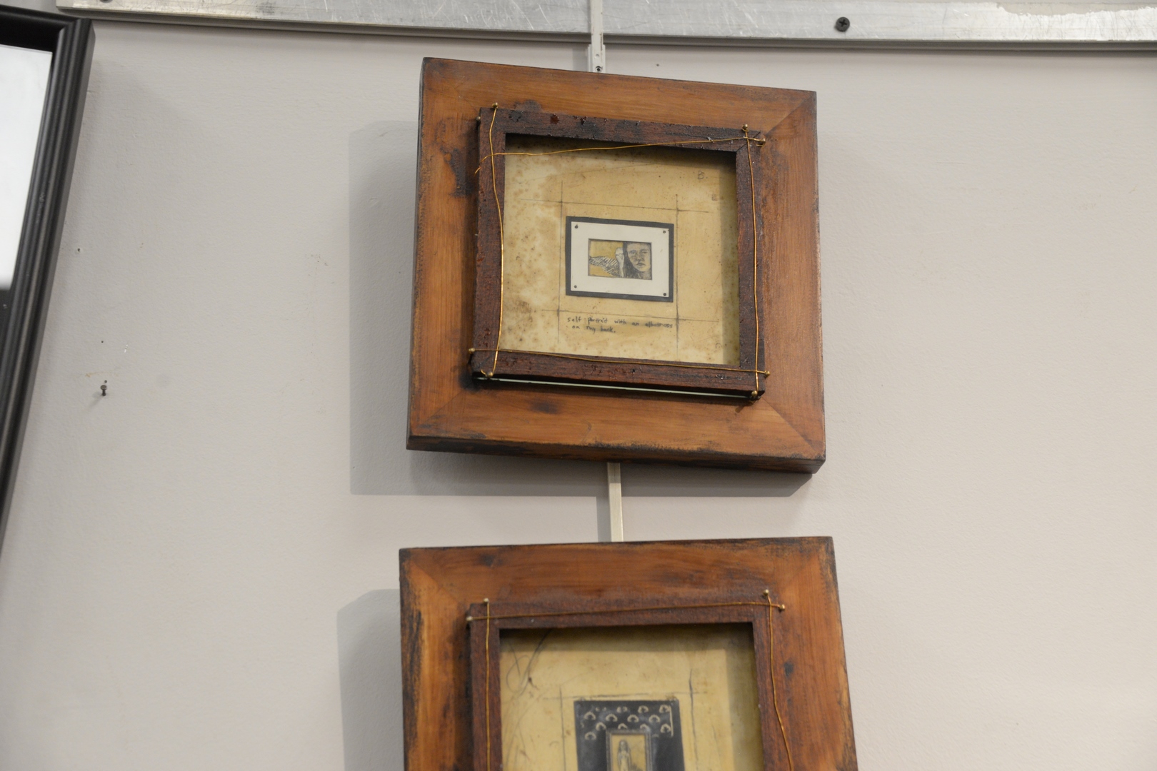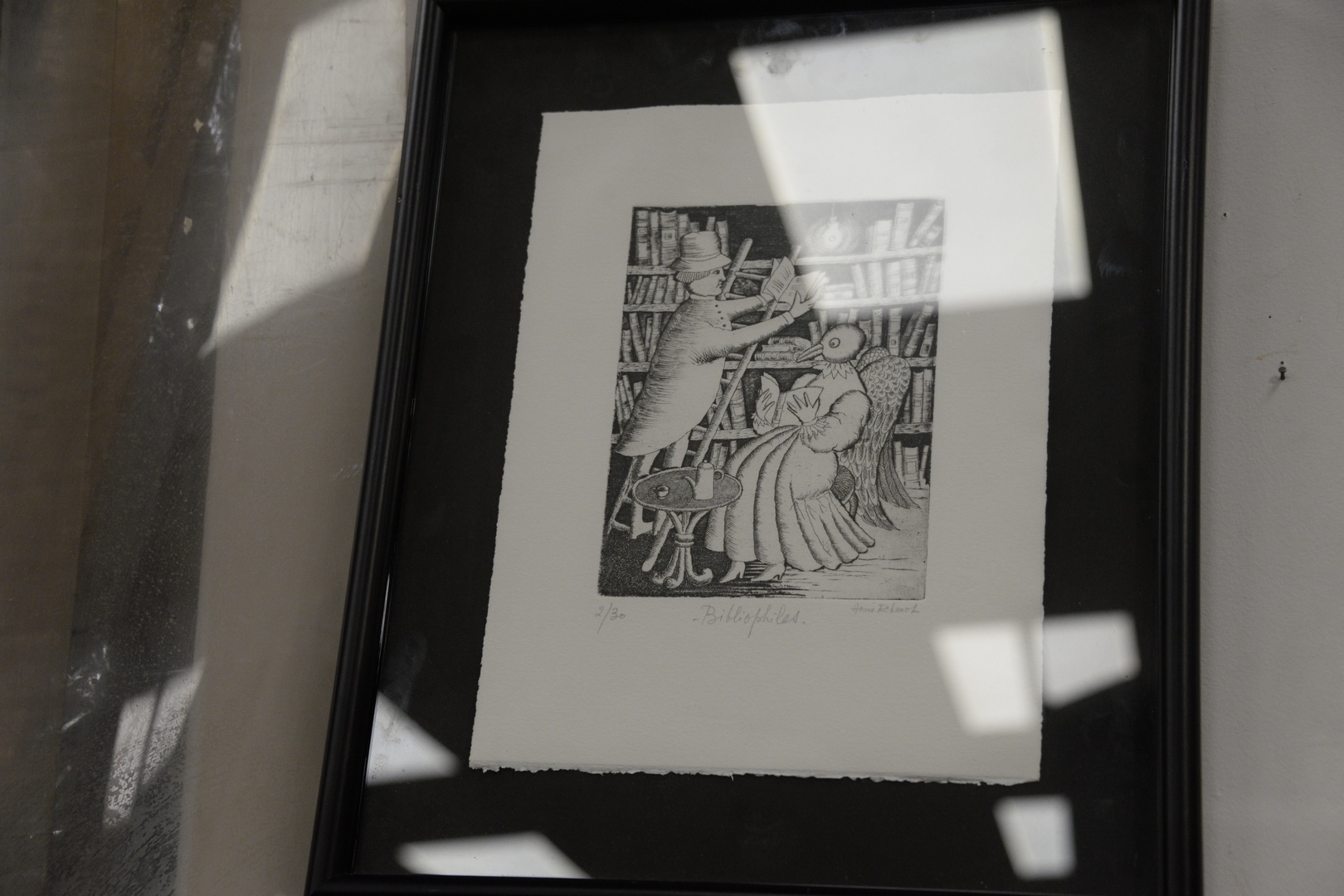 Lot 313: Seven Piece Group, to include three Annie Echenoz (French, 20th Century) “Bibliophagist”, “Bibliophiles”, and “Golgotha” engravings on paper (each), each signed, titled, and numbered in lower margin, 13″ x 9-1/2″ (sheet, each); along with a group of four, small, Sandra Dawson collages, each signed verso, two having Gallery A. Chicago labels verso, framed, overall 8-1/2″ x 8-1/2″.