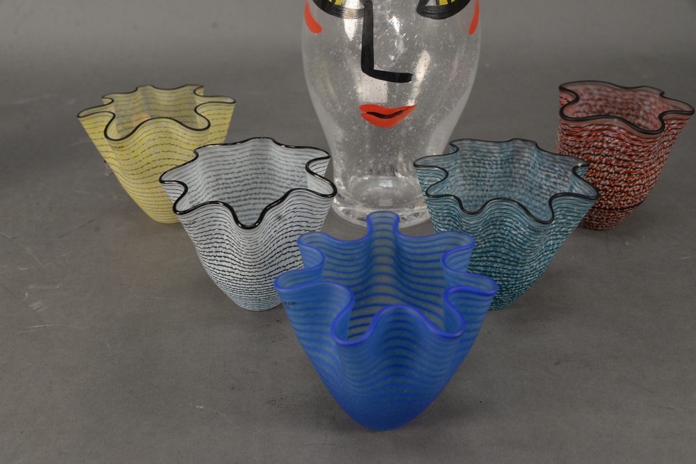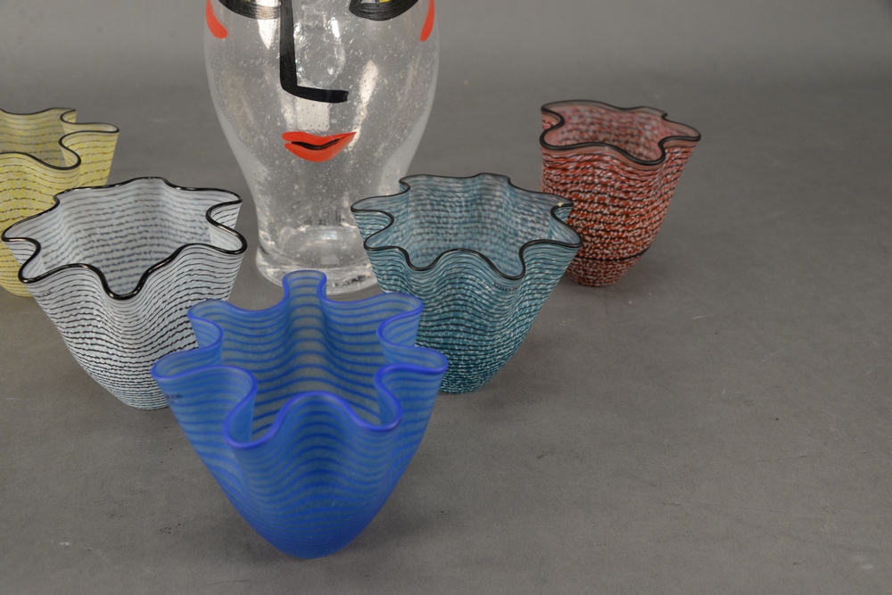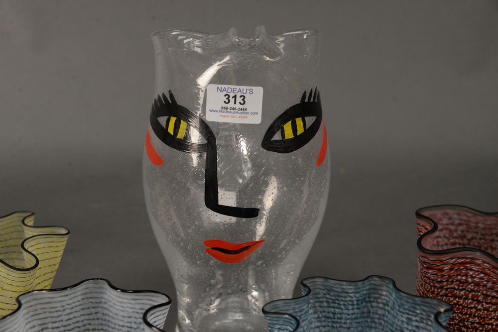 Lot 313: Six Piece Kosta Boda Ulrica Hydman-Vallien Lot, to include five freeform bowls having scalloped edges along with painted glass pitch…