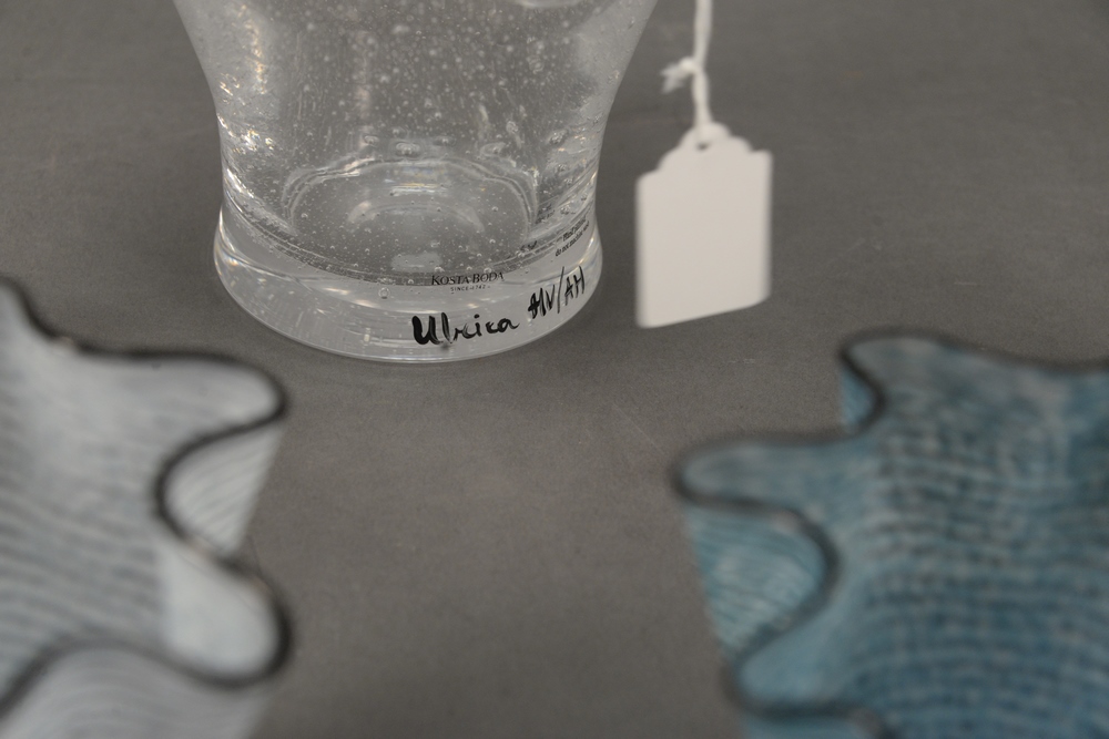 Six Piece Kosta Boda Ulrica Hydman-Vallien Lot, to include five freeform bowls having scalloped edges along with painted glass pitcher, each signed, pitcher height 11 inches.