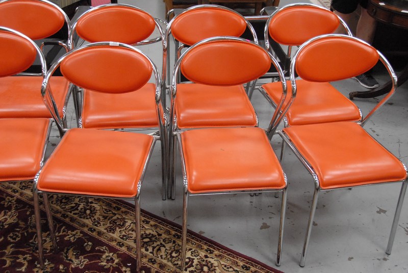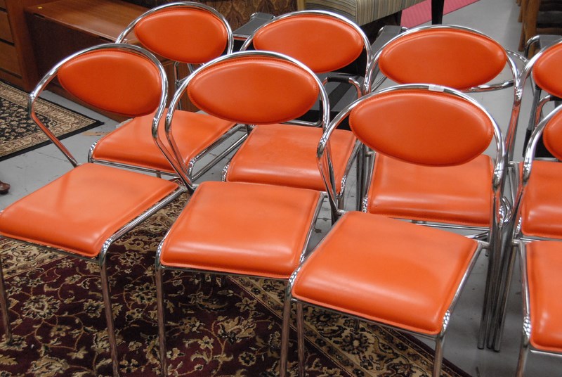 Ten orange leather and chrome chairs.