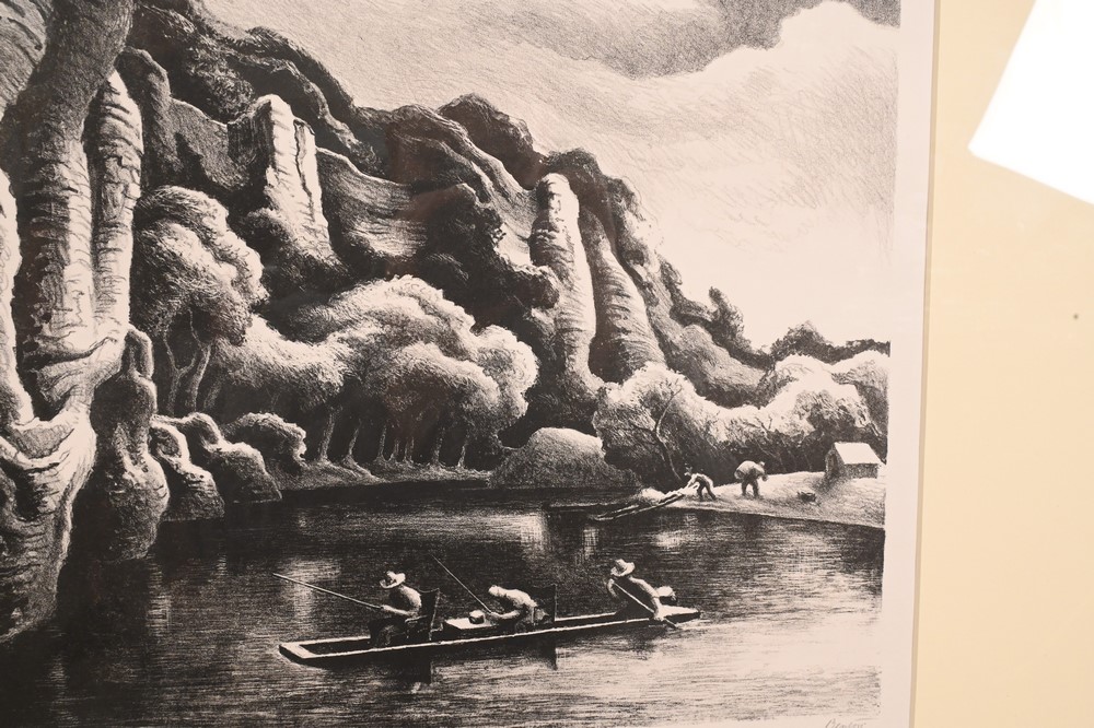 Thomas Hart Benton (1889-1975), 1972, Making Camp On The Buffalo River, lithograph, signed and titled in pencil, edition of 250, published by Associated American Artists, New York, 12″ x 14 3/8″; 305 x 365 mm, sheet 16 1/4″ x 19 1/8″; 413 x 486 mm. Exhibited: C the Creekmore and Adele Fath Charitable Foundation Collection. Sold at Doyles, New York, November 8, 2011. Condition: Minor printers ink in the margins and verso, pale offsetting verso, some minor glue residue with associated light abrasion at center of bottom sheet edge verso, otherwise in good condition, with full margins.