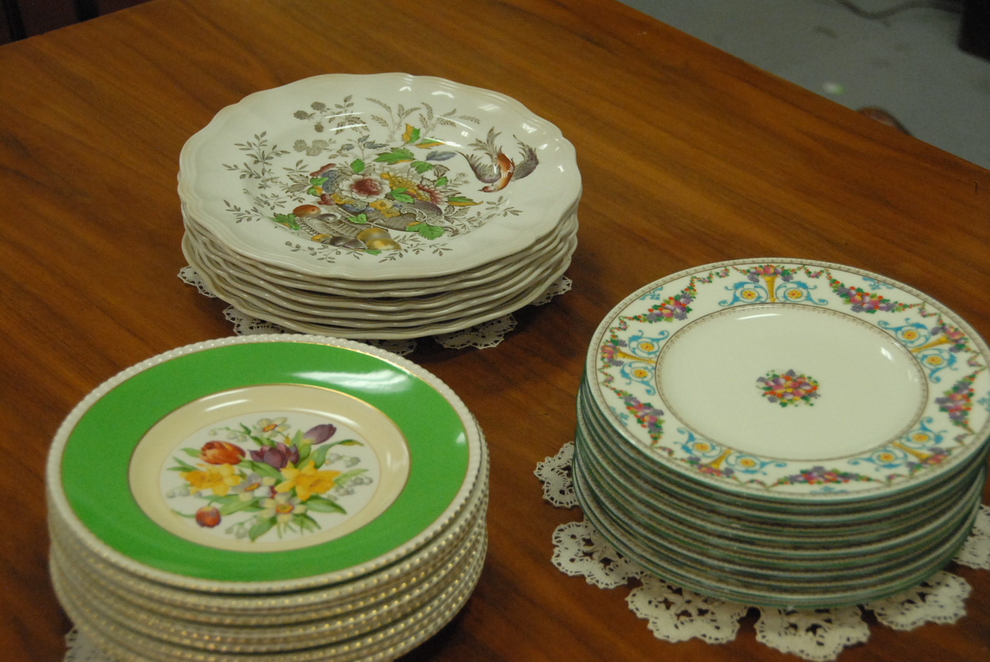 Three sets of plates including eight Royal Doulton Hampshire, twelve Wedgwood Venton, and twelve Fondeville Ambassador plates. dia. 9in., 9in., & 10 1/2in.