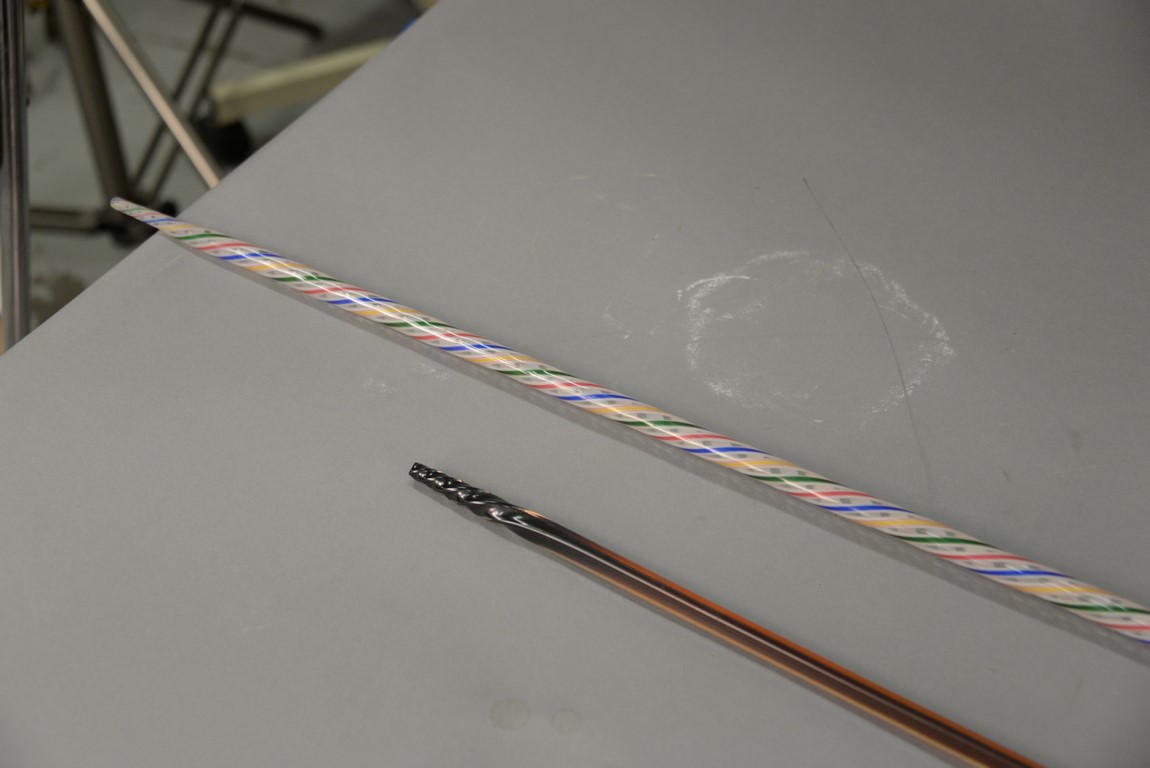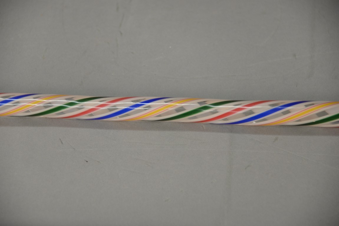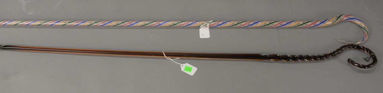 Lot 313: Two American art glass parade canes, one having twisted red, white, blue, green, and yellow and the other in clear to brown glass with over exaggerated curved end. lg. 56 in. and lg. 44 1/2 in.