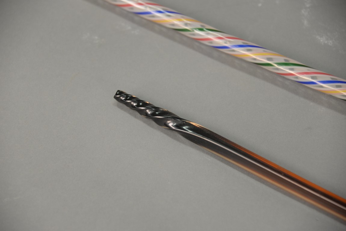 Two American art glass parade canes, one having twisted red, white, blue, green, and yellow and the other in clear to brown glass with over exaggerated curved end. lg. 56 in. and lg. 44 1/2 in.