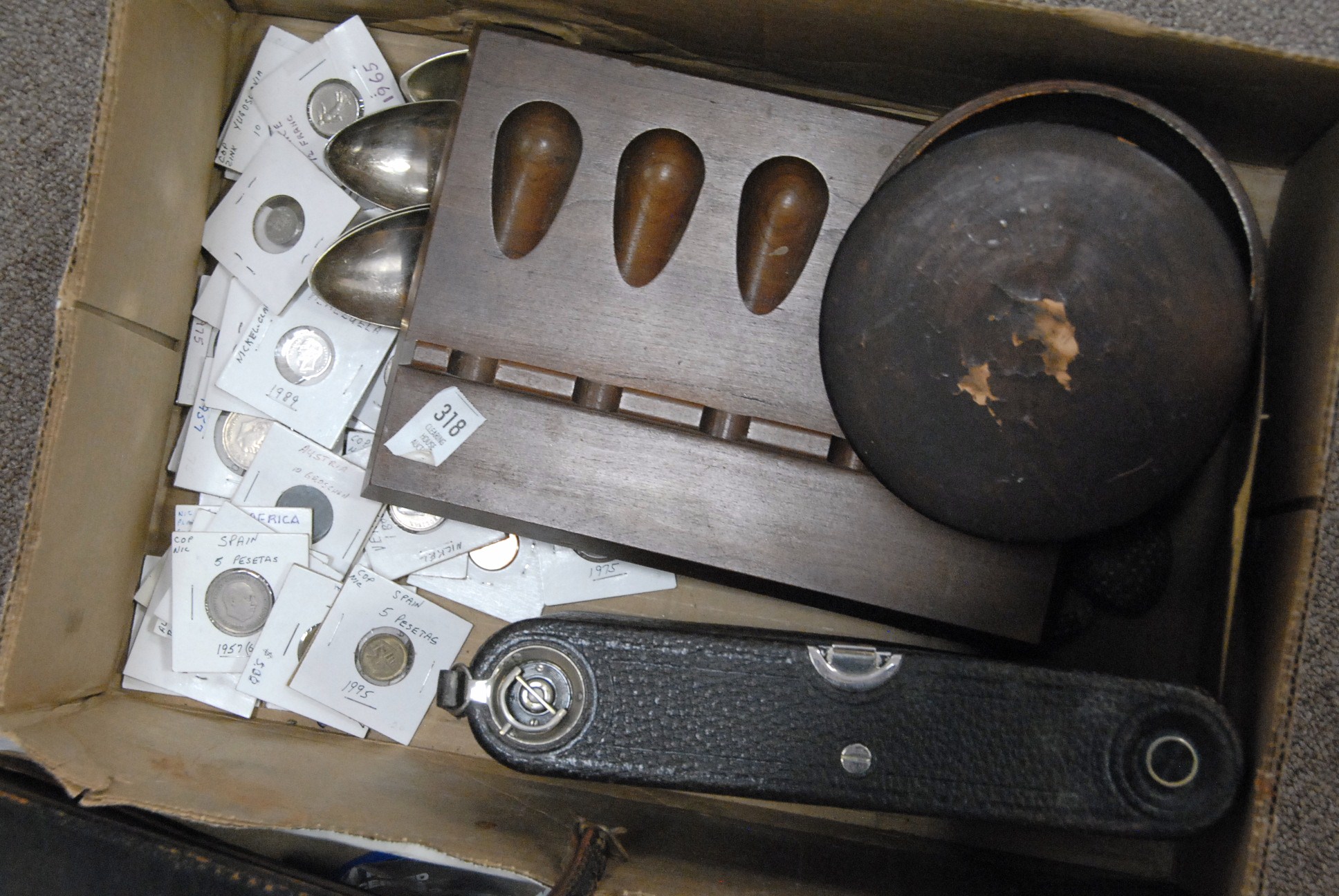 Two box lots to include coins, spoons, napkin holders, horn cocktail shaker with silver.