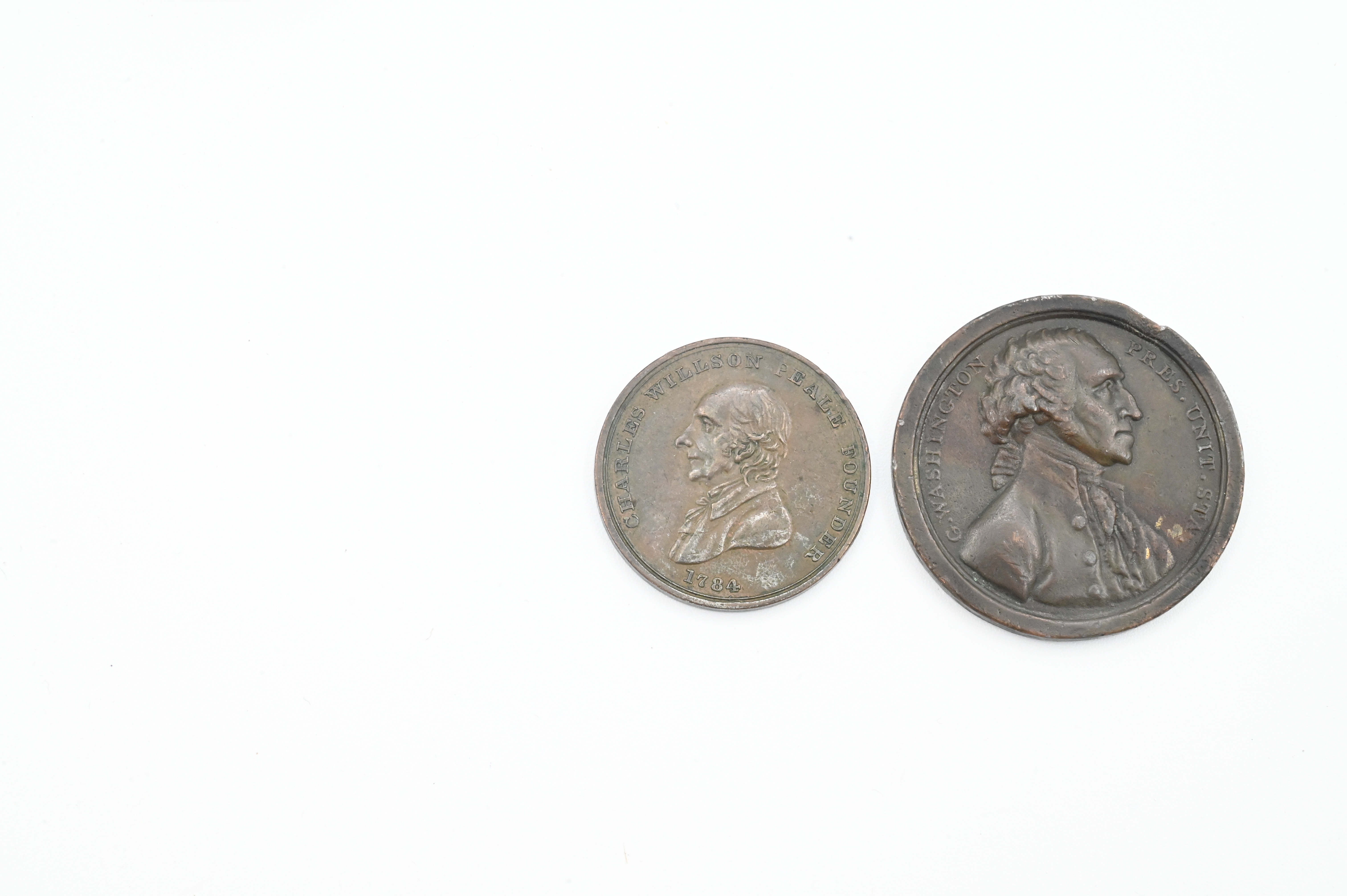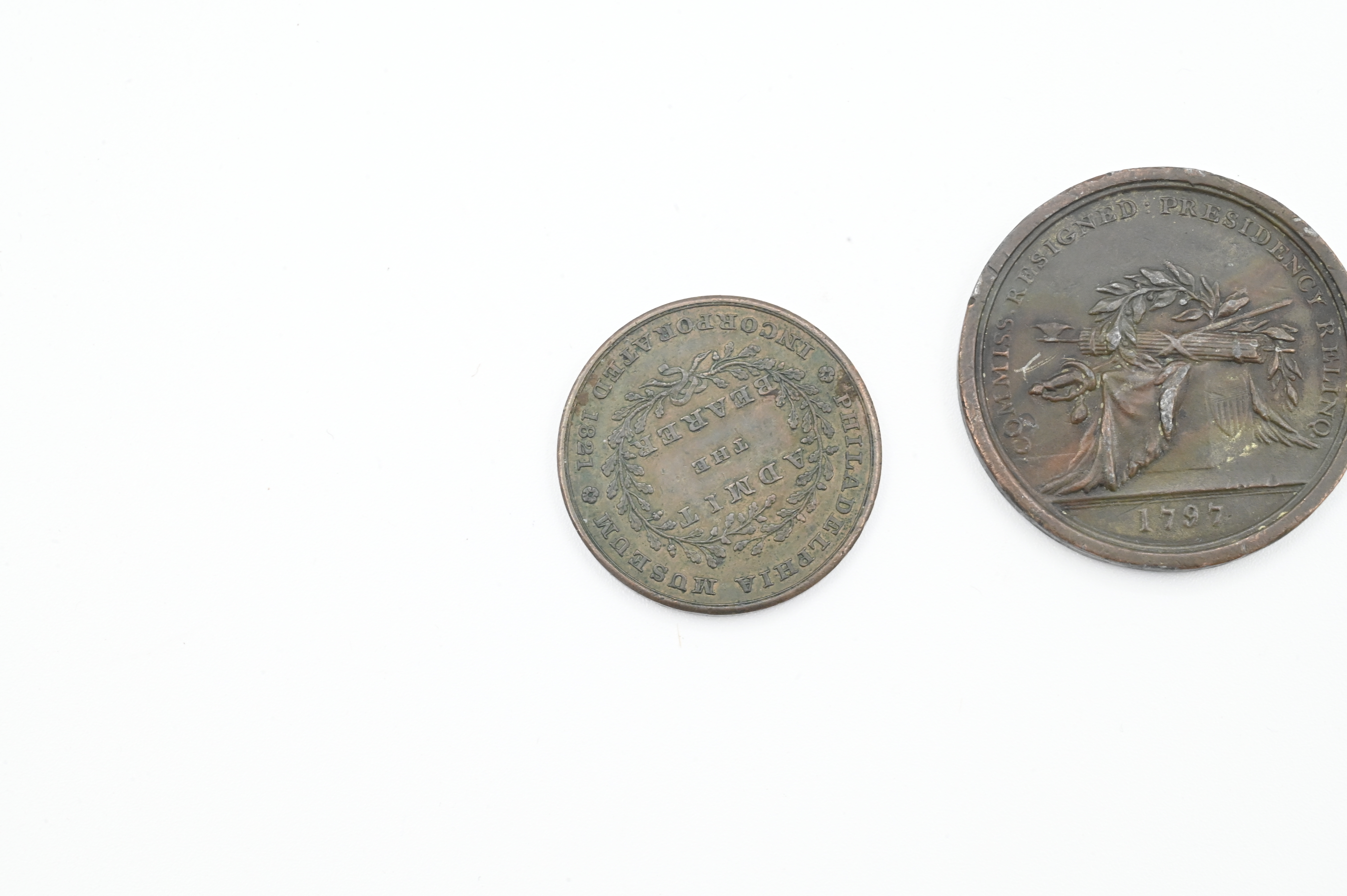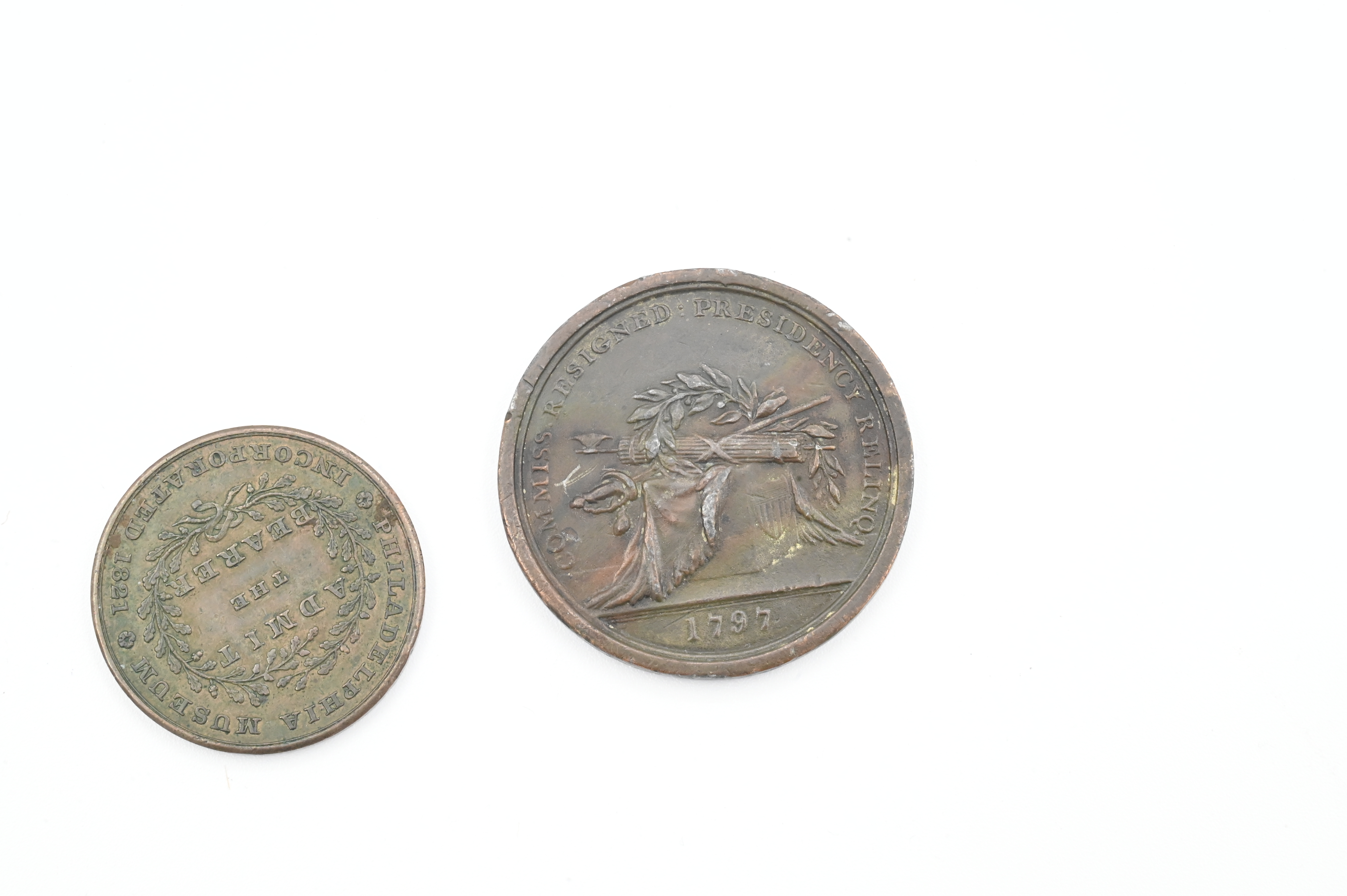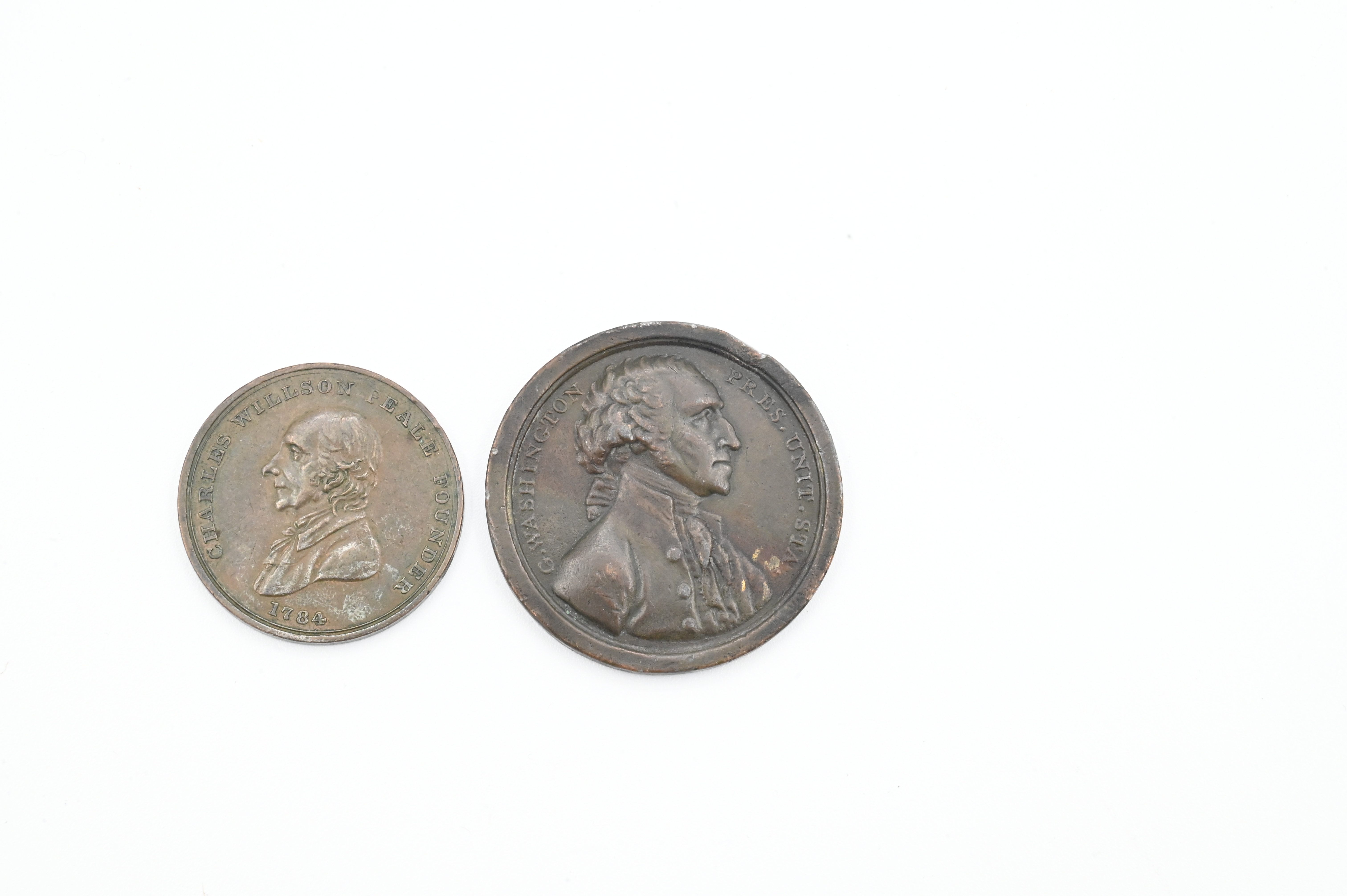 to include 1805 (dated 1797) Sanson medal George Washington Presidency Relinquished with a diameter of 1 5/8 inches, and 1821 (dated 1784) Charles Willson Peale Philadelphia Museum admitent token with a diameter of 1 1/2 inches