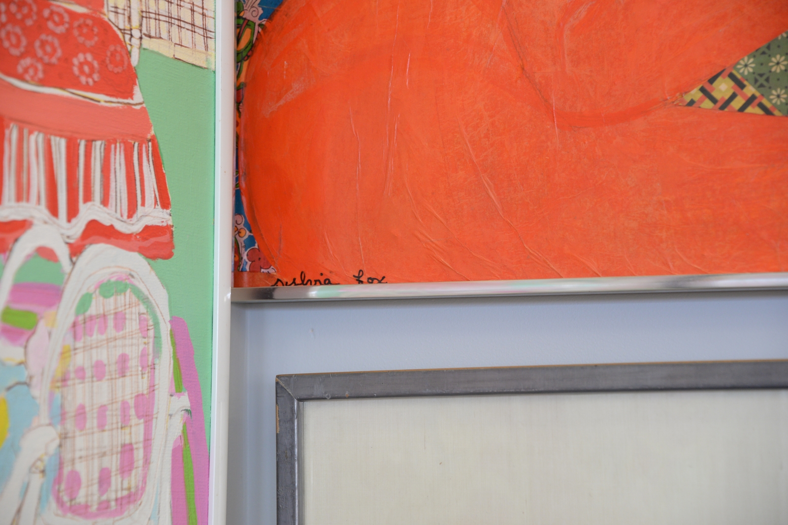 Two framed collages including Sylvia Fox modern collage of woman in a red dress signed lower left Sylvia Fox and Karl Mann b. 1930 collages signed lower left Karl Mann 73 20 x 20.