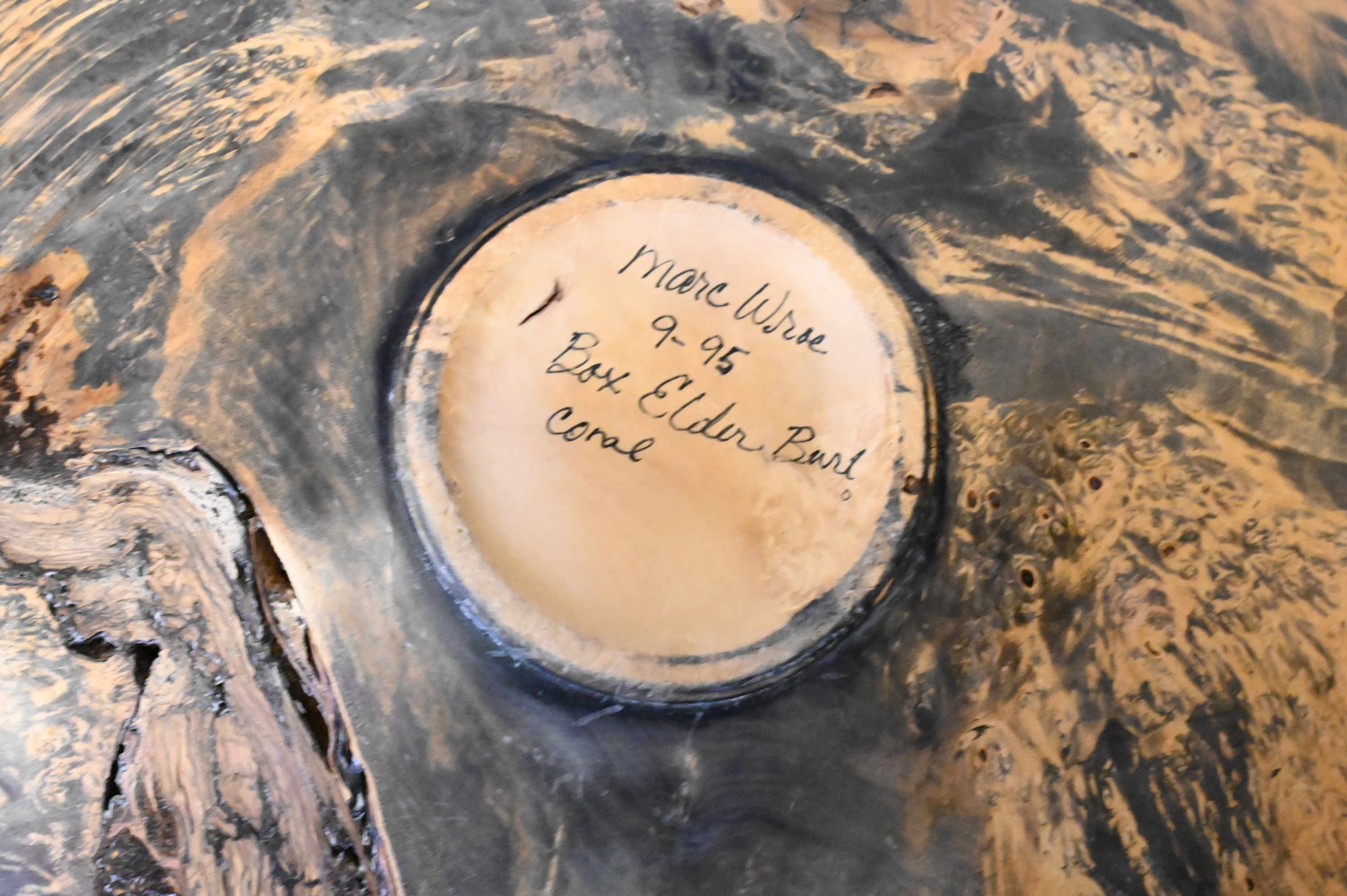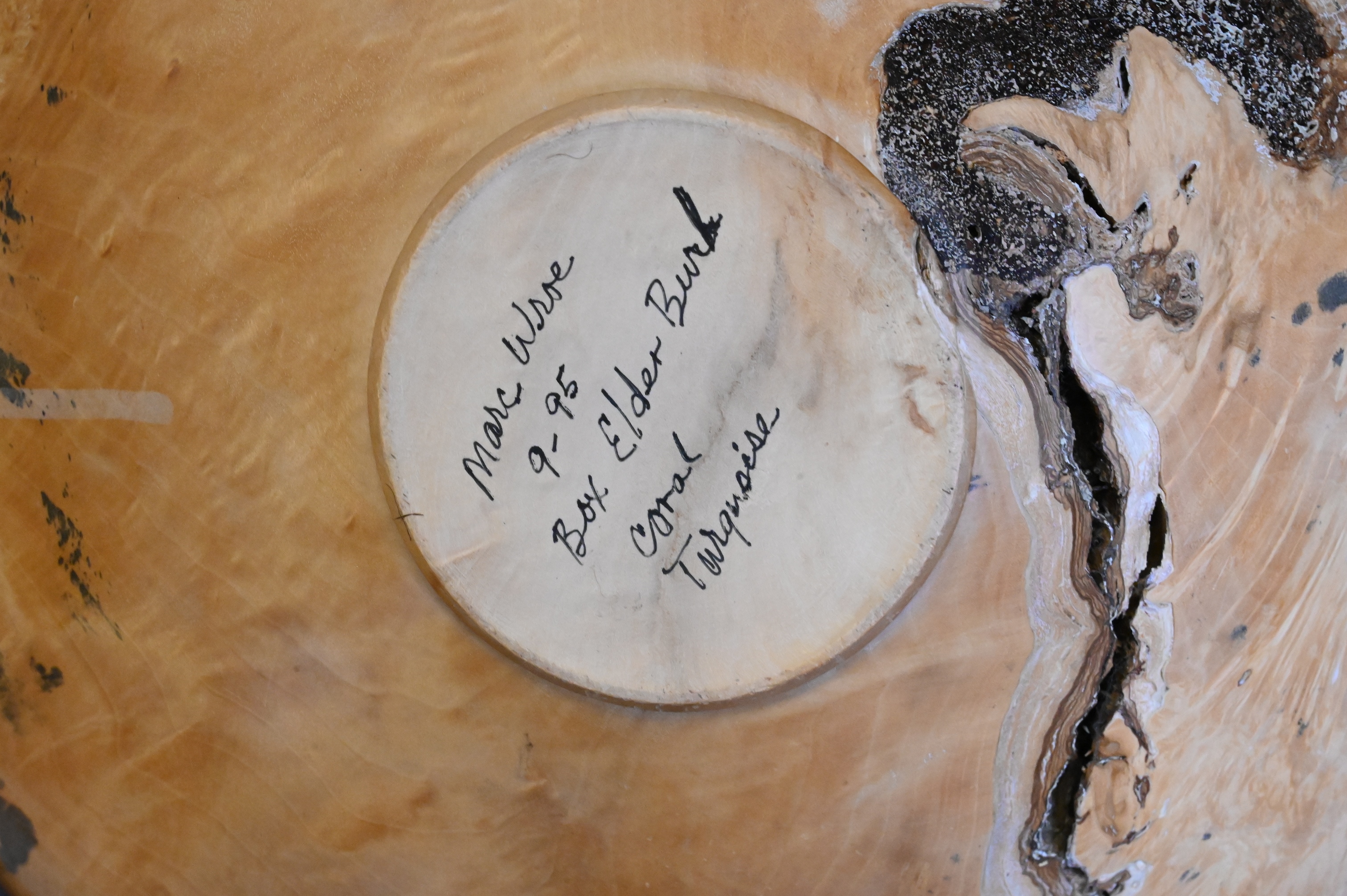one having edge burl rim 1995, the other having coral and turqoise inlay with live burl rim 1995, each signed, dated, and titled on base “Mark Woe ’95”