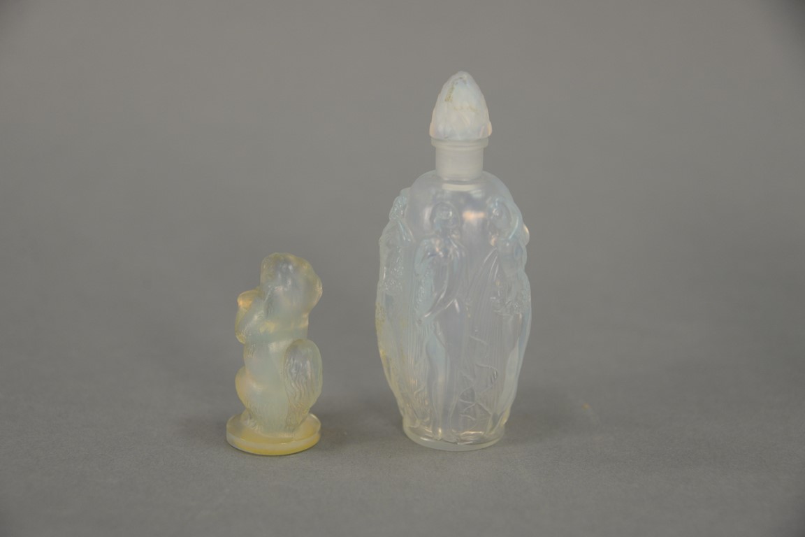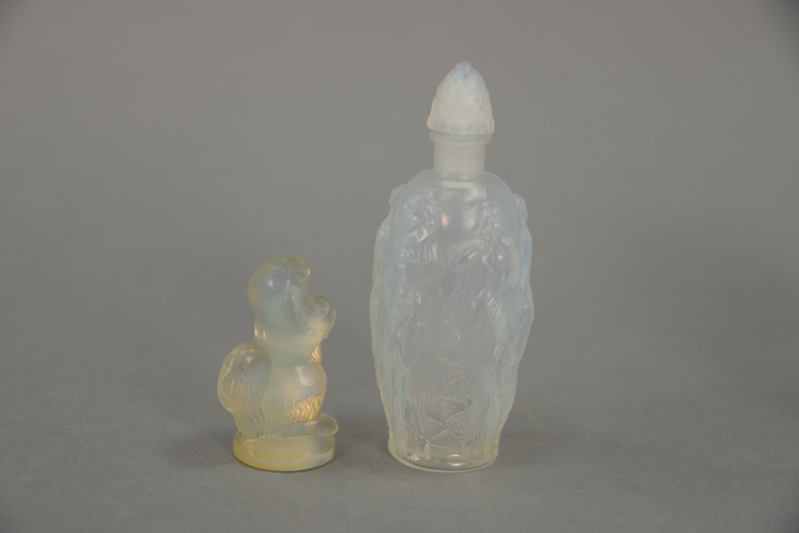 Two piece lot to include Sabino France art deco glass perfume bottle, opalescent with five figures crystal marked Sabino France and a Sabino opalescent dog. ht. 2in. to 4in.