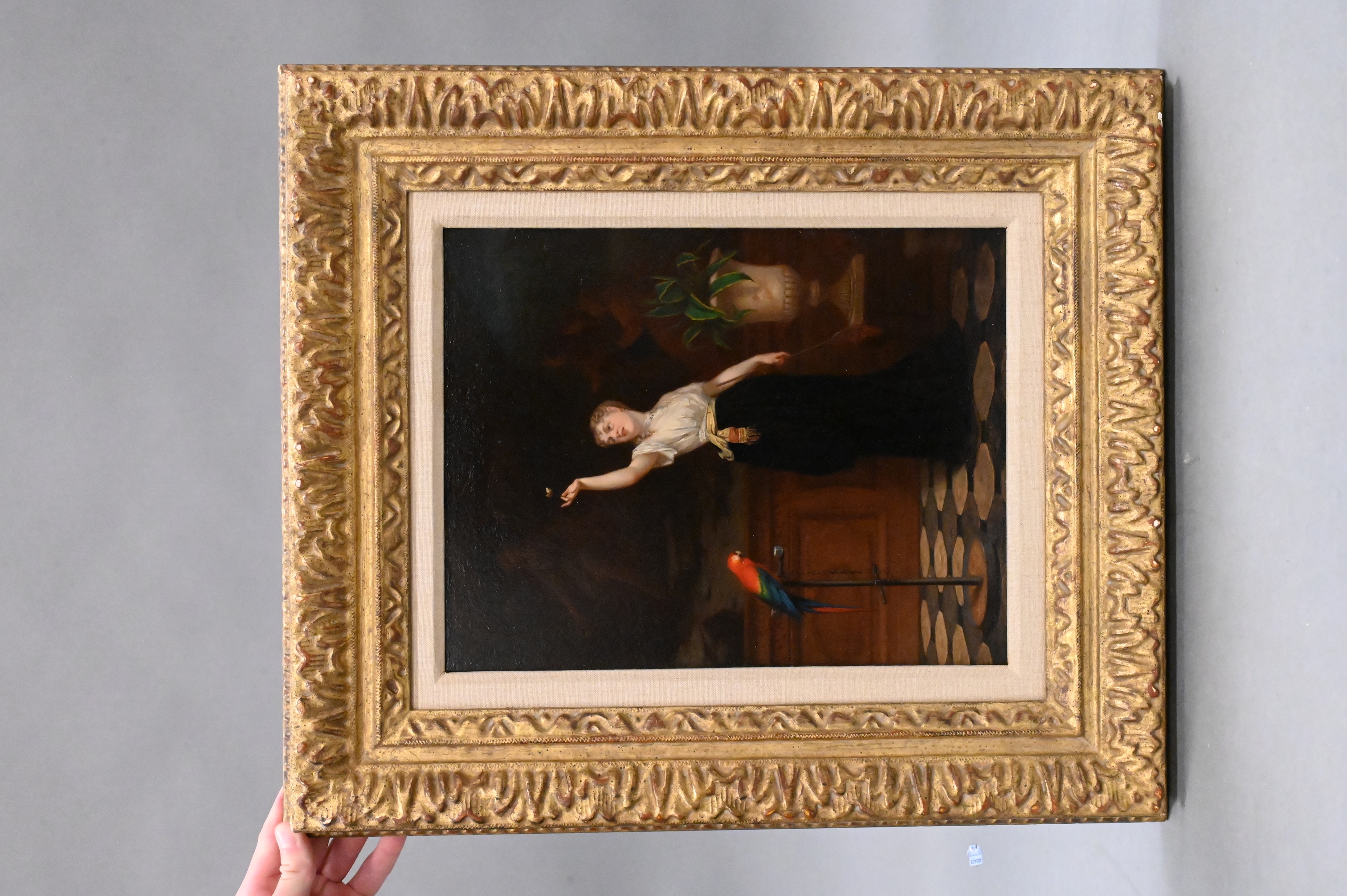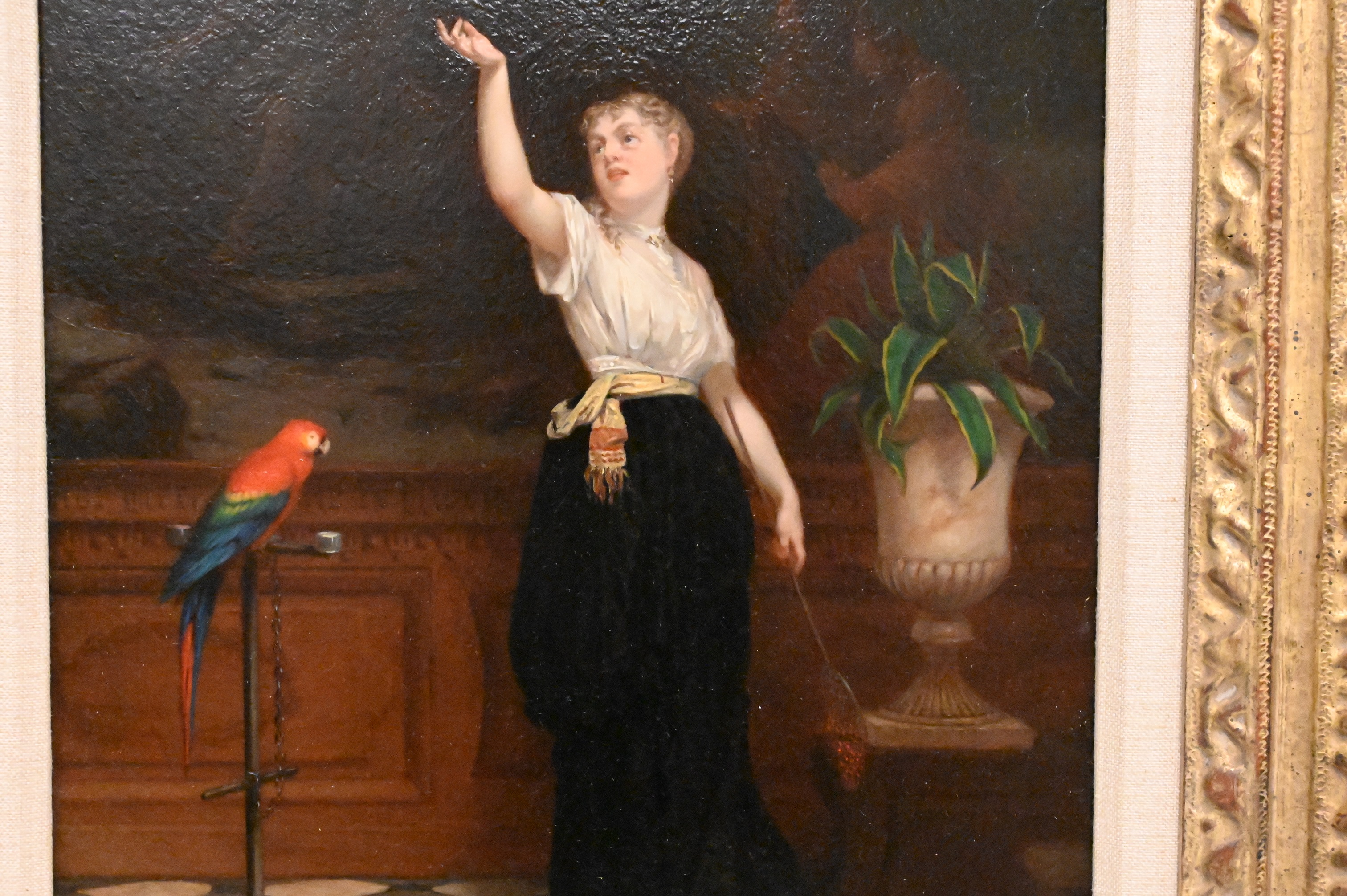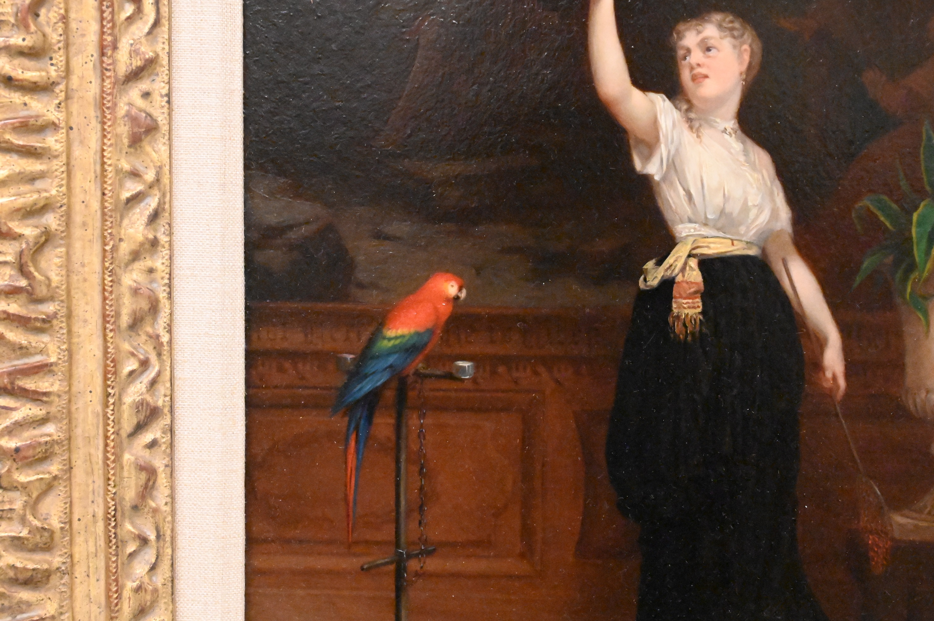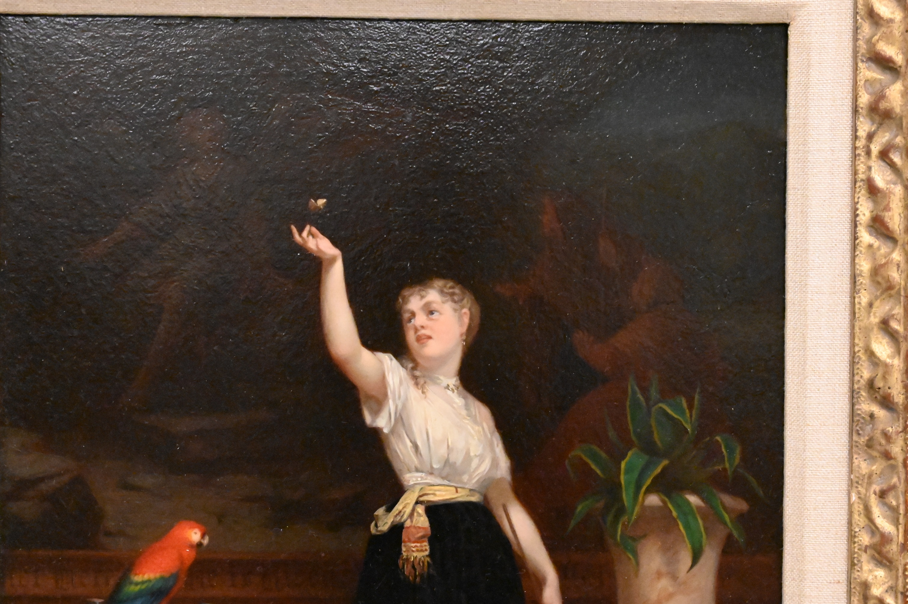 Featuring a young woman in a parlor releasing a butterfly alongside a parrot chained to a post