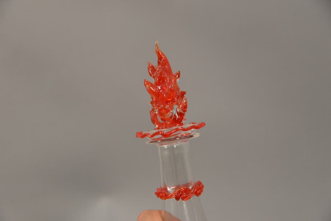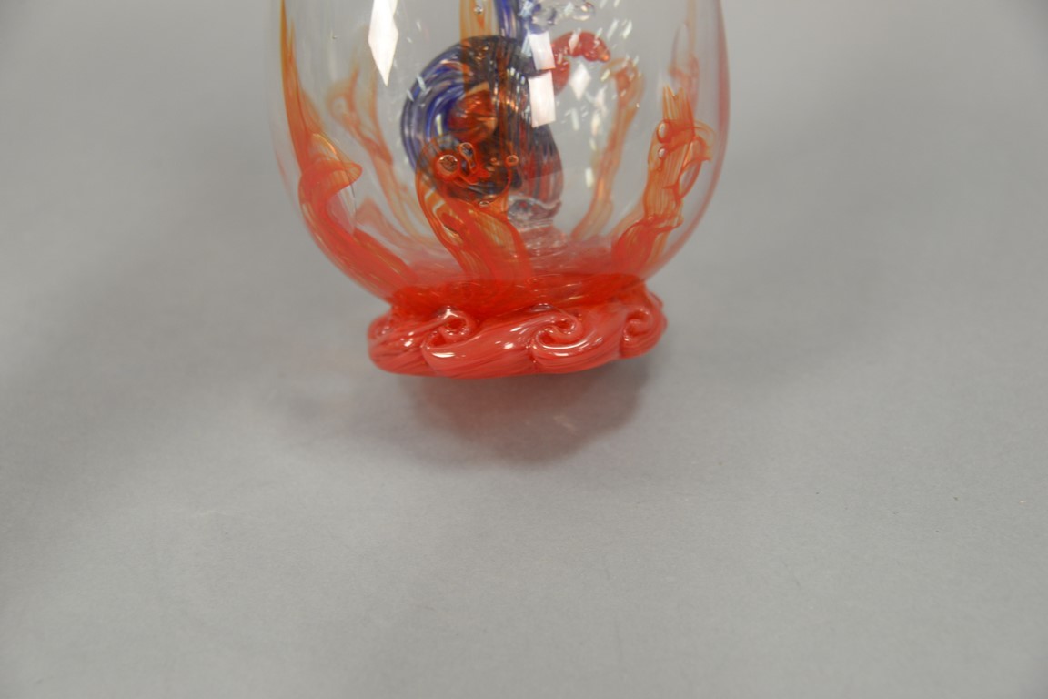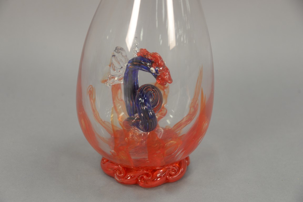 Art glass dragon decanter having hand blown winged dragon figure on interior with fire flame stopper. ht. 16 1/2in. Provenance: Estate of Arthur C. Pinto, MD