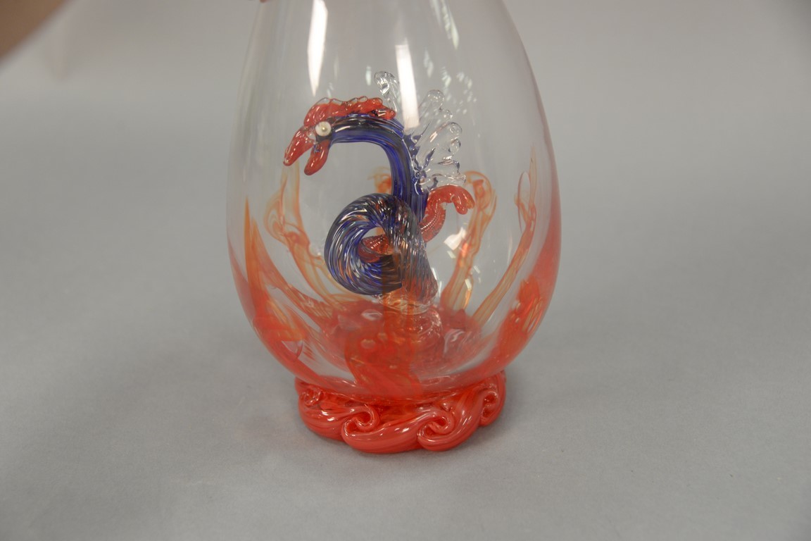 Lot 314: Art glass dragon decanter having hand blown winged dragon figure on interior with fire flame stopper. ht. 16 1/2in. Provenance: E…