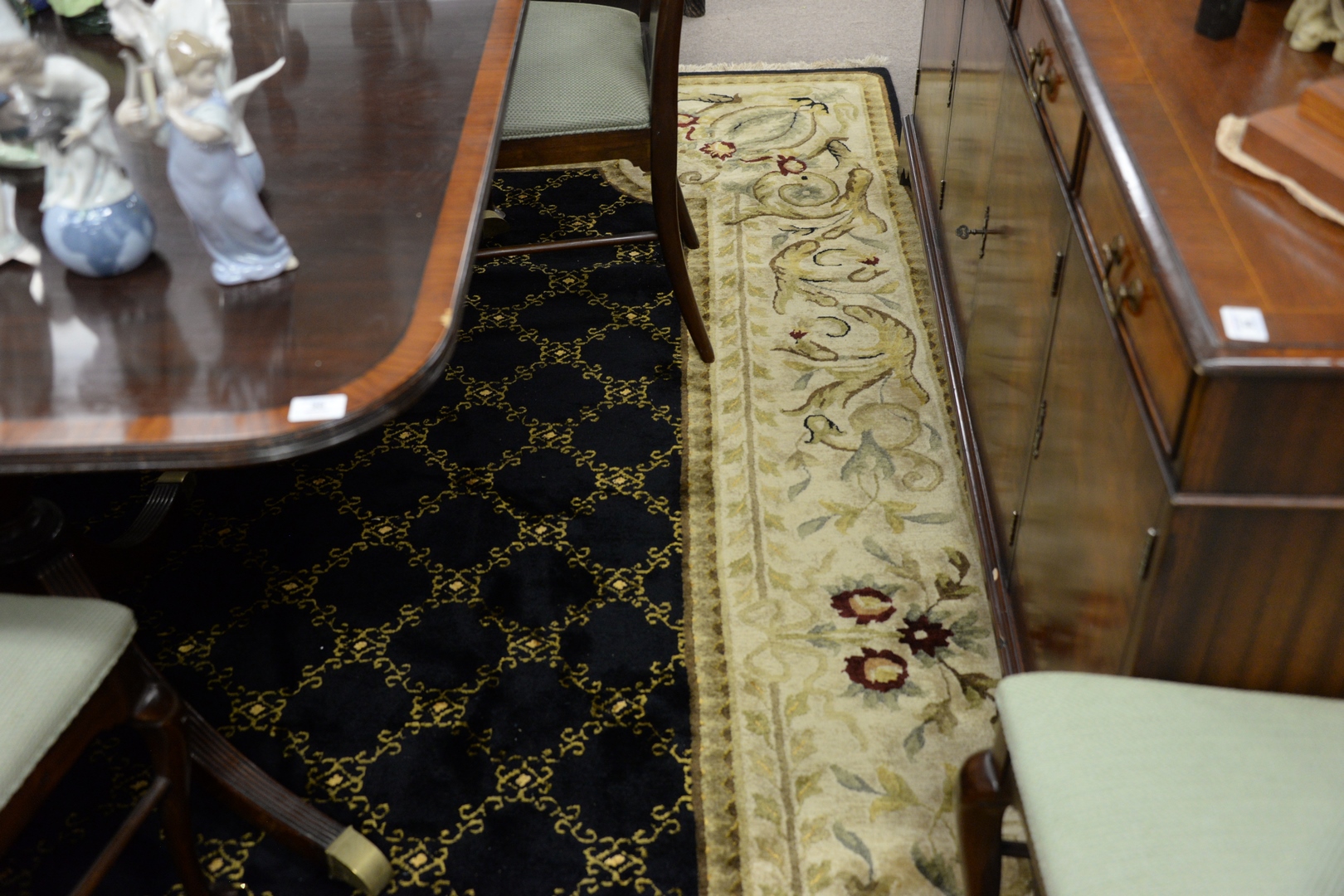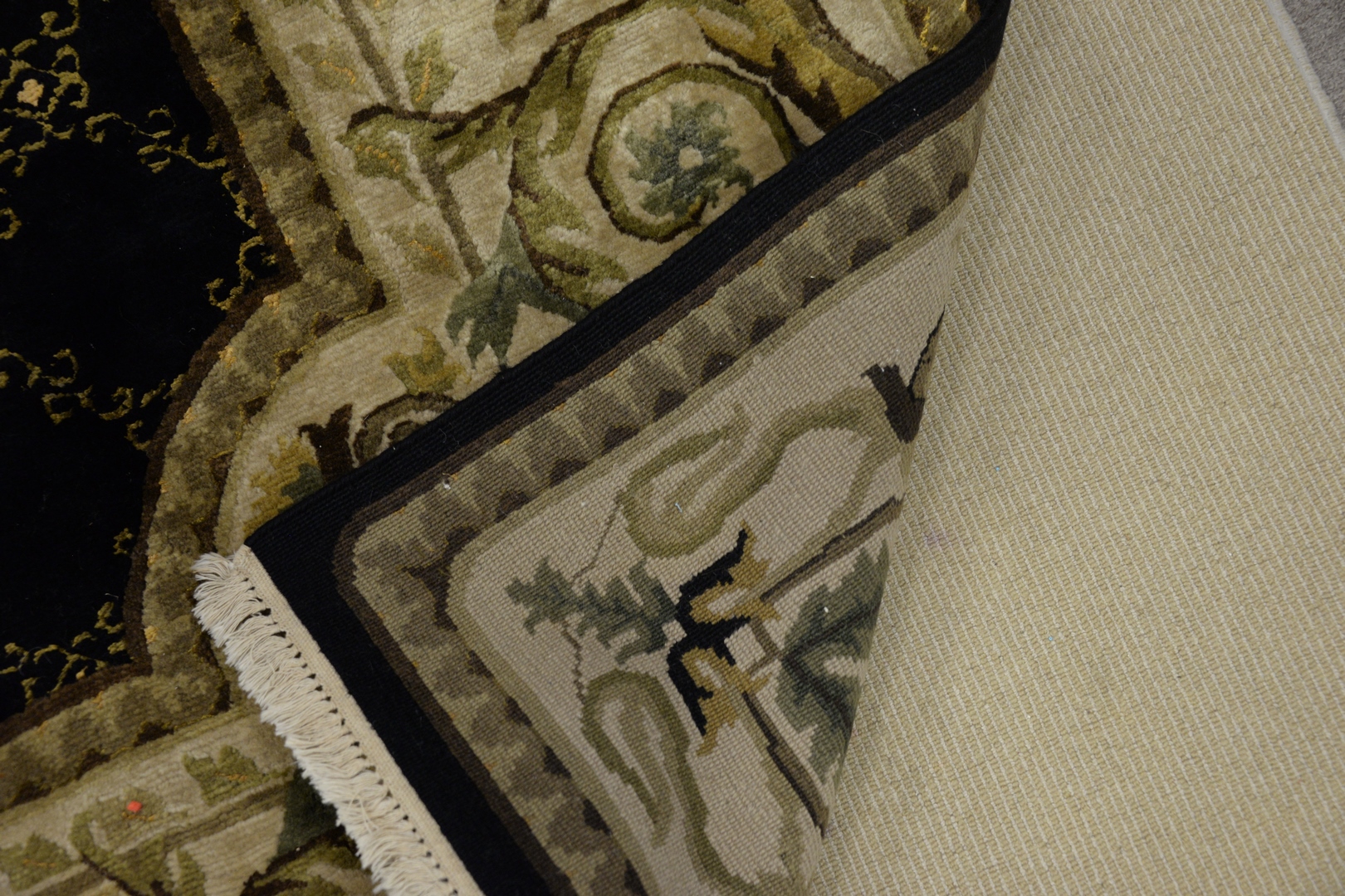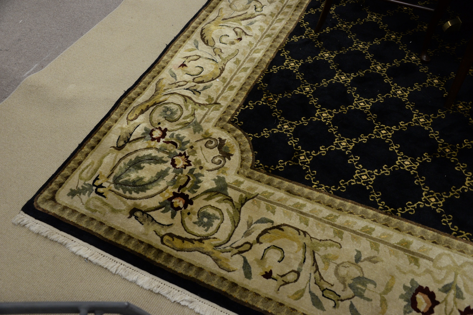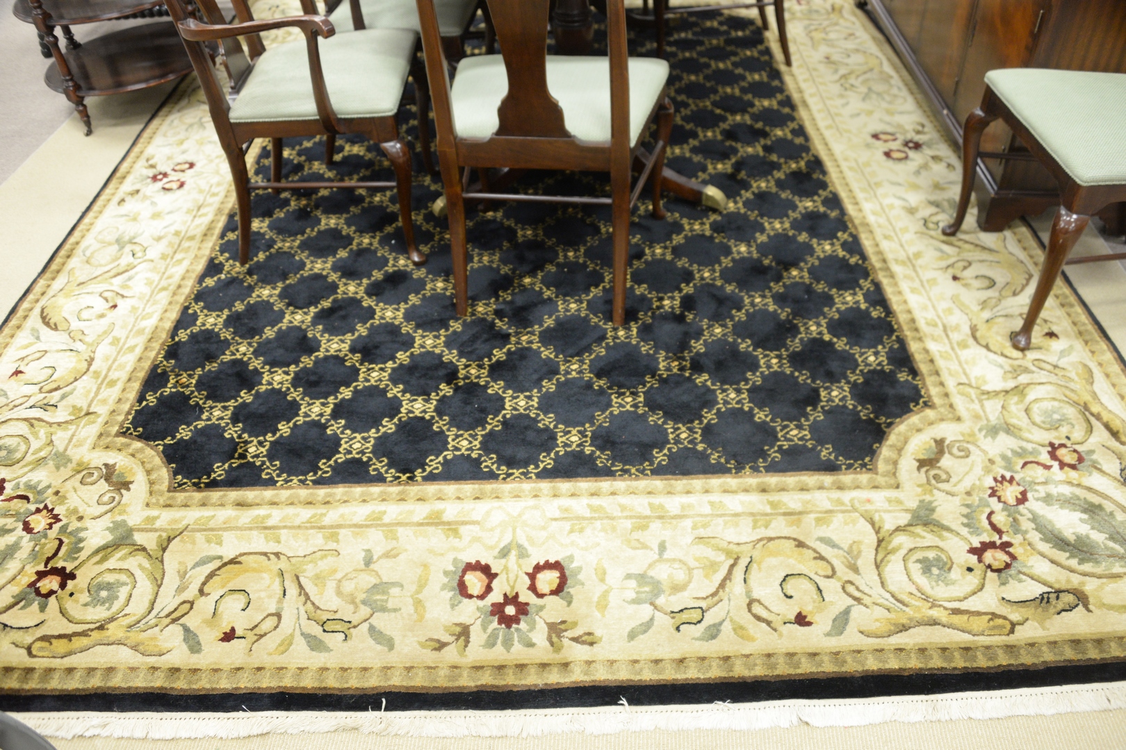 Lot 314: Contemporary Room Size Oriental Carpet, black and tan, 9′ x 12′ 1″. Provenance: David and Cynthia Kim, 22 Stoney Wylde Lane, Greenwich, Connecticut. View home by visiting: https://www.zillow.com/homedetails/22-Stoney-Wylde-Ln-Greenwich-CT-06830/177238281_zpid/