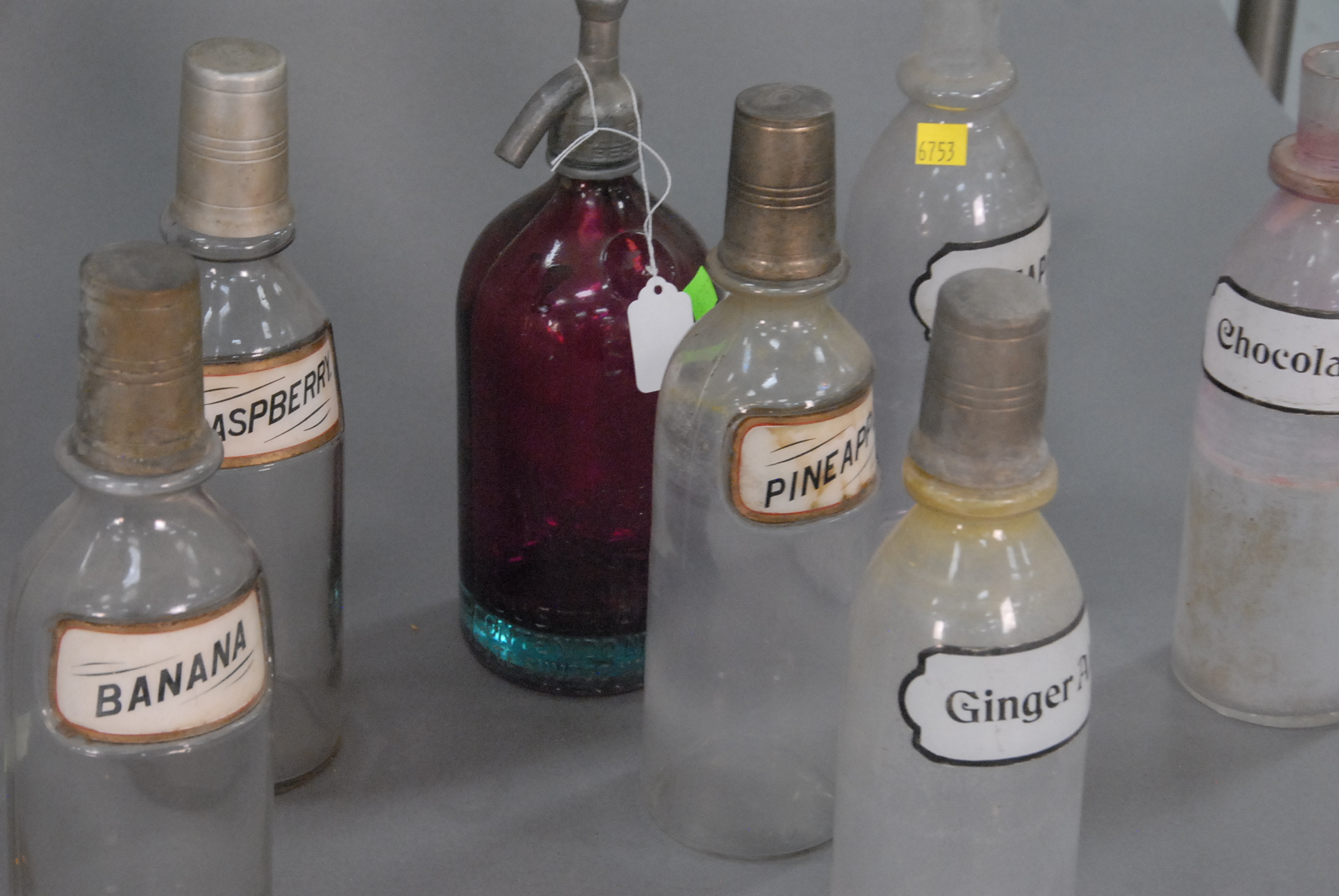 Lot 314: Group of seven soda fountain bottles, one seltzer water and six are flavored, ht. 11 1/2.