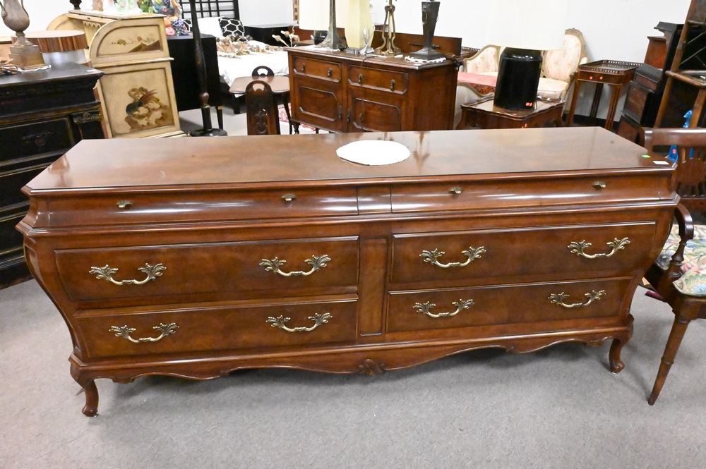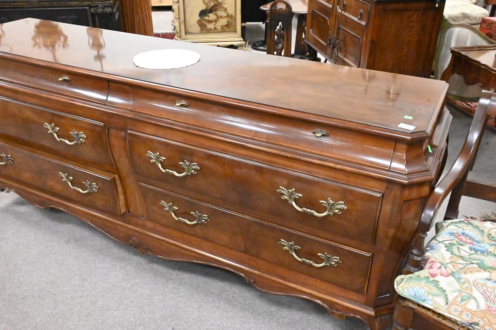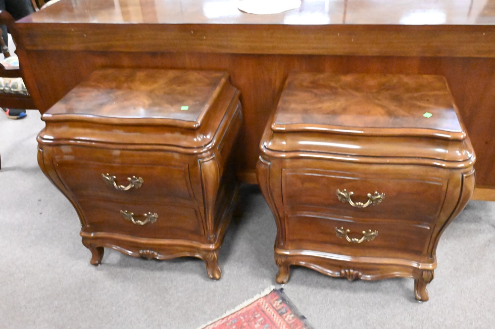 Karges Three Piece Set, to include a double chest, along with two Louis XV style bedside chests having two drawers each; height 33 1/2 inches, top 18″ x 76″.