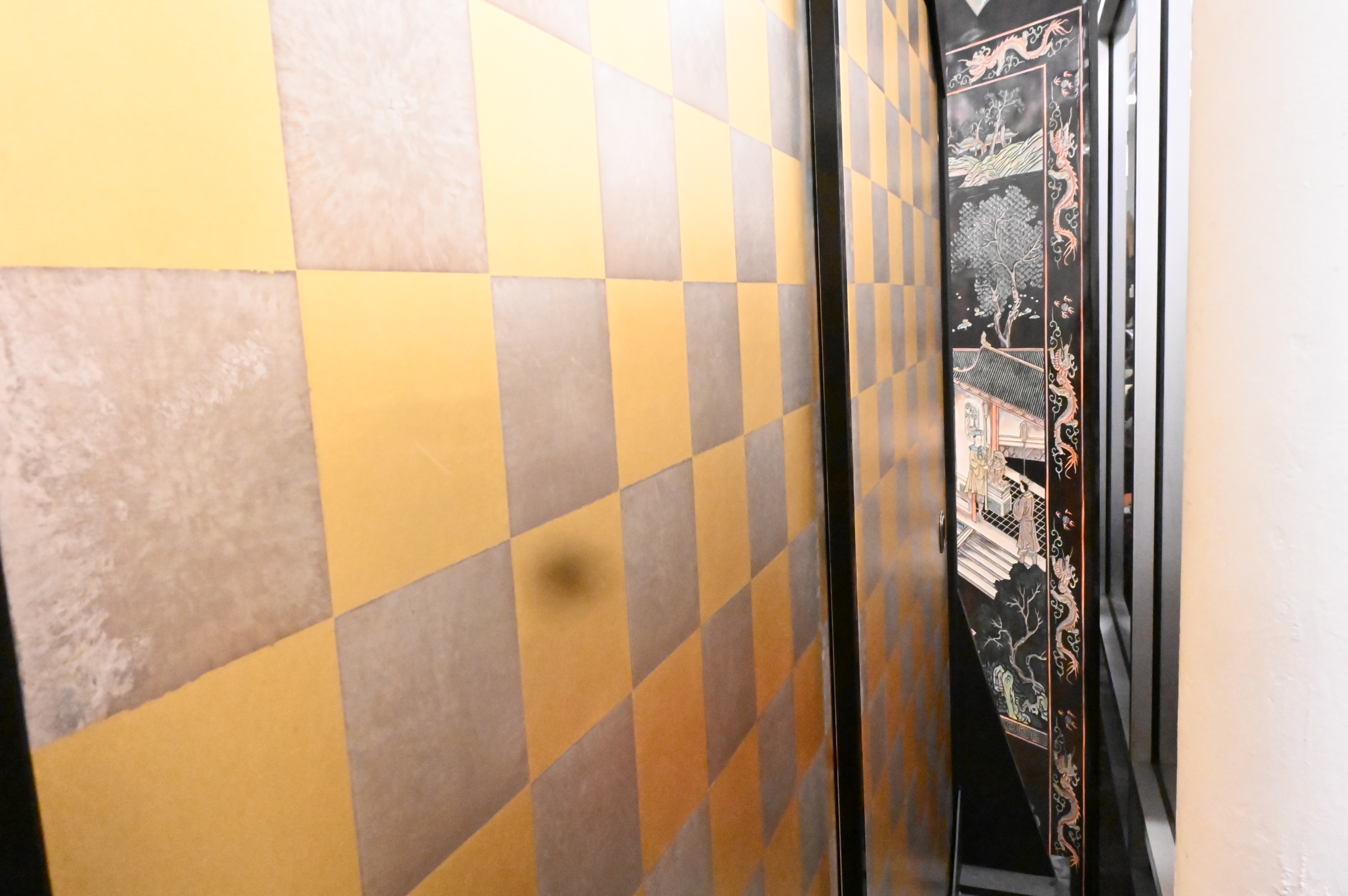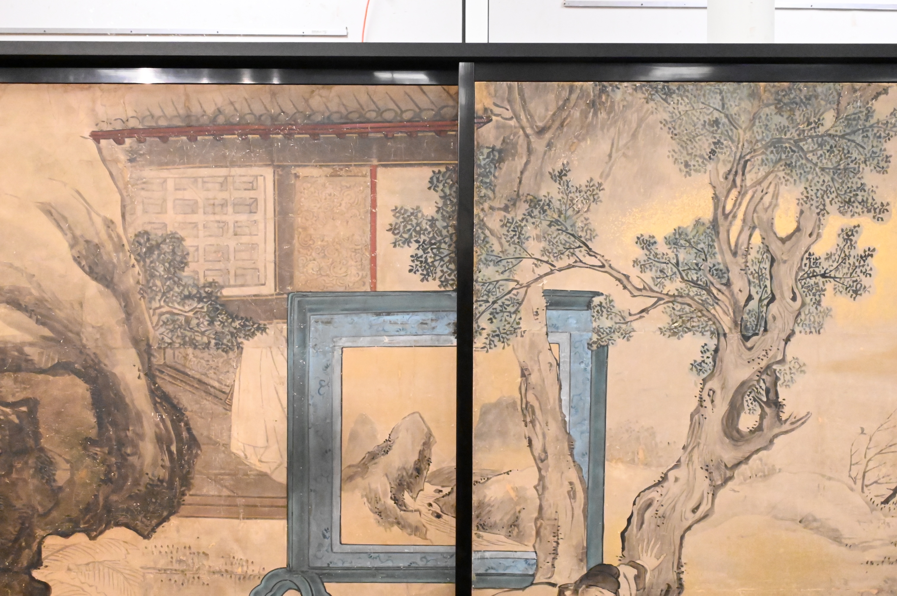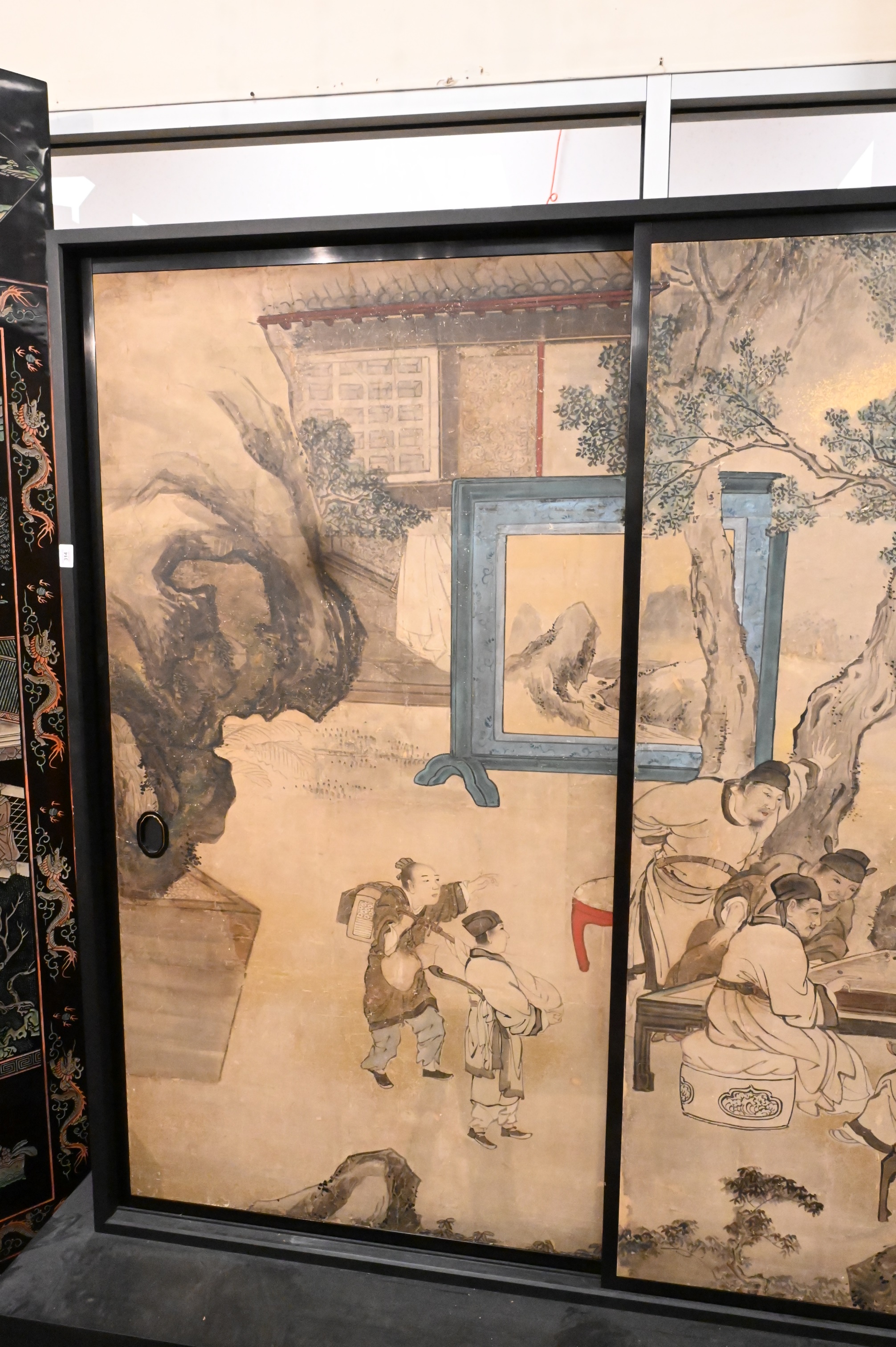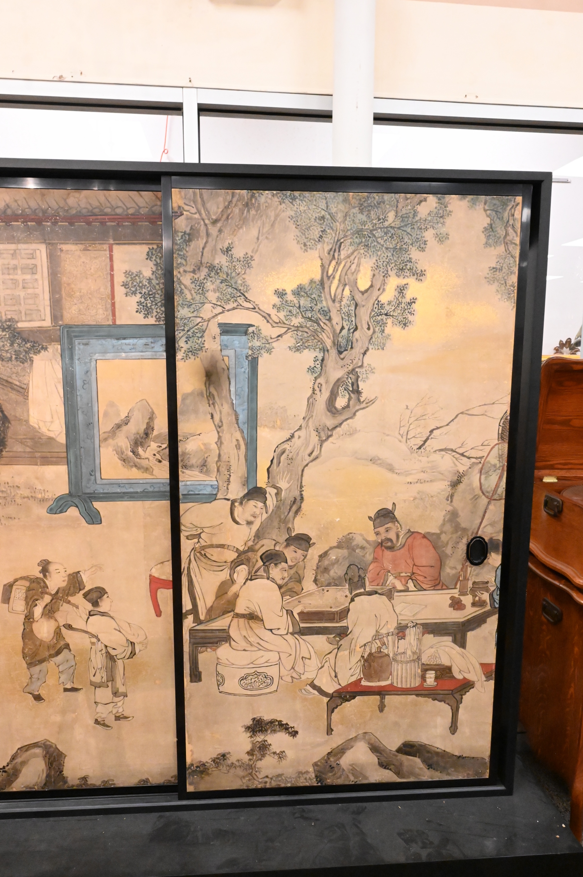 Depicting a courtyard scene with figures playing Chinese checkers, blue frame in center