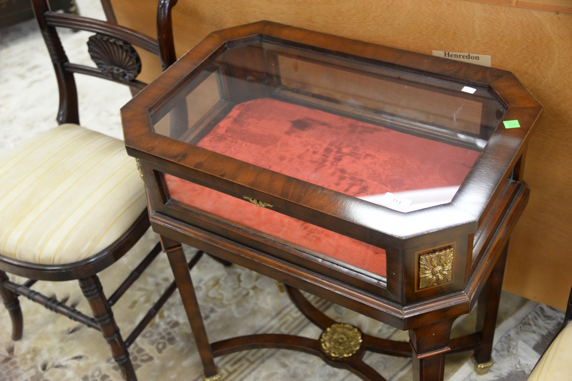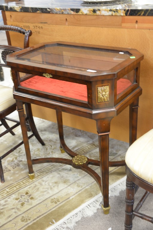 Lot 314: Maitland Smith mahogany inlaid curio cabinet rectangular side table having lift top showcase over square tapered legs and stretcher …
