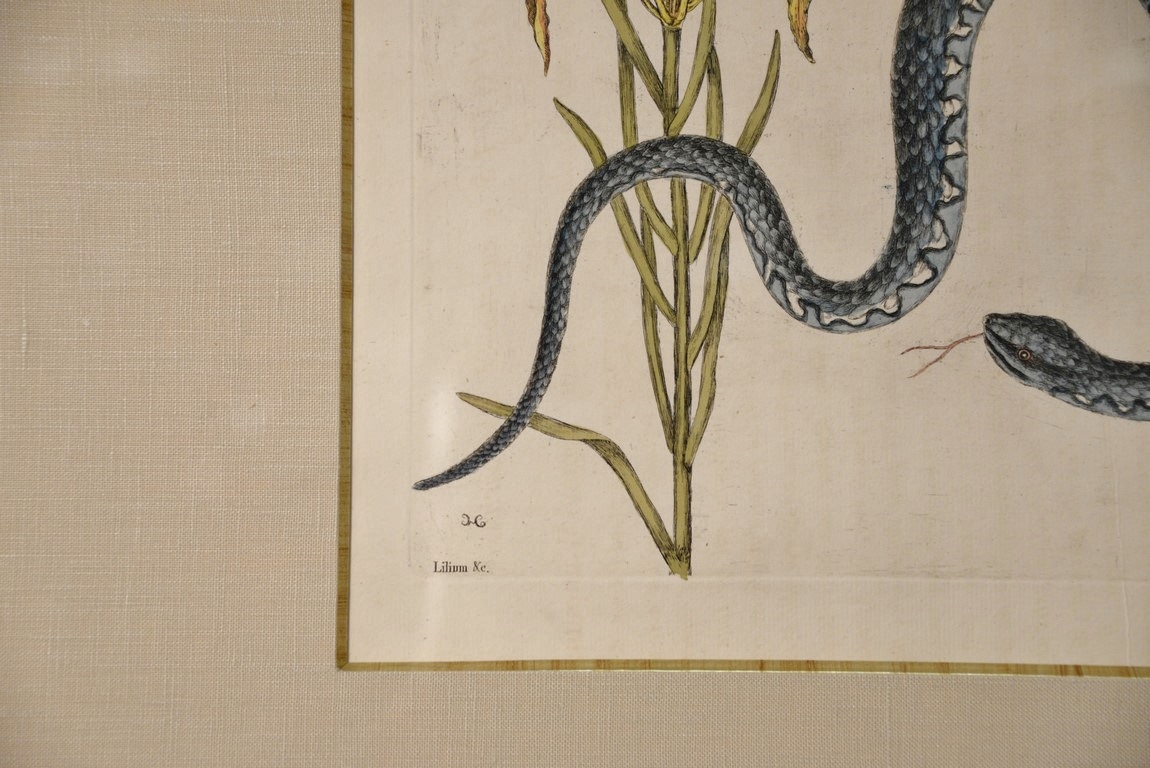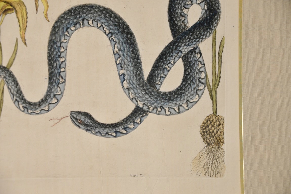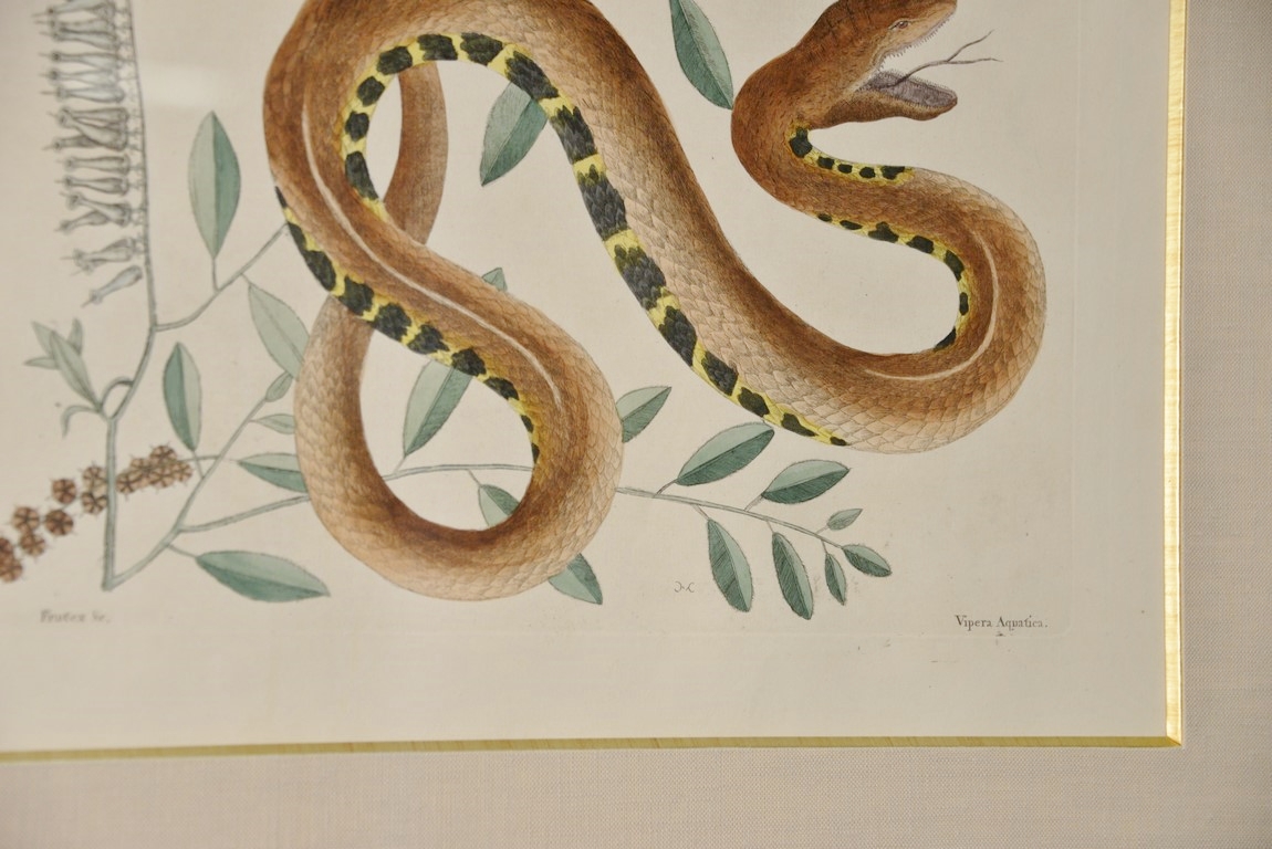 Mark Catesby 1679-1749 pair of hand colored copper plate engravings Lilium Snake Anguis Plate #58 and The Water Viper Vipera Aquatica Plate #43 From The Natural History of Carolina, Florida and the Bahama Islands framed by W. Graham Arader III sight size: 11 1/2 x 15 Provenance: Property from Credit Suisse’s Americana Collection