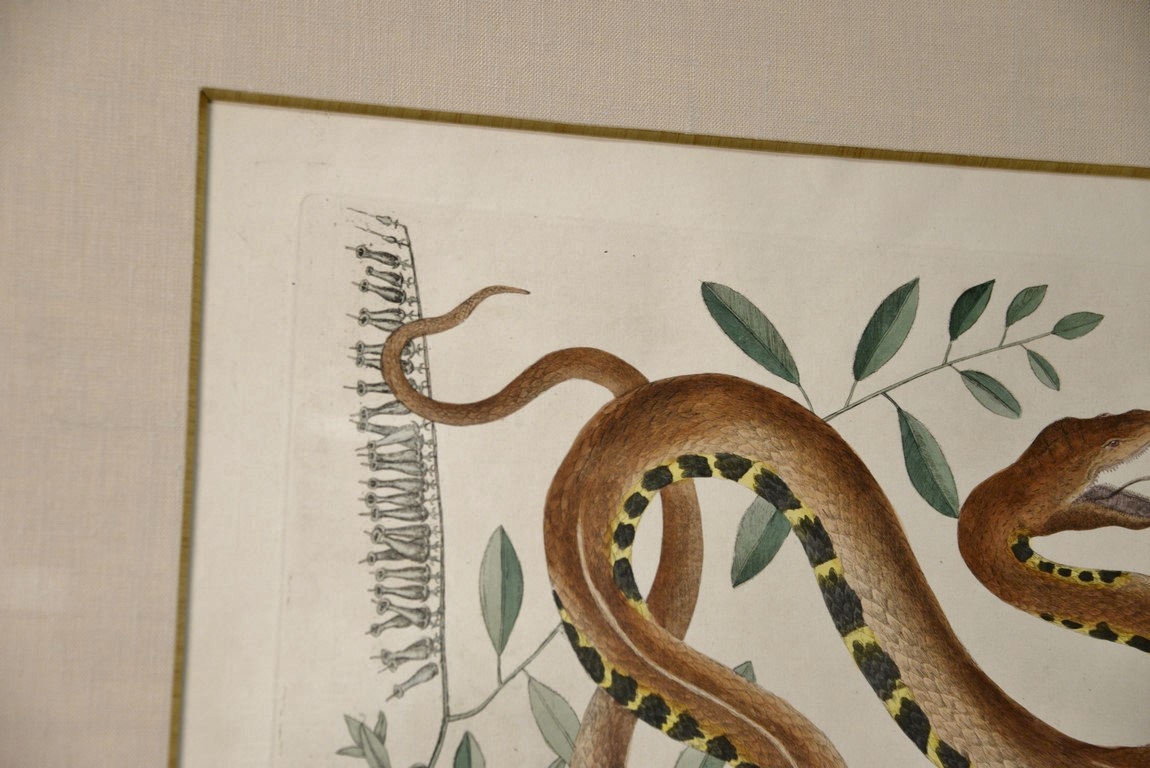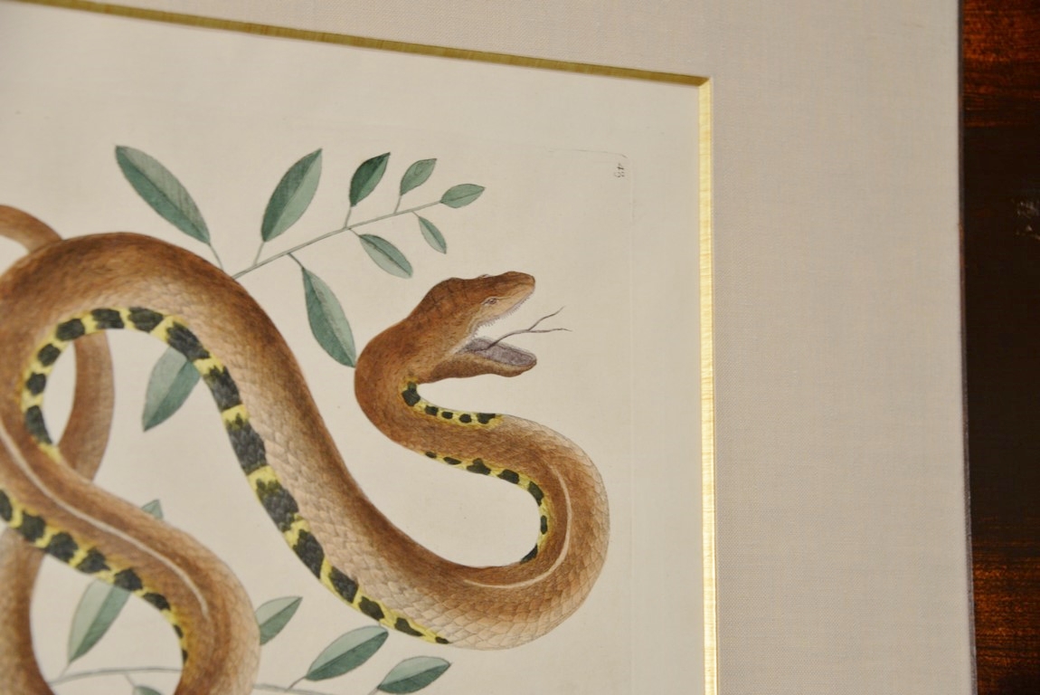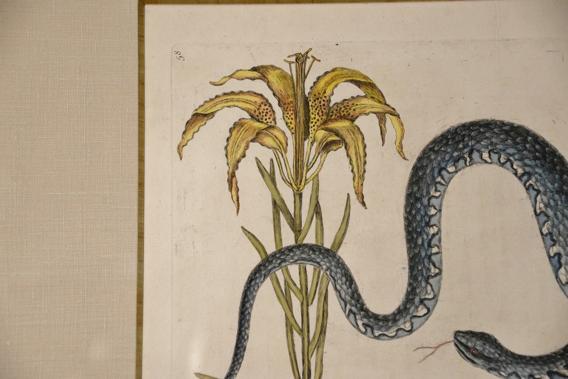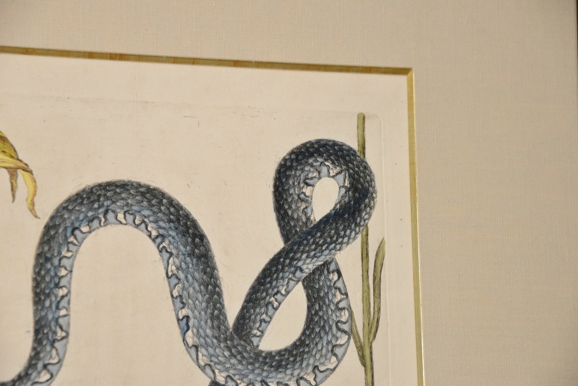Mark Catesby 1679-1749 pair of hand colored copper plate engravings Lilium Snake Anguis Plate #58 and The Water Viper Vipera Aquatica Plate #43 From The Natural History of Carolina, Florida and the Bahama Islands framed by W. Graham Arader III sight size: 11 1/2 x 15 Provenance: Property from Credit Suisse’s Americana Collection