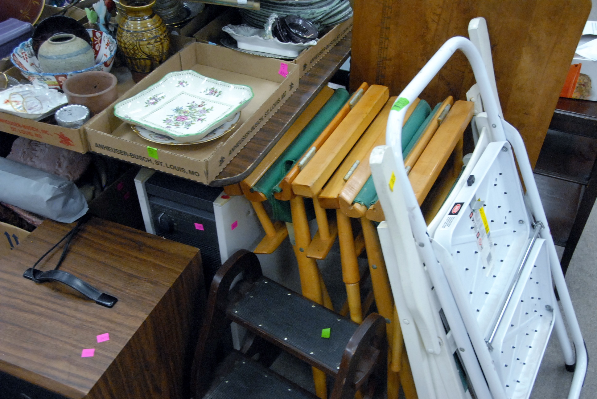 On top and below table to include books, miscellaneous glass and china, marble top stand, suitcase, spool bed, outdoor chair, bench, two air purifiers.