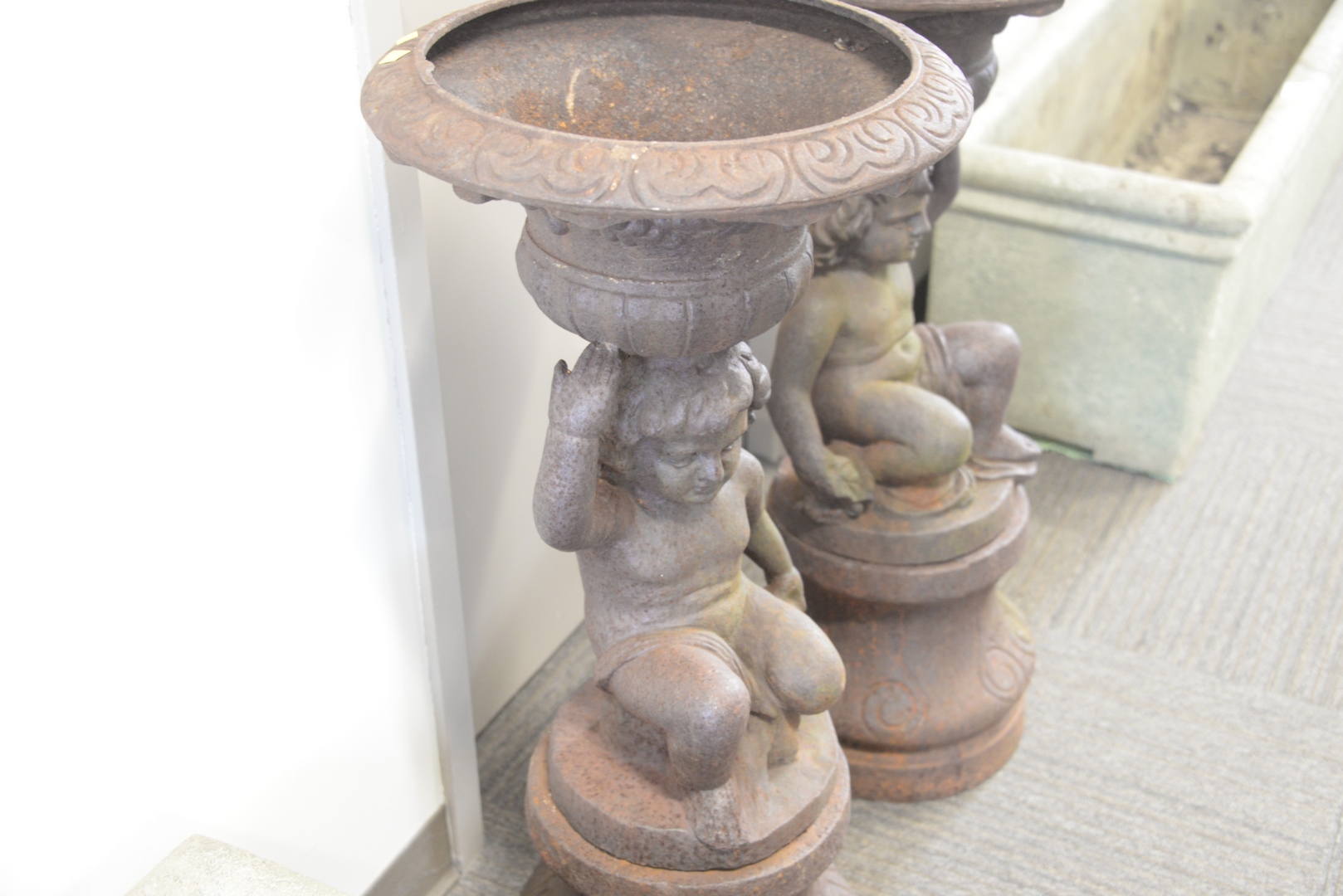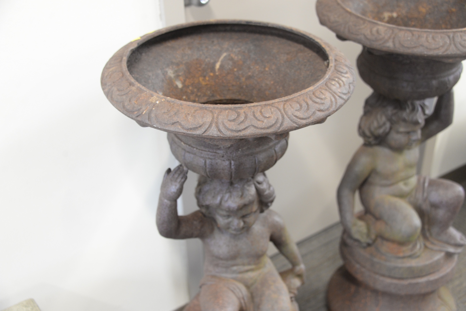 Pair of Cast Iron Figural Two Part Urns or Planters, height 38 inches, diameter 17 1/2 inches.