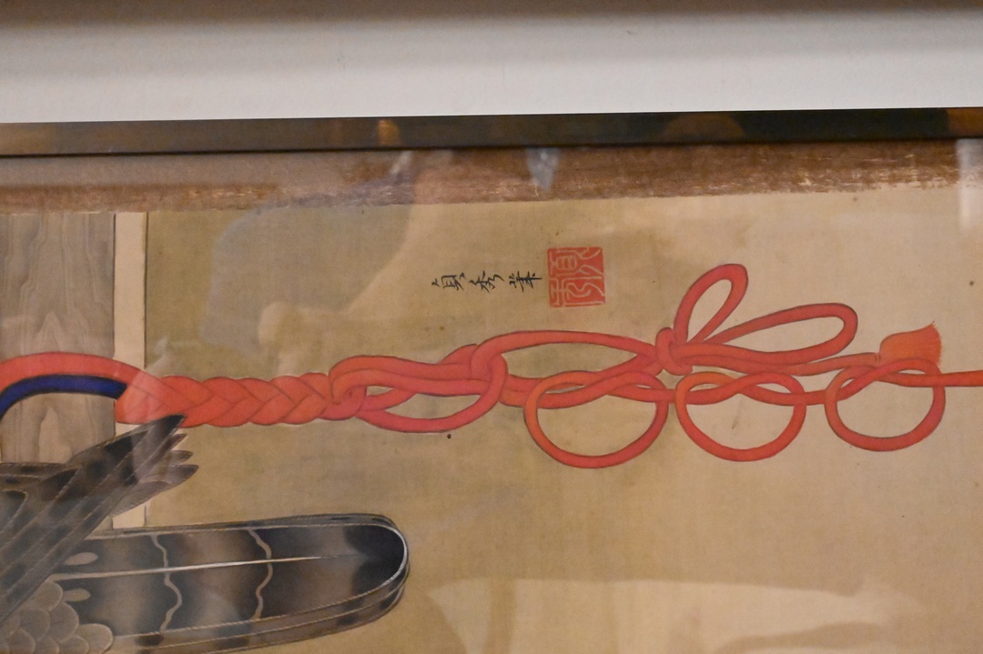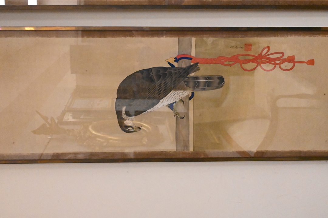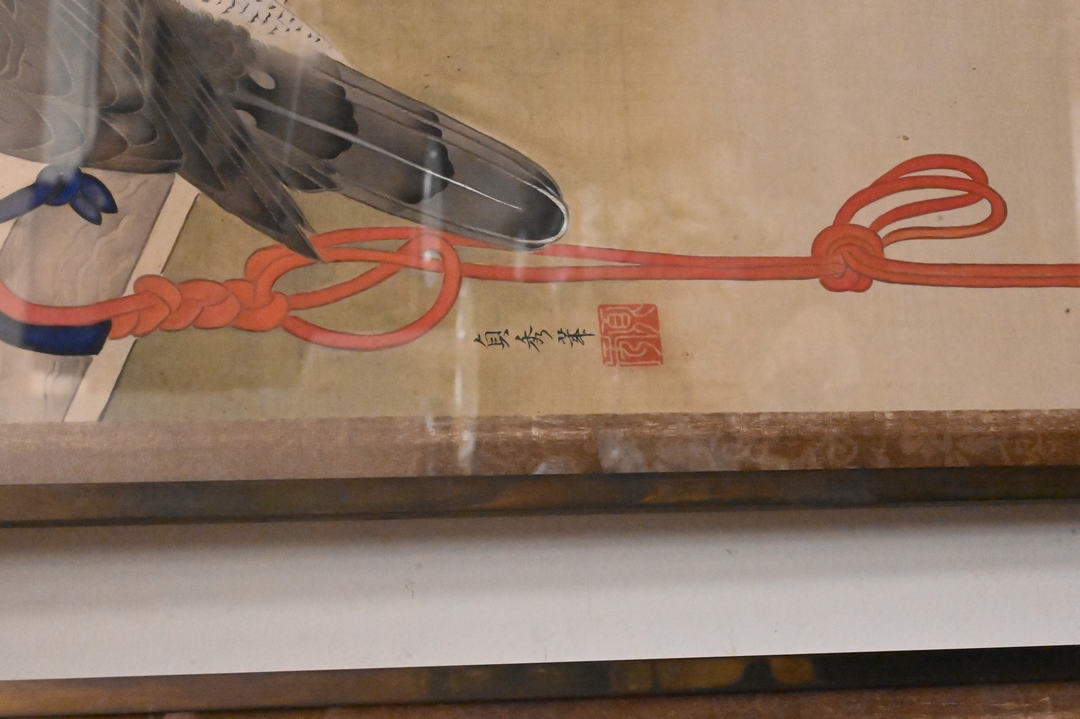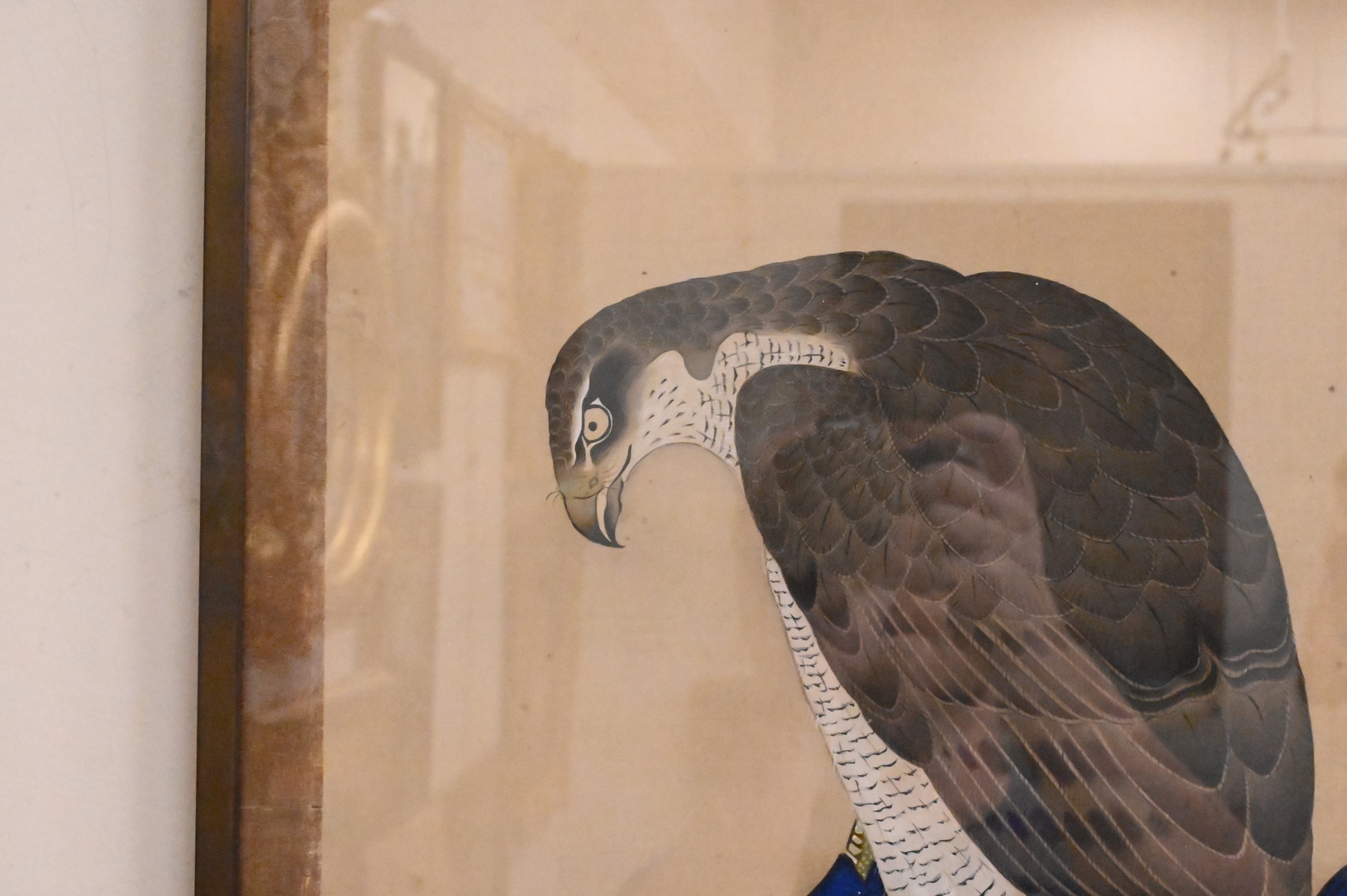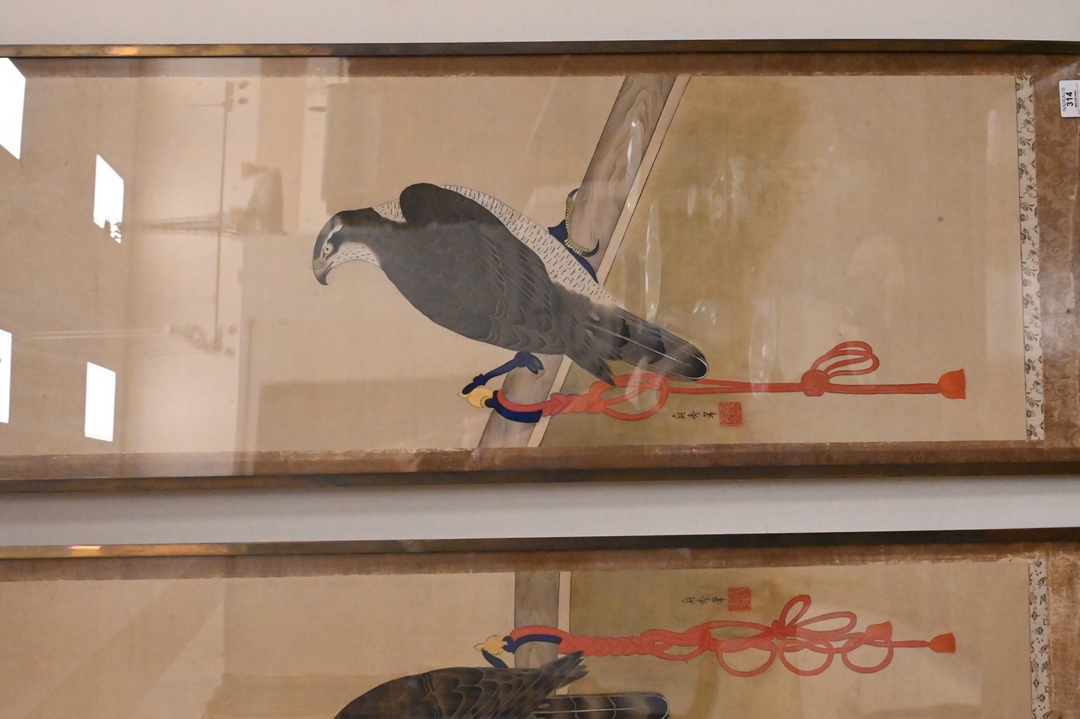 Pair of Chinese Paintings on Silk, ink and colors on silk, depicting two falcons perched on training rail, Kano School, 18th/19th century, scroll in brass frame, signed, image 44″ x 14 1/2″, Provenance: From Collection in Irvington, New York.