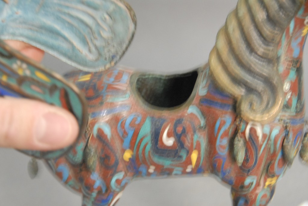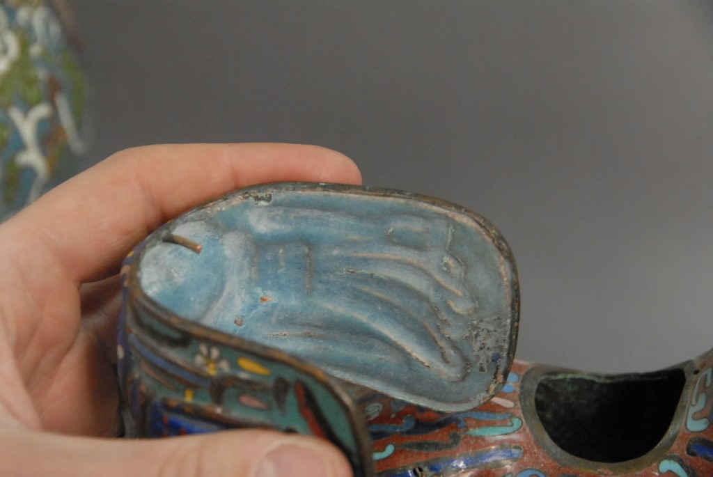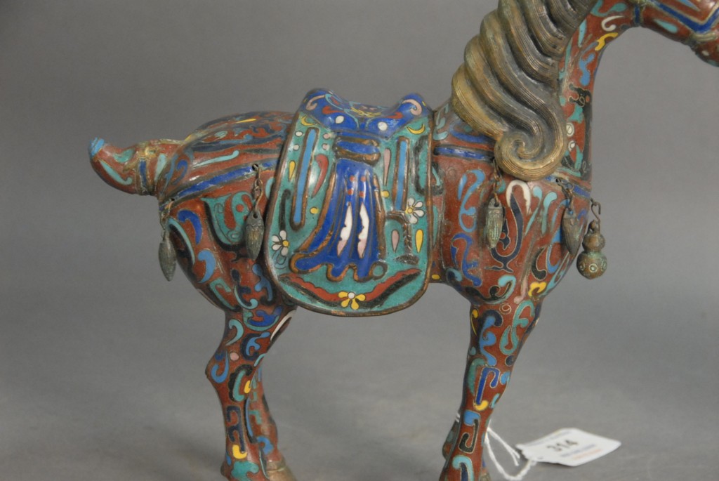 Pair of cloisonn horses with removable saddles and hair, ht 9 .