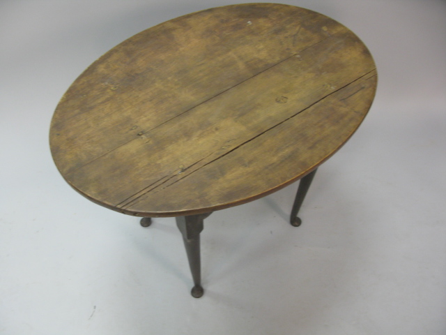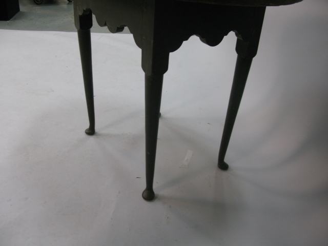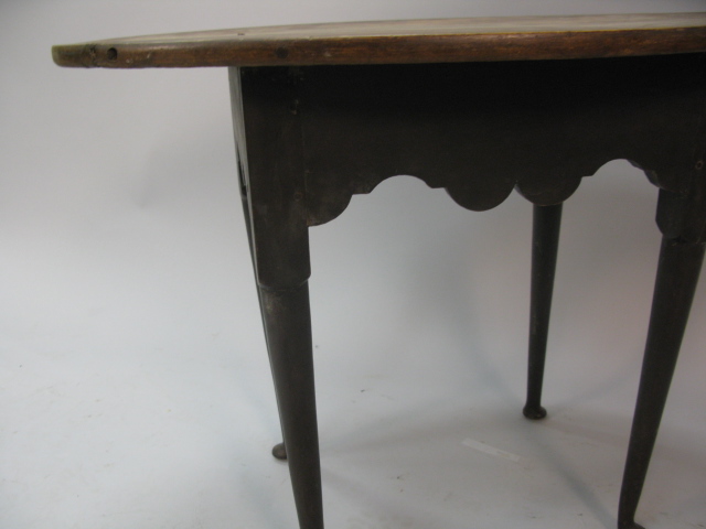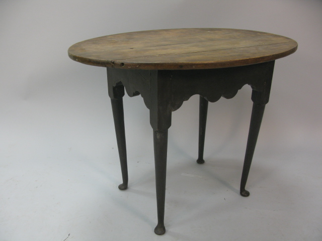 Queen Anne tavern table with oval top, scalloped apron, set on turned legs with pad feet.