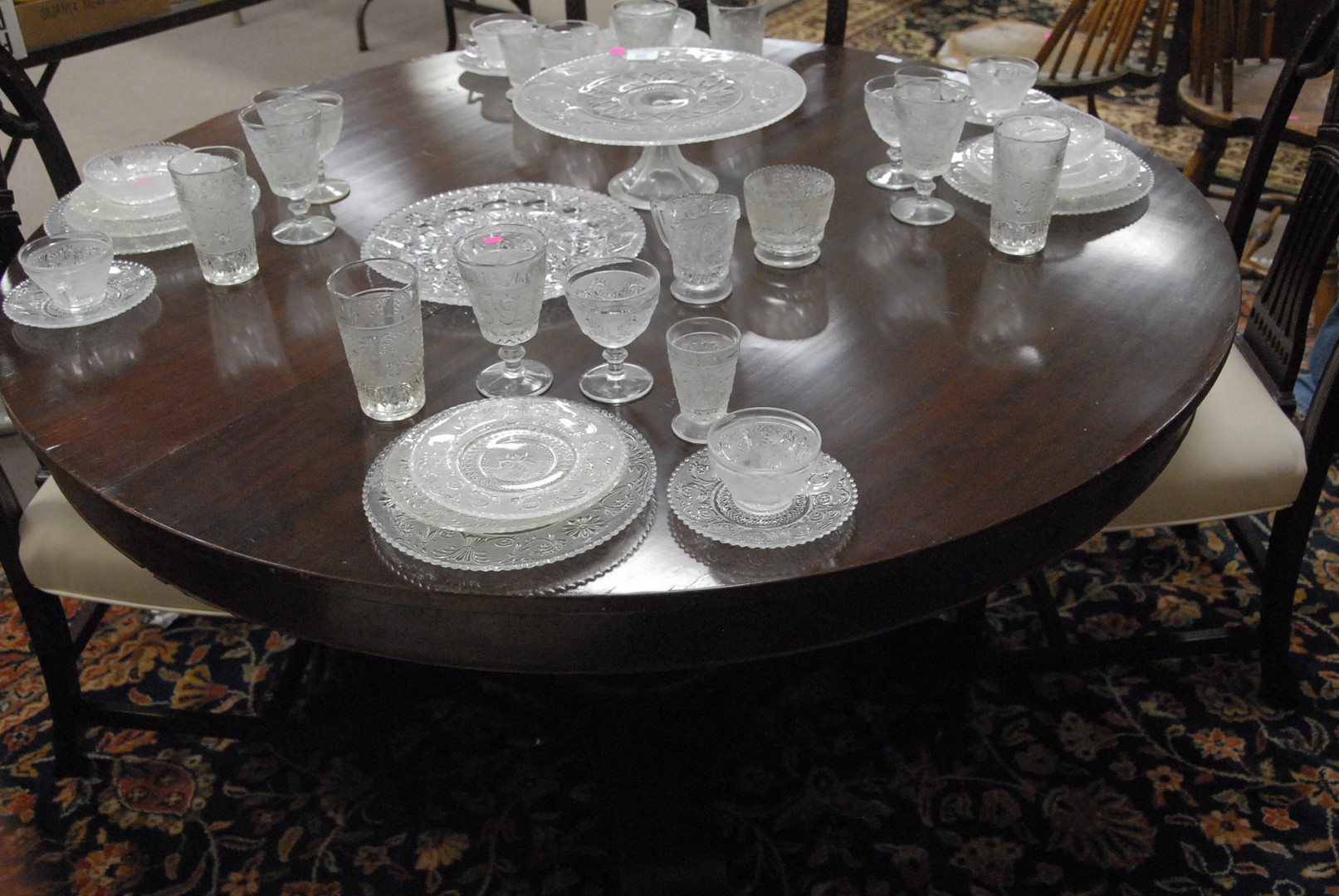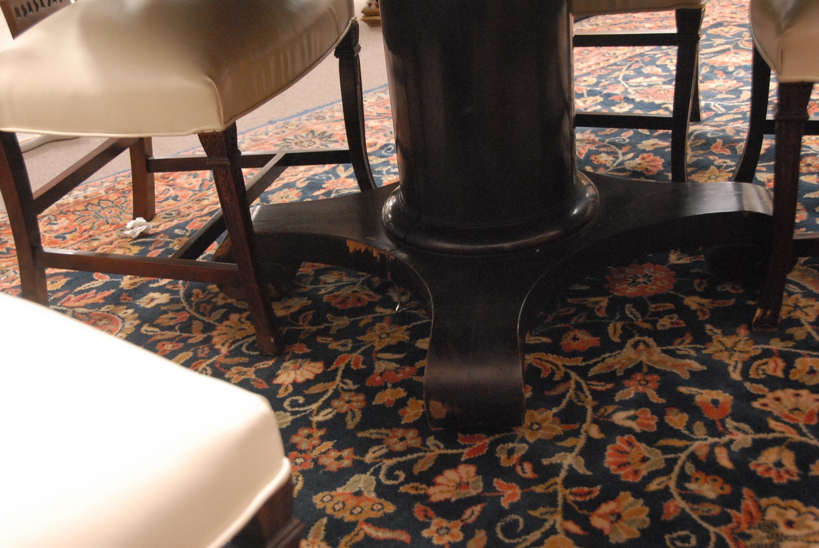 Round mahogany pedestal table with four leaves and custom pads. dia. 54 in. opens to 94 in.