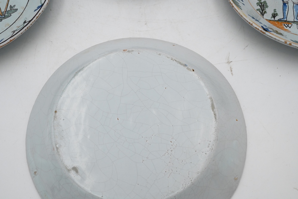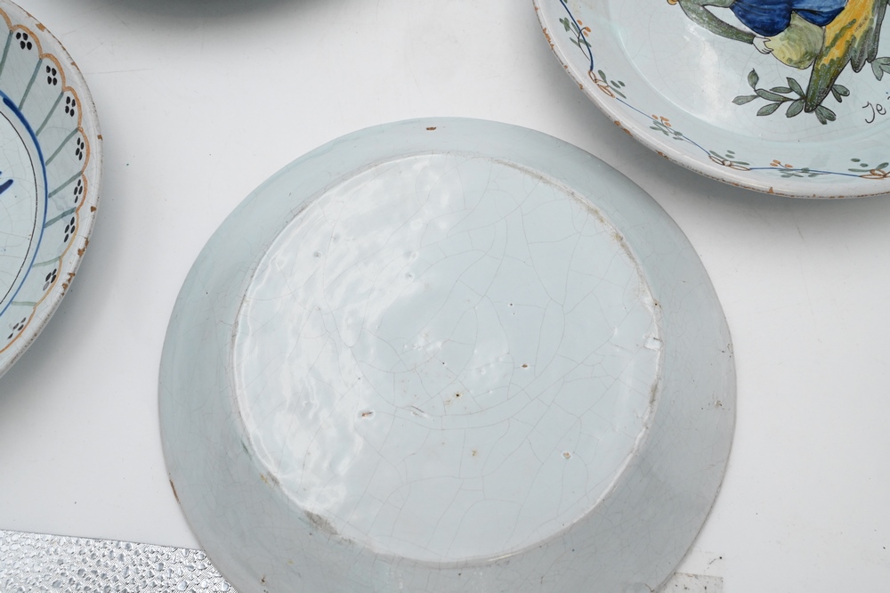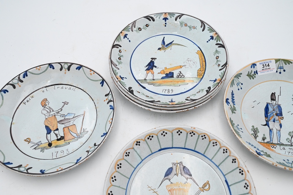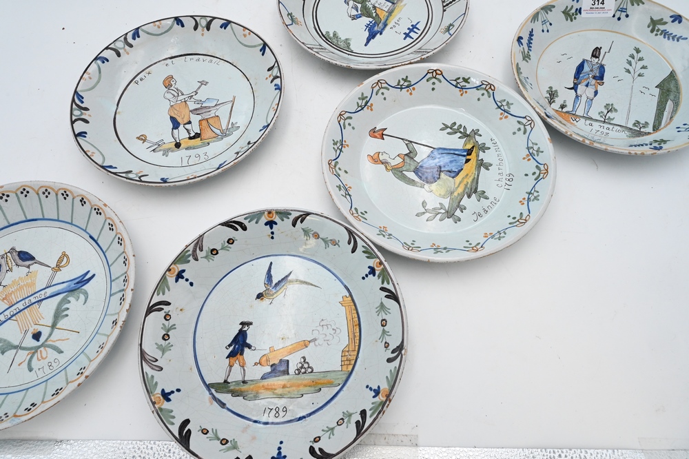 Set of Six French Faience Plates, having different painted scenes, to include winged figure and tombstone “Pagon”; “Jeanne Charbonnier, 1789”; soldier with cannon and bird, 1789 “Abondance 1789”; “Paix et Travail, 1793”; along with “La Nation, 1793”; diameter 9 inches.