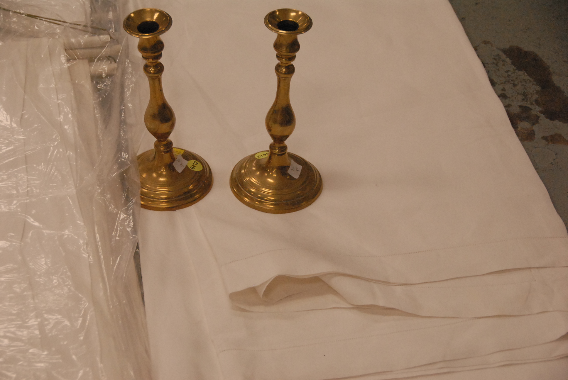 Seven piece lot six laundered table cloths and pair of brass candlesticks, ht. 9.