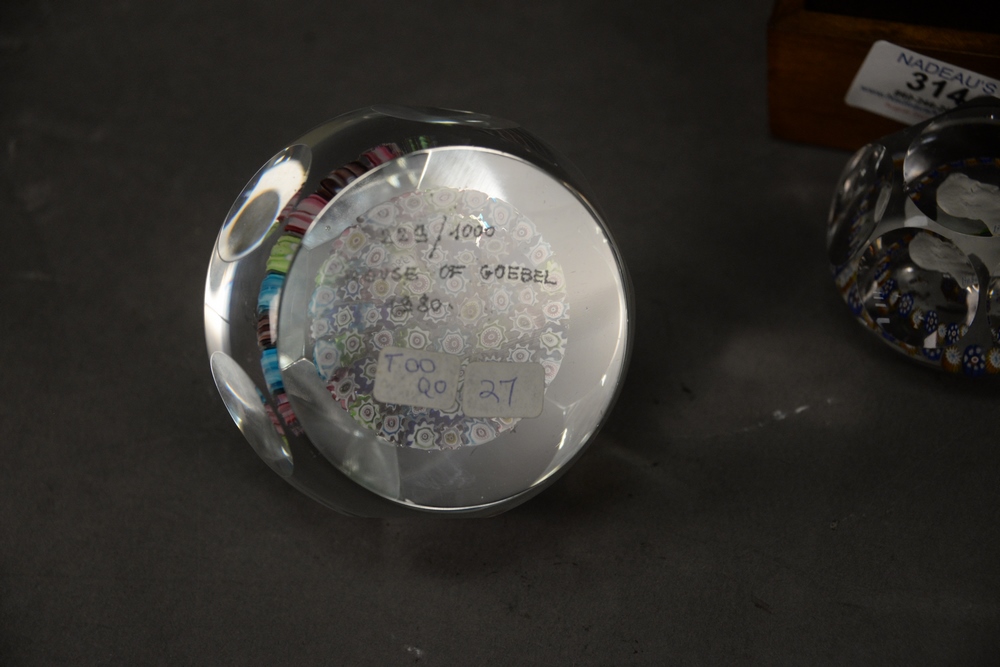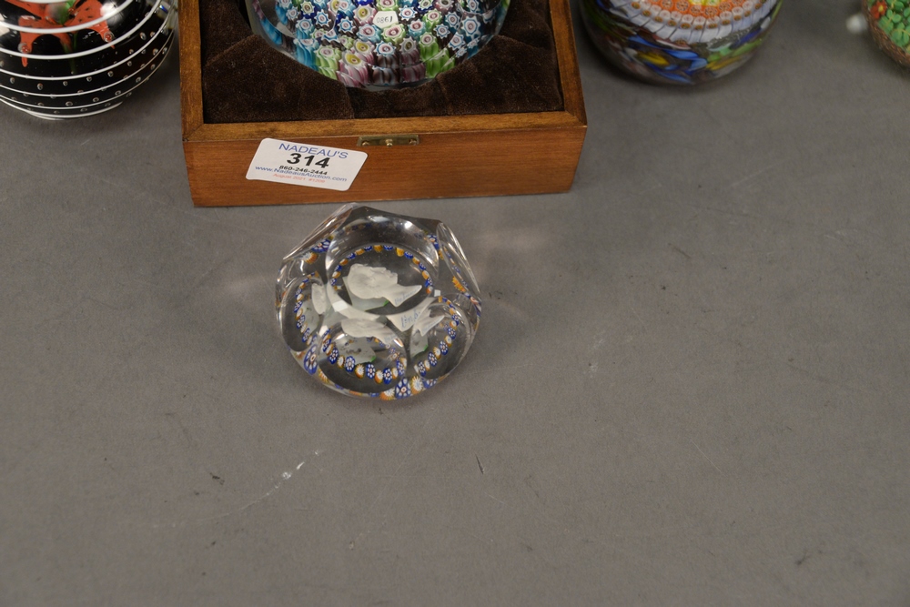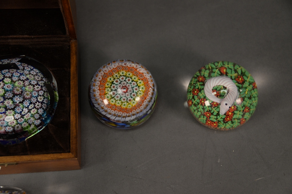 Six Glass Paperweights, to include a sulfide bust of Napoleon surrounded by yellow and blue Millefiori; red and green Millefiori having a snake in the center; a large house of Goebel Millefiori, marked 1980 inside; one having a red flower interior, signed indistinctly, along with two unmarked Millefiori, longest 3 3/4 inches. Provenance: Estate of James Wadhams.