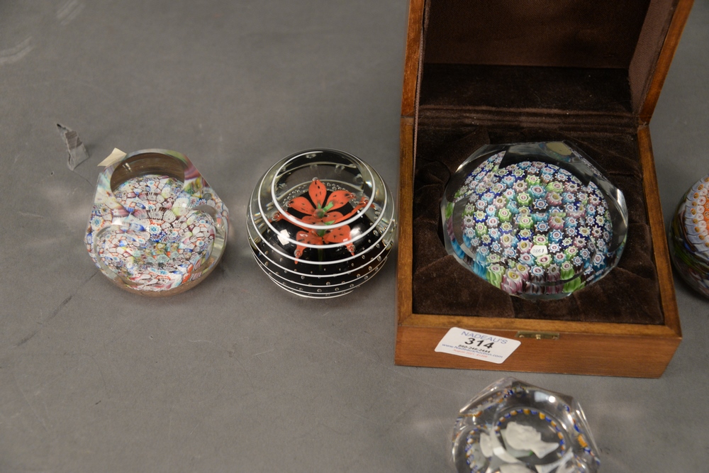 Lot 314: Six Glass Paperweights, to include a sulfide bust of Napoleon surrounded by yellow and blue Millefiori; red and green Millefiori hav…