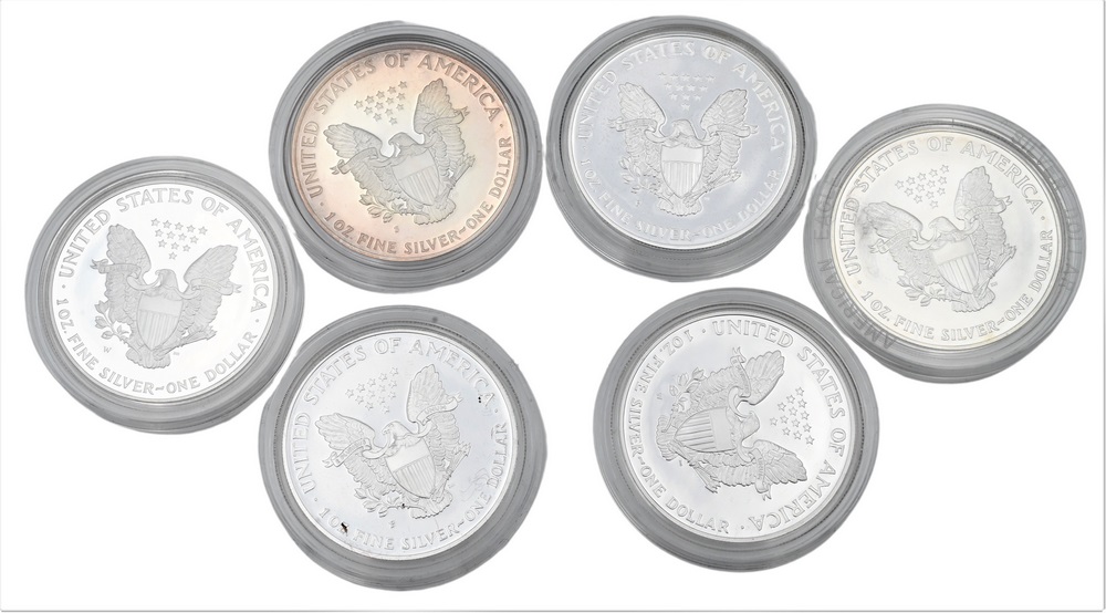 Six Silver Eagles, to include 1999 one dollar American Eagle proofs, 2000 one dollar proofs American silver Eagle, along with one dollar uncirculated American silver Eagle.