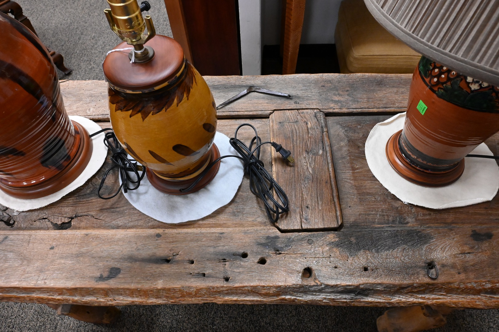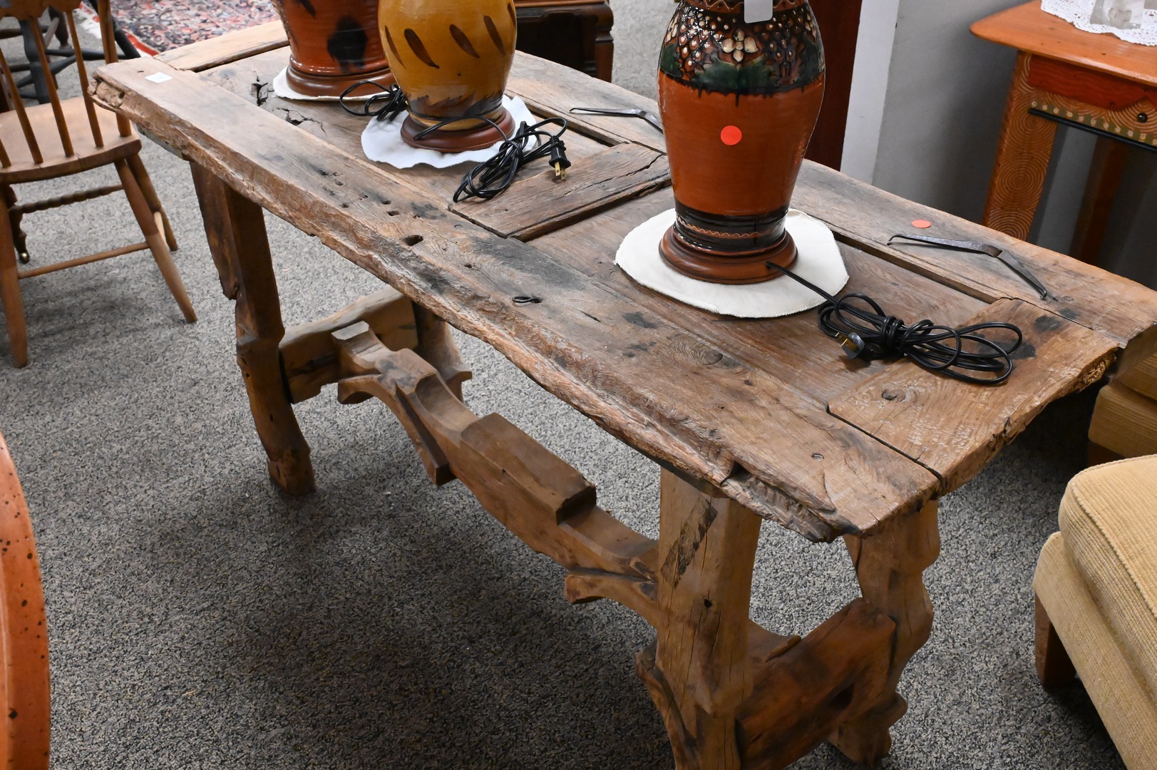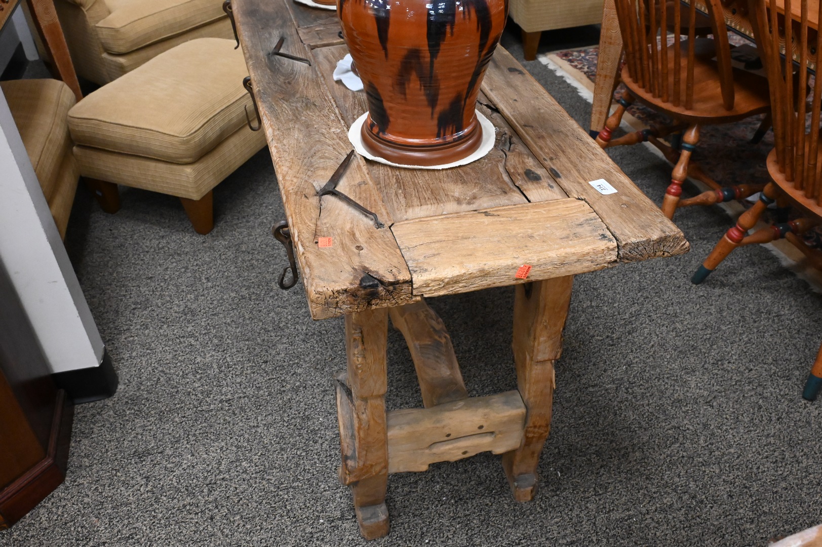 Table Made from 17th Century Door, having iron hardware, height 30 inches, top 20″ x 58″. Provenance: Estate of Peter Tillou, Litchfield, Connecticut.