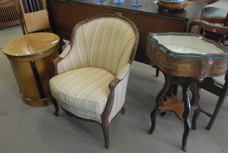 Three piece lot to include Louis XVI style fauteuil, Louis XVI style curio table, and Baker round table.