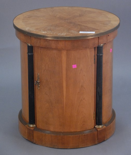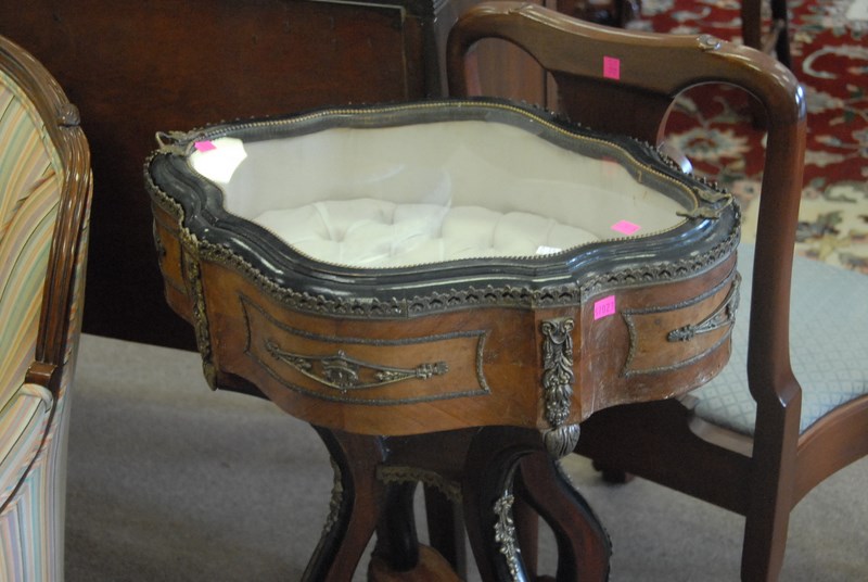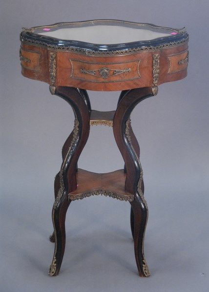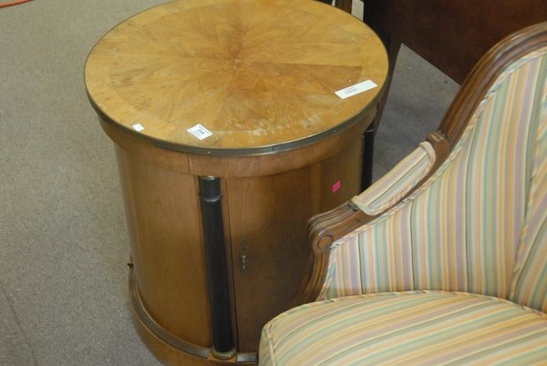 Lot 314: Three piece lot to include Louis XVI style fauteuil, Louis XVI style curio table, and Baker round table.