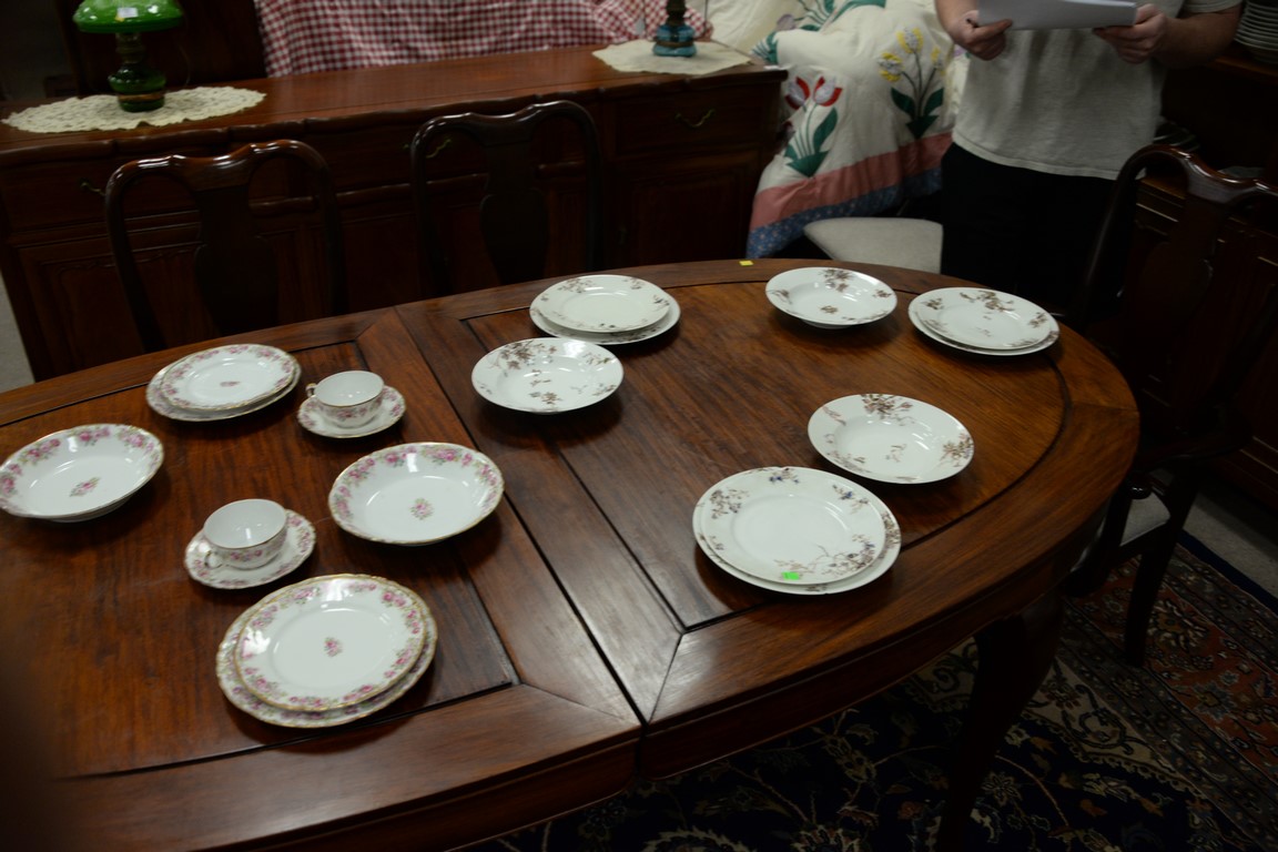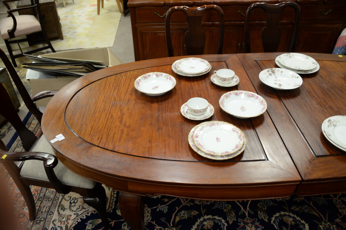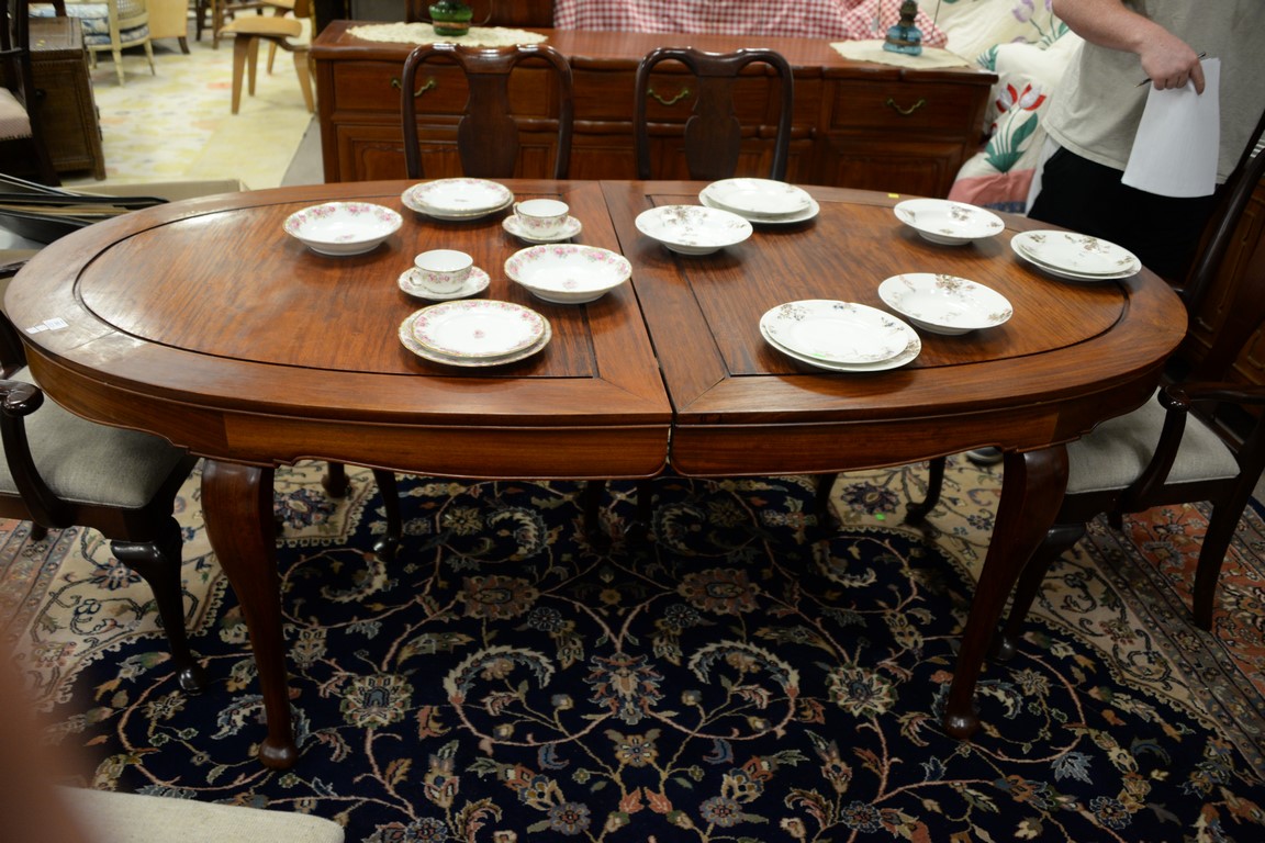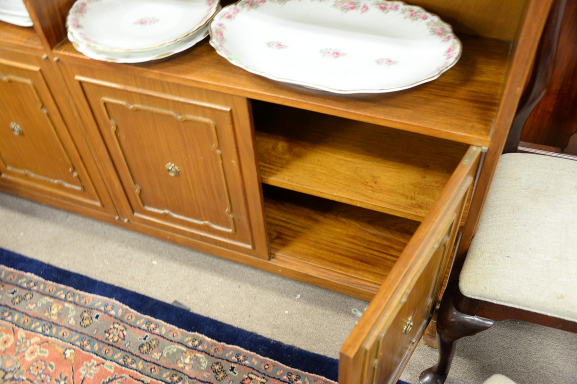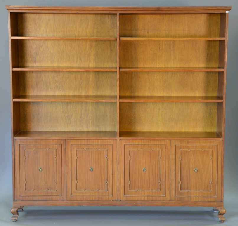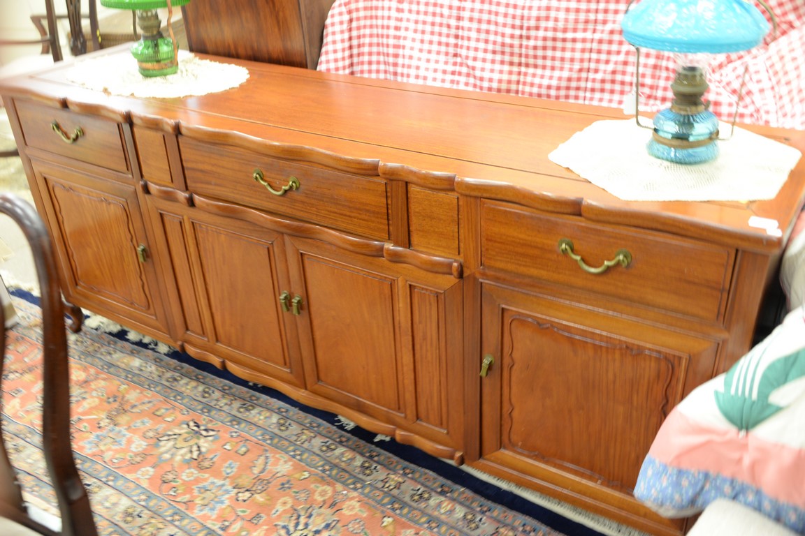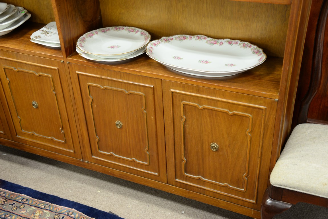 Three piece teak lot including dining table with one leaf, credenza, and large bookcase.