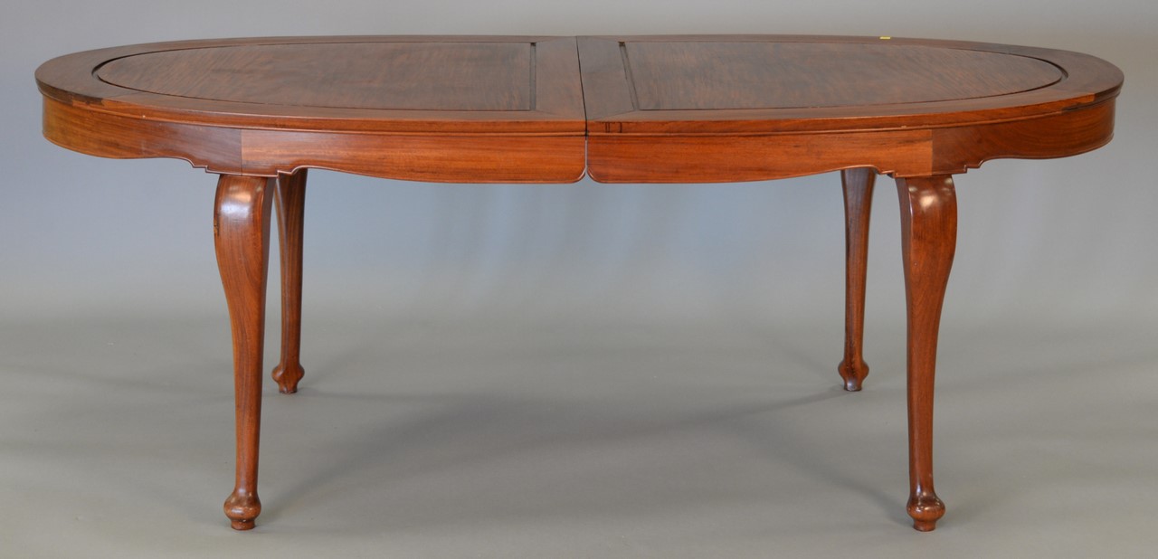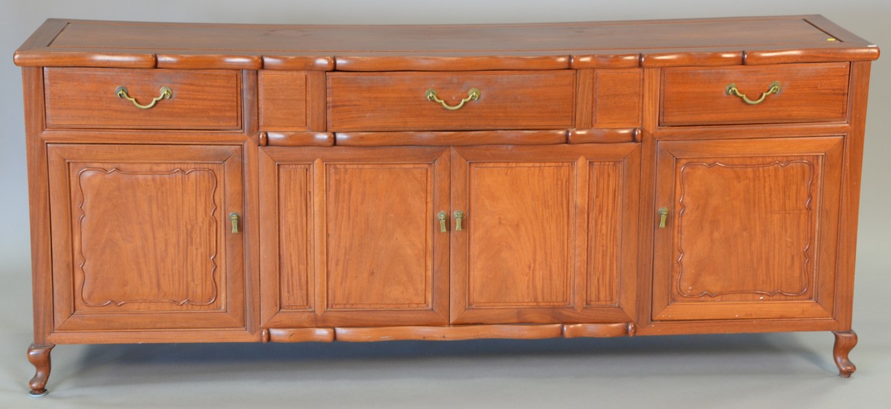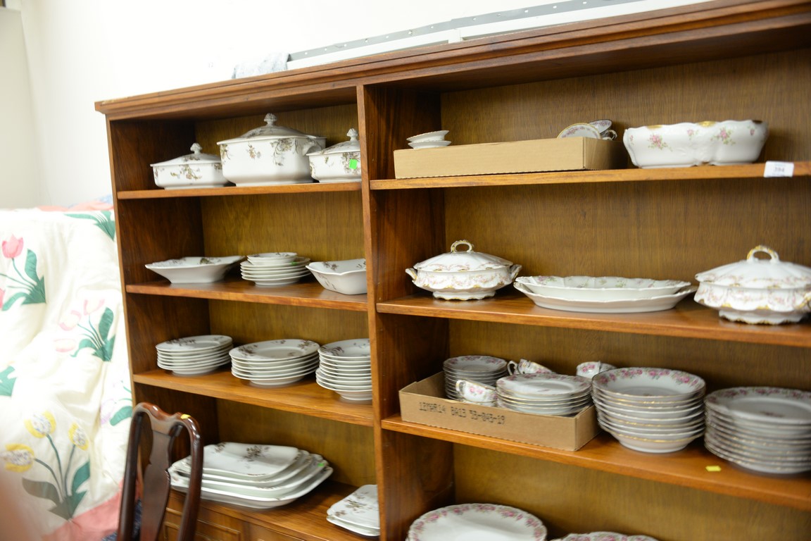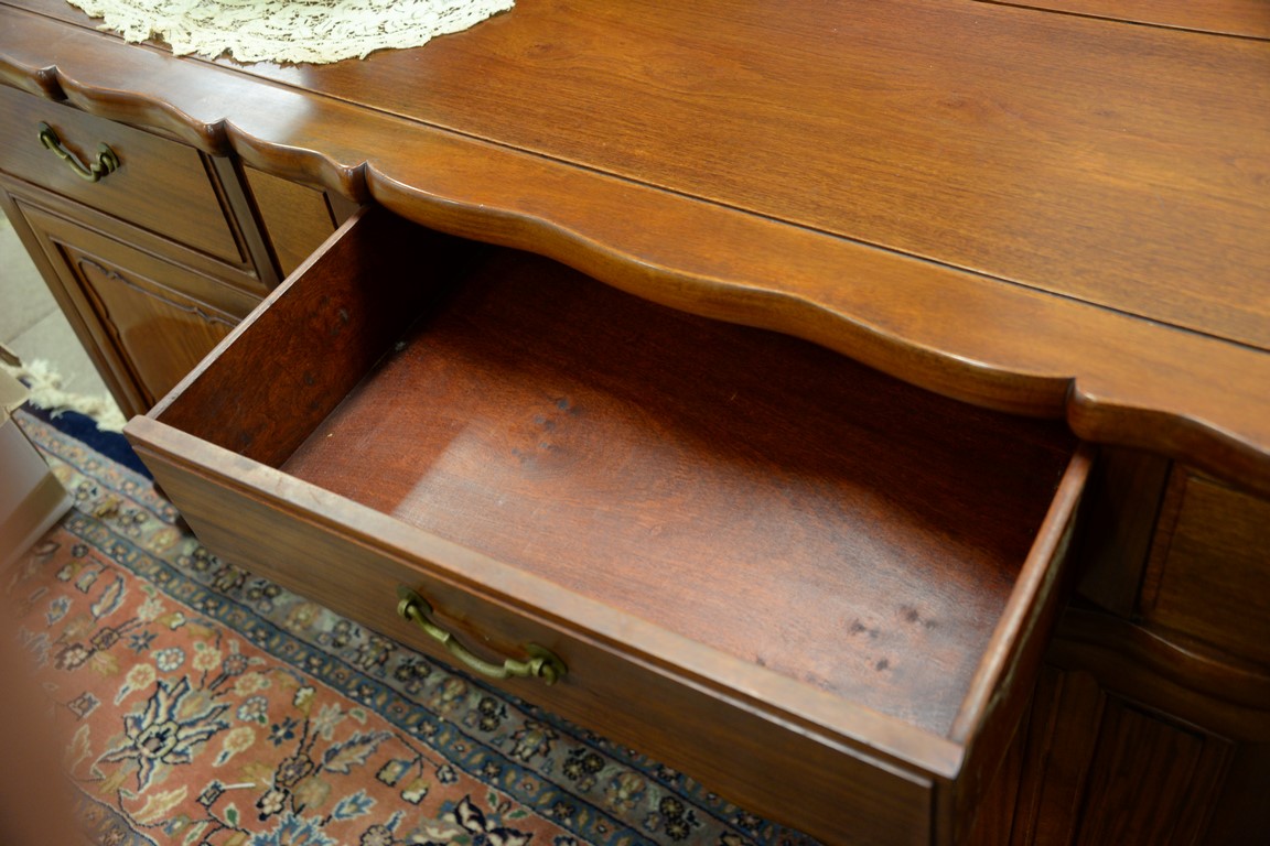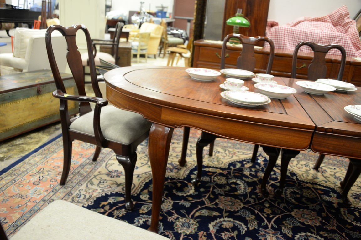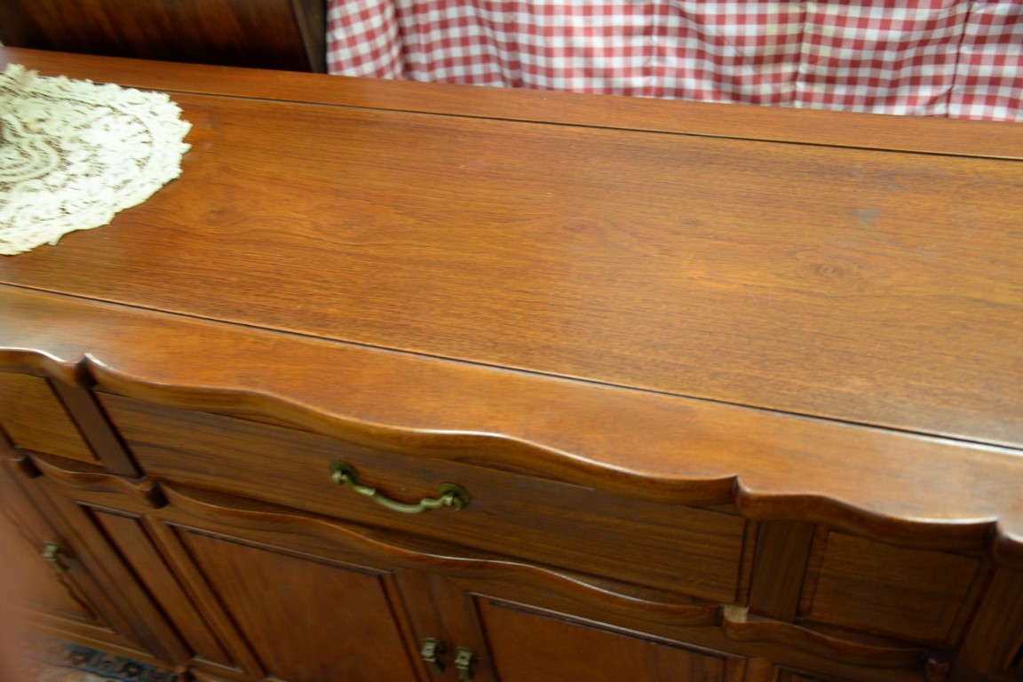 Three piece teak lot including dining table with one leaf, credenza, and large bookcase.