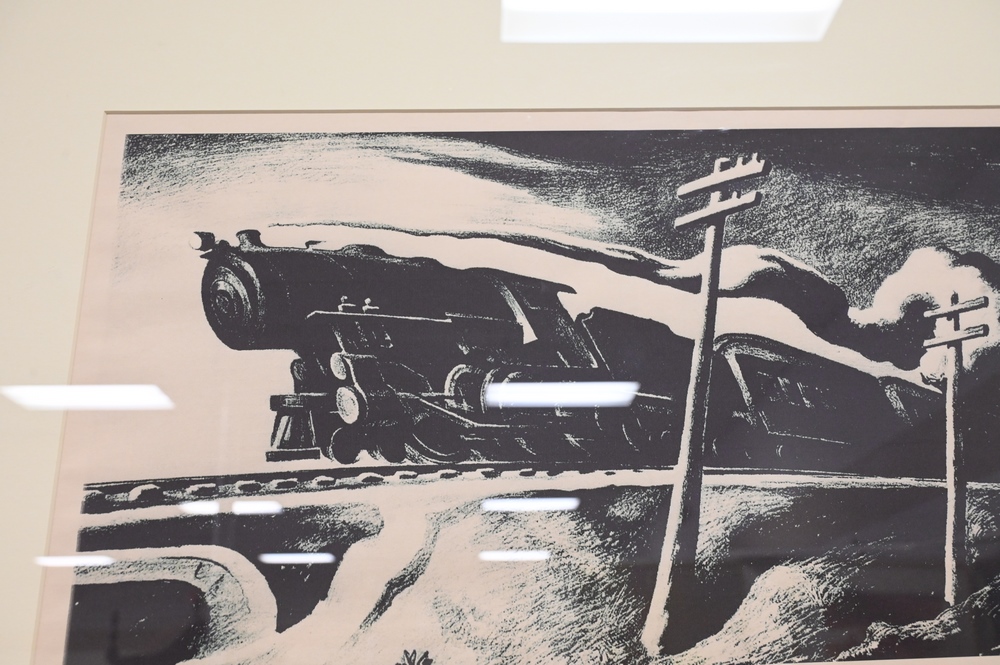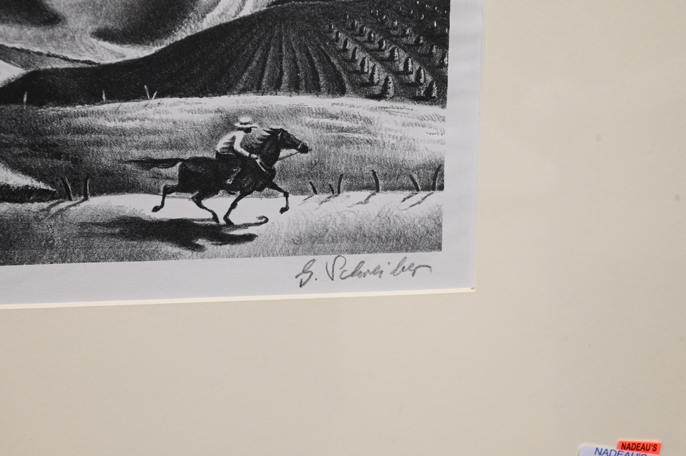 Two Framed Pieces, to include Georges Schreiber “Racing the Storm”, lithograph, pencil signed; along with a print after Thomas Benton, Going West; 10 3/4″ x 14 1/2″; 13 1/4″ x 24 1/2″.